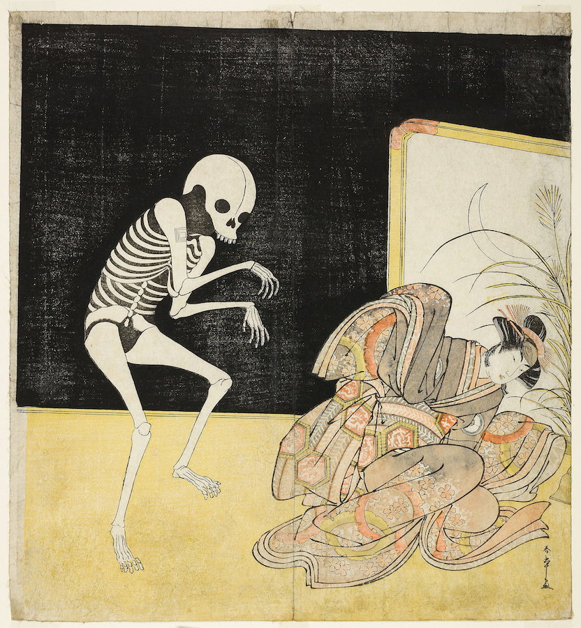 The actors Ichikawa Danjuro V as a skeleton, spirit of the renegade monk Seigen (left), and Iwai Hanshiro IV as Princess Sakura (right), in the joruri "Sono Omokage Matsu ni Sakura (Vestiges of Pine and Cherry)," from part two of the play "Edo no Hana Mimasu Soga (Flower of Edo: An Ichikawa Soga)," performed at the Nakamura Theater in 1783.