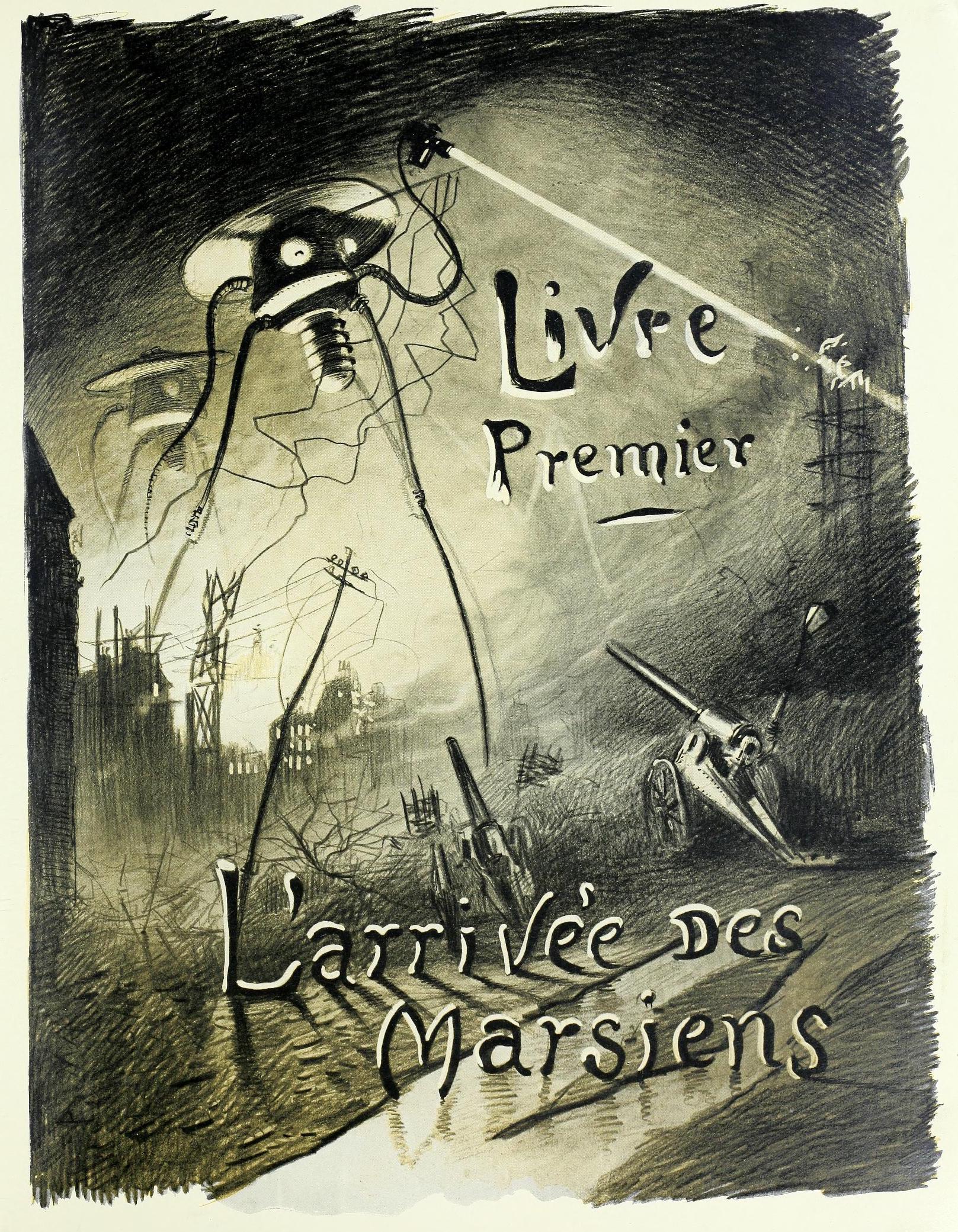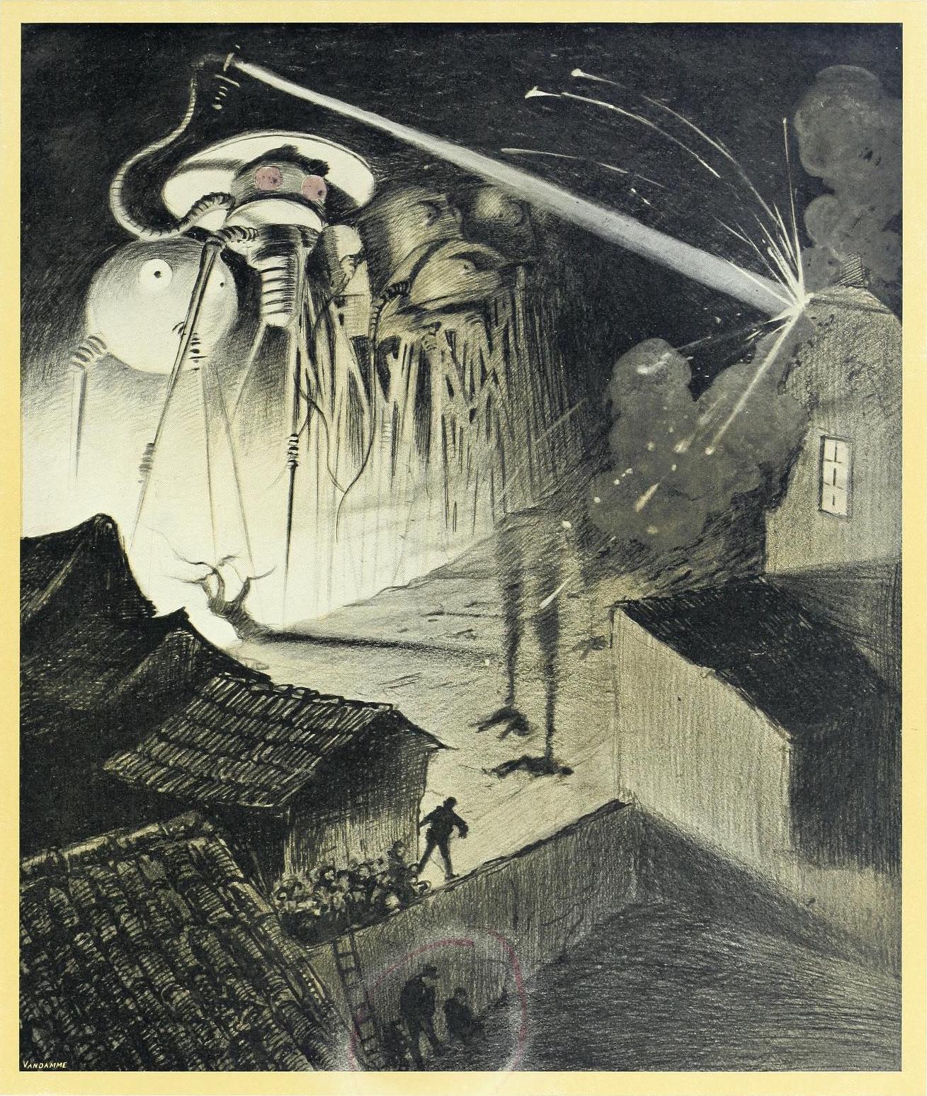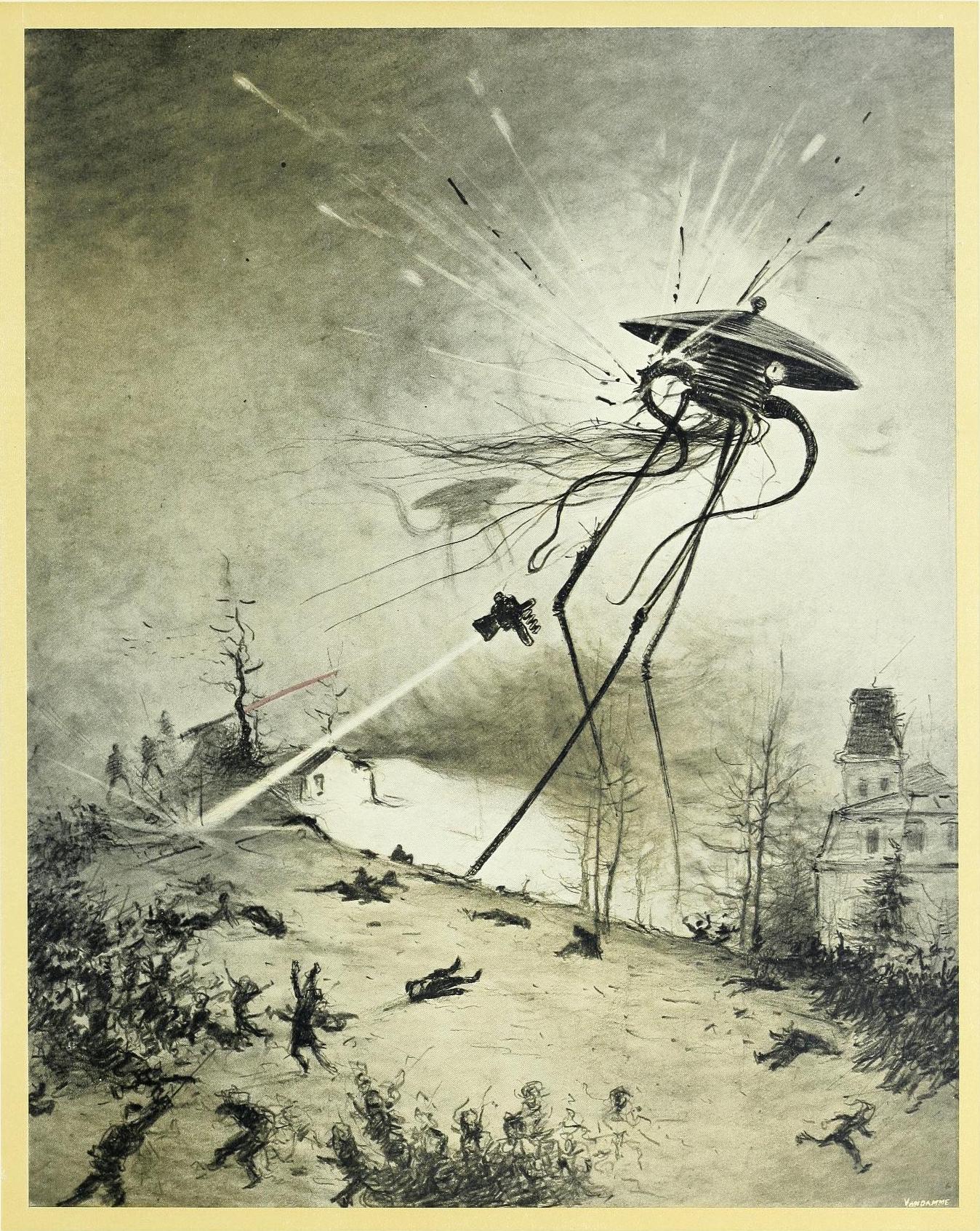 H. G. Wells’ The War of the Worlds was first published in 1897 with illustrations by the British artist Warwick Goble. These were inky, black-and-white depictions of Wells’ story of a Martian invasion — eerie, imaginative, exciting, and thoroughly of their late Victorian time.