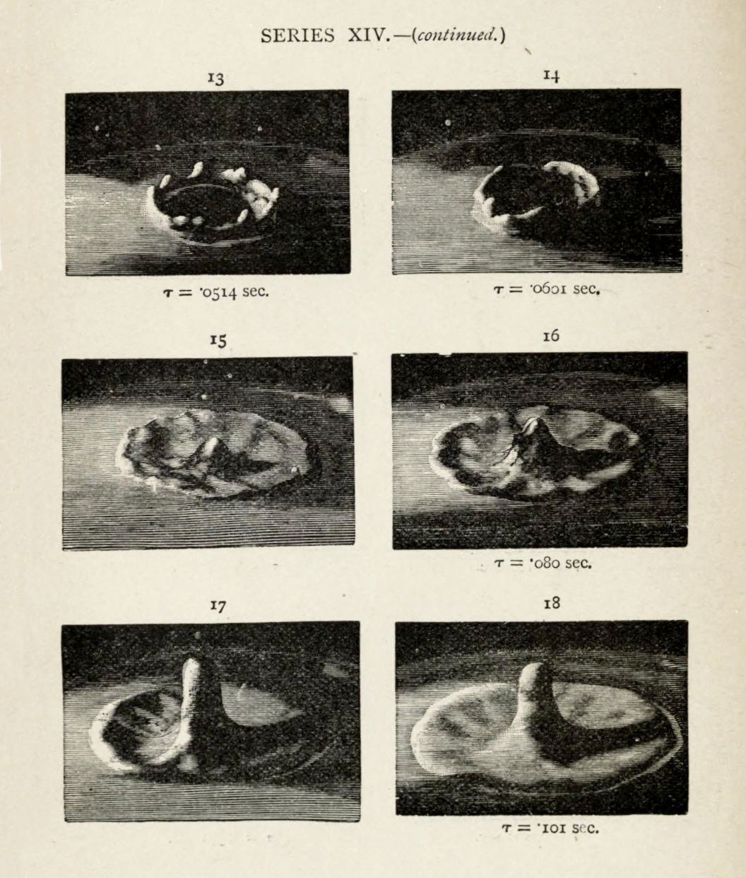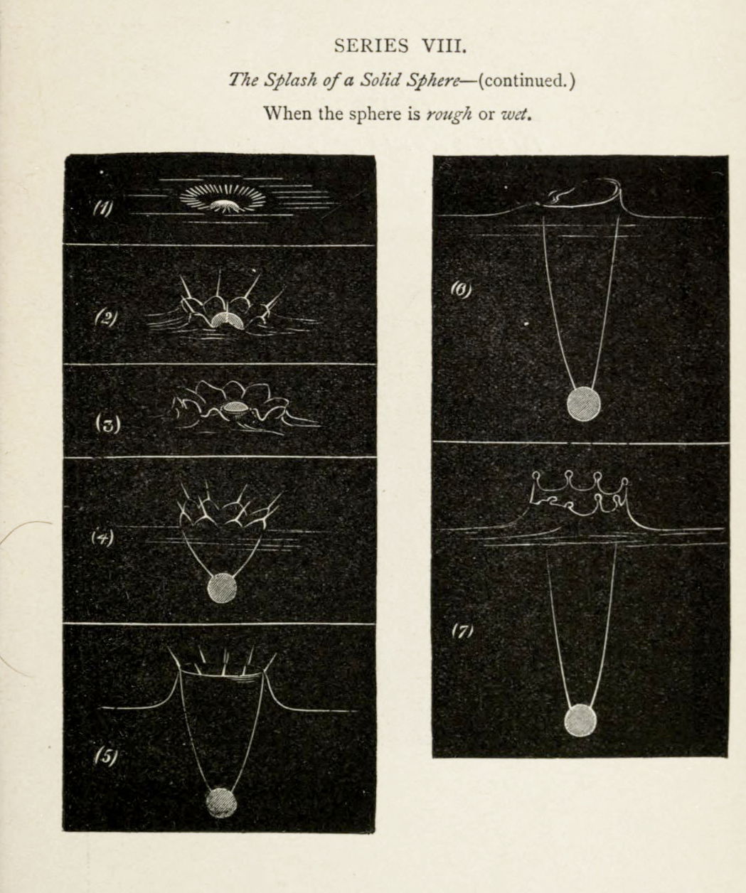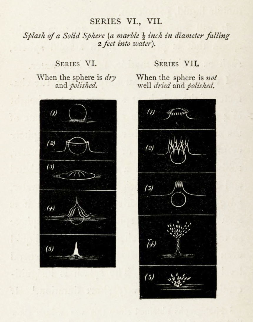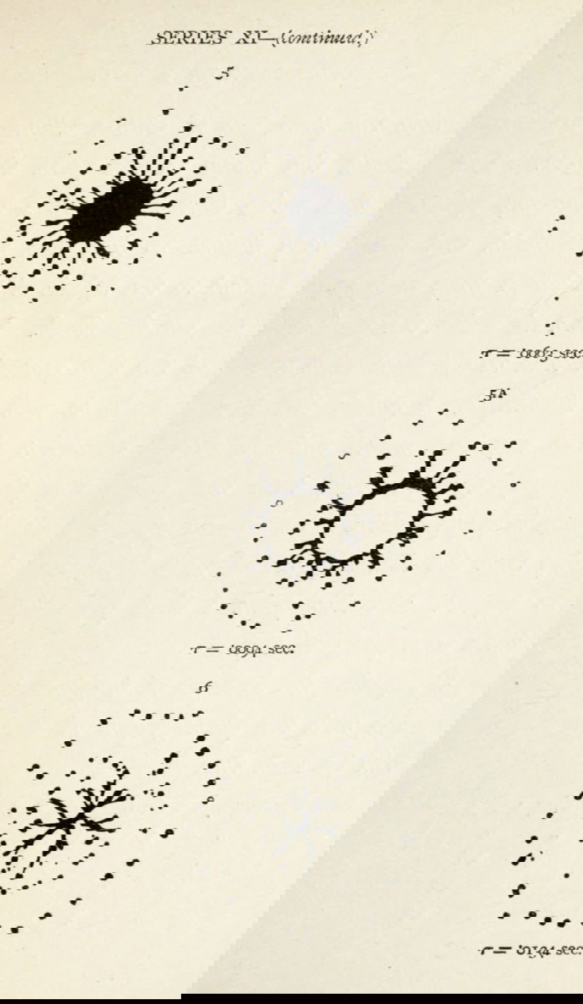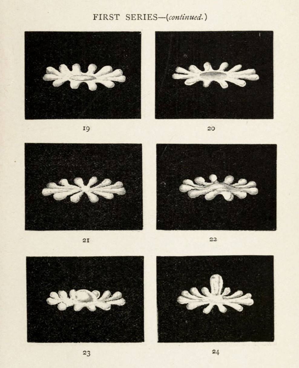 The transcript of a “Discourse” given at the Royal Institution of Great Britain in 1894, this short text is a delightful study of the physics and aesthetics of splashing drops — phenomena familiar to “any drinker of afternoon tea”. Crediting a “school-boy at Rugby” with making the initial observation “some twenty years ago”, A. M. Worthington describes how fallen drops of mercury, alcohol, and water may appear to be “lying unbroken” but have actually taken part in “violent exercise”, the traces of which can be glimpsed on opaque glass. Examining these traces, which he calls “footprints of the dance”, leads the scientist to wonderfully minute ends: