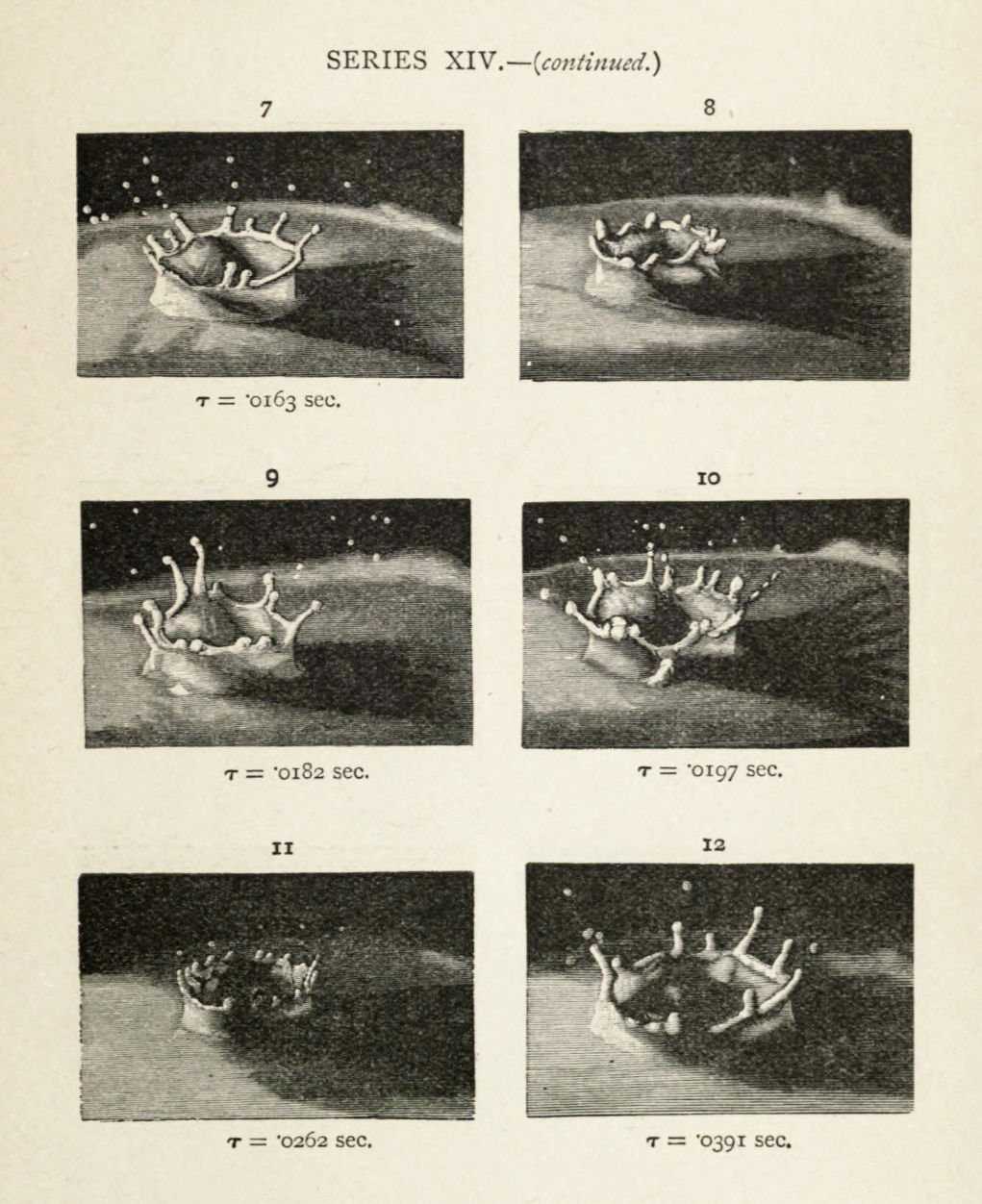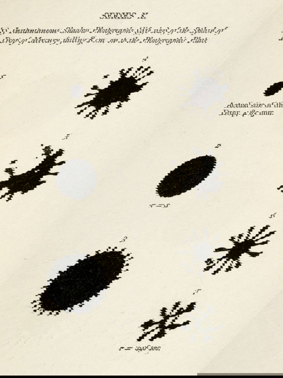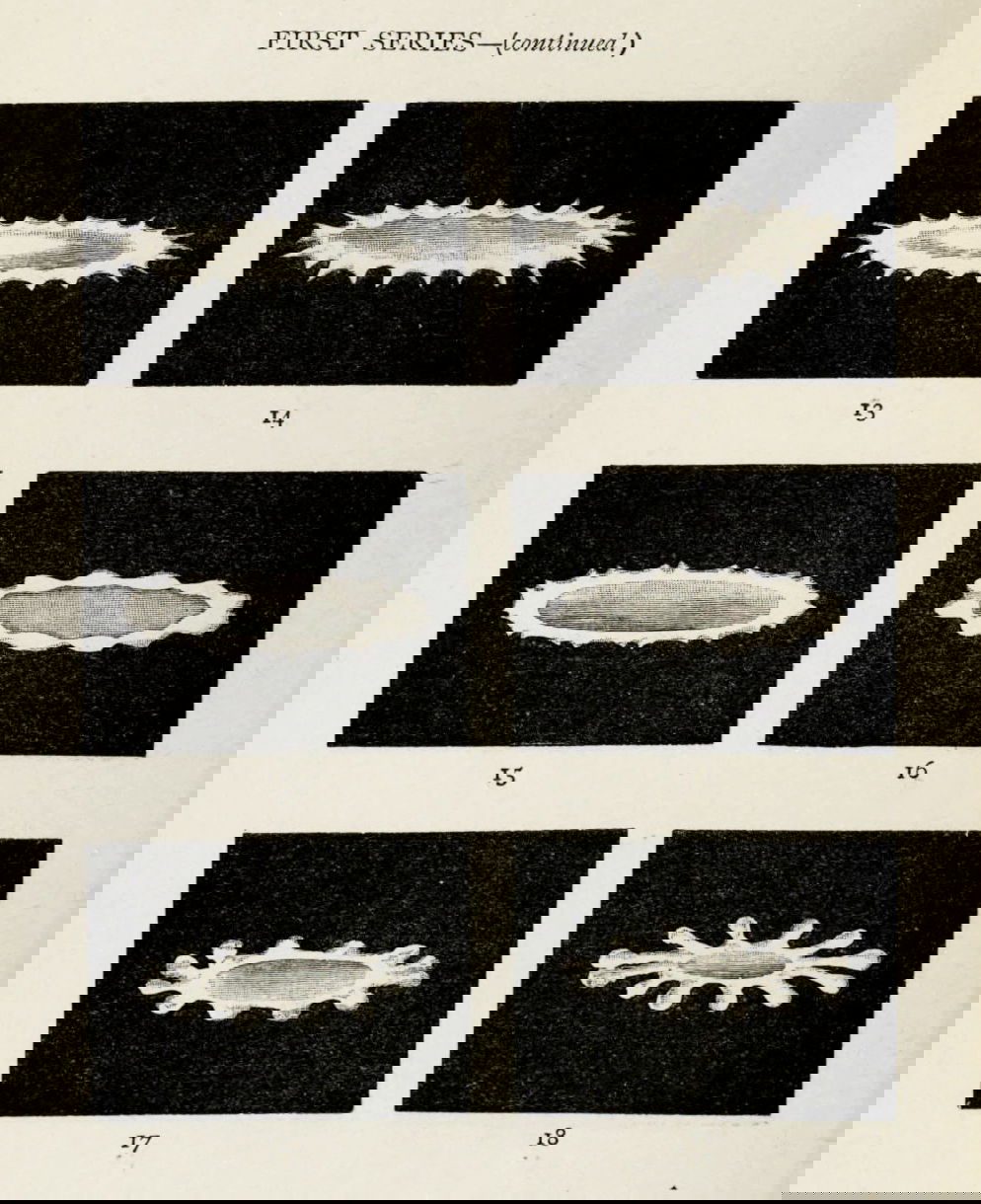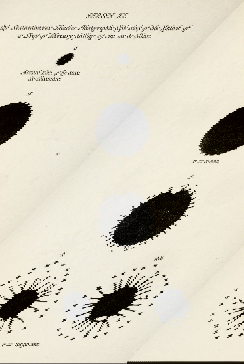 The transcript of a “Discourse” given at the Royal Institution of Great Britain in 1894, this short text is a delightful study of the physics and aesthetics of splashing drops — phenomena familiar to “any drinker of afternoon tea”. Crediting a “school-boy at Rugby” with making the initial observation “some twenty years ago”, A. M. Worthington describes how fallen drops of mercury, alcohol, and water may appear to be “lying unbroken” but have actually taken part in “violent exercise”, the traces of which can be glimpsed on opaque glass. Examining these traces, which he calls “footprints of the dance”, leads the scientist to wonderfully minute ends: