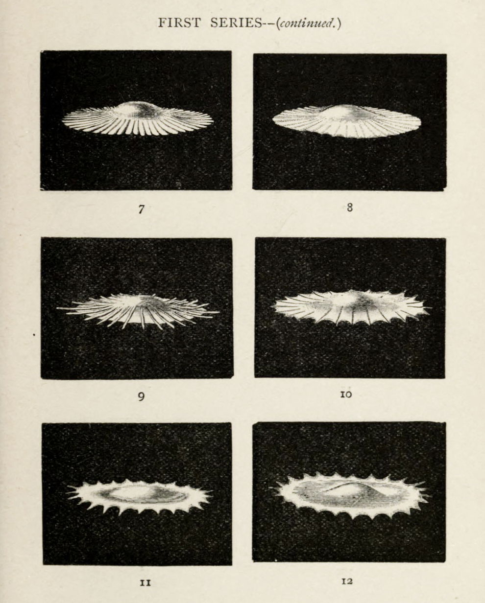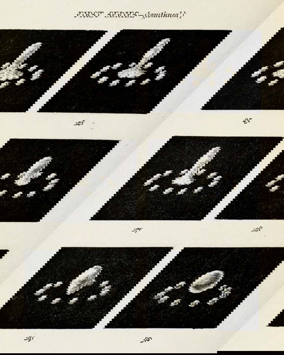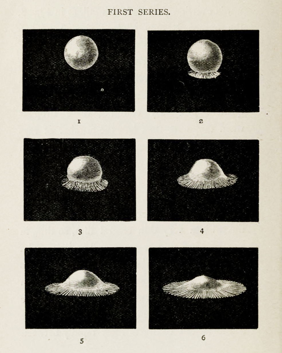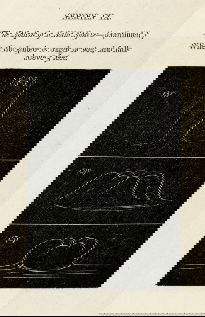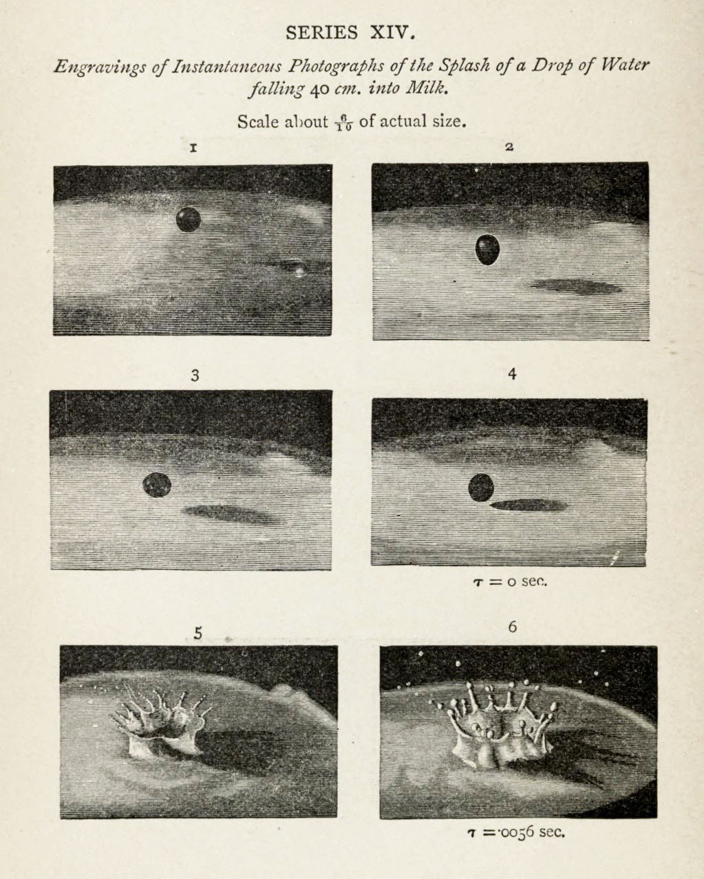 The transcript of a “Discourse” given at the Royal Institution of Great Britain in 1894, this short text is a delightful study of the physics and aesthetics of splashing drops — phenomena familiar to “any drinker of afternoon tea”. Crediting a “school-boy at Rugby” with making the initial observation “some twenty years ago”, A. M. Worthington describes how fallen drops of mercury, alcohol, and water may appear to be “lying unbroken” but have actually taken part in “violent exercise”, the traces of which can be glimpsed on opaque glass. Examining these traces, which he calls “footprints of the dance”, leads the scientist to wonderfully minute ends: