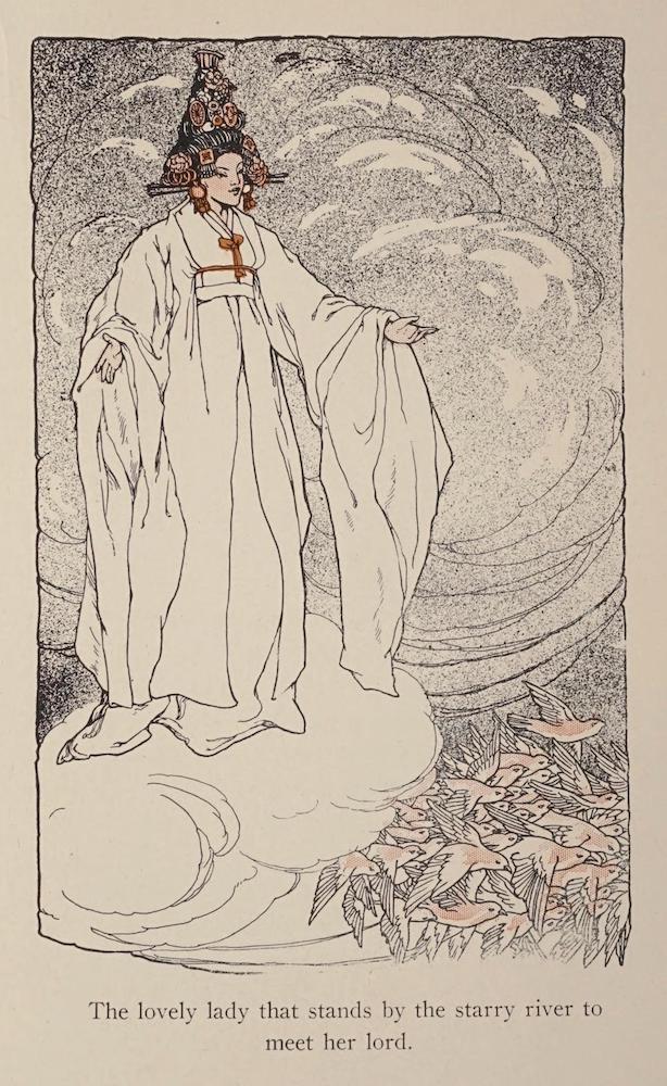 Many of the Korean fairy tales told by William Elliot Griffis begin rather pedagogically. “Korea is the land of beautiful scenery and lovely flowers”, begins “The King of Flowers”. “No bird is more common in Korea than the magpie”, we are told at the outset of “The Sky Bridge of Birds”. Yet Griffis has a talent for transitioning quickly from these educational openings to quite striking narratives shot through with images that are hard to forget. Here, for example, is how “The Sky Bridge of Birds” continues: