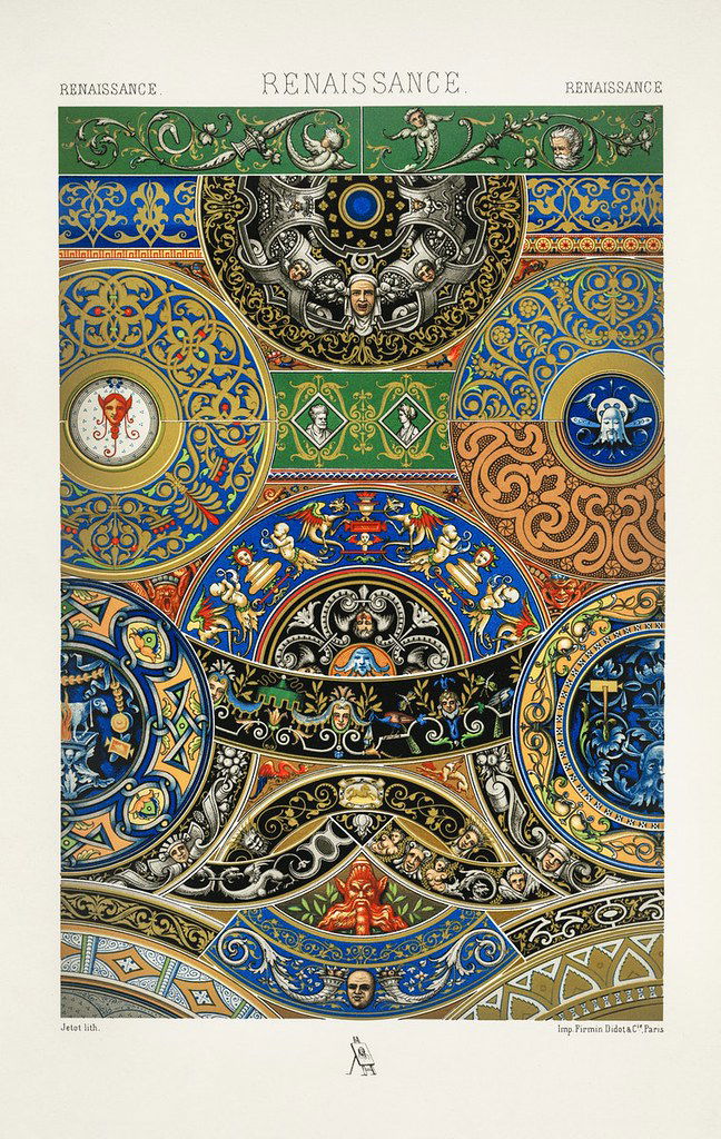 Albert-Charles-Auguste Racinet (1825–1893), himself an accomplished artist, is best known today for publishing two major pictorial works on the history of design — Le costume historique and L'Ornement polychrome — while engraver and artistic director at the Parisian publisher Firmin Didot et Cie. Published in ten instalments between 1869 and 1873, the first iteration of L'Ornement polychrome (Colour ornament) is a visual record in 100 plates of the decorative arts from antiquity to the eighteenth century. The work was such a huge success that in 1885–7 Racinet brought out a second series, this time of 120 plates, and updated to include designs of the nineteenth century as well. The imagery presented in both series is drawn from a wide array of various mediums, including woodwork,…
