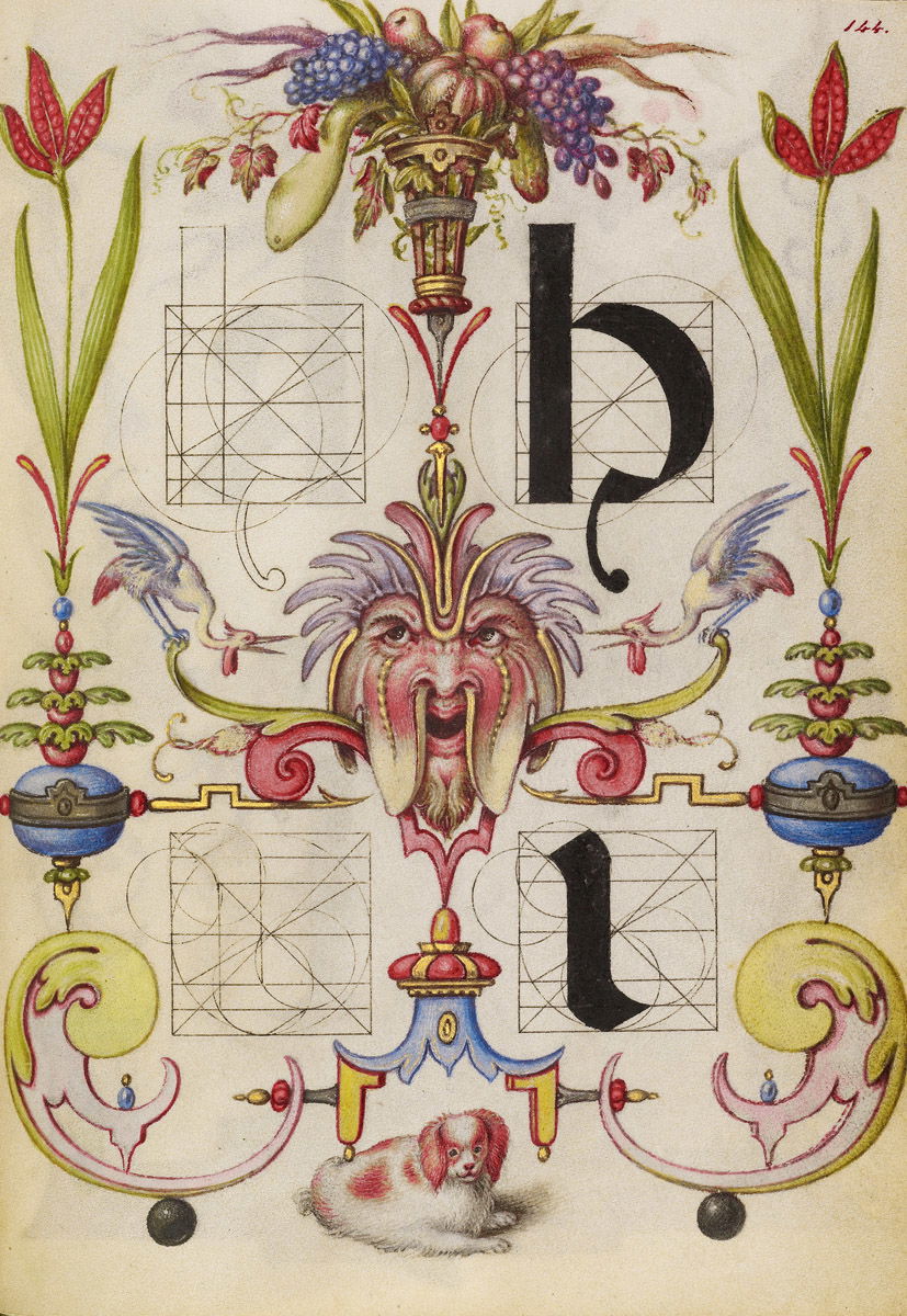 Joris Hoefnagel (1542 - 1601) was a pivotal figure in the history of Dutch art, playing an important role both in the latter stages of the Flemish illumination tradition and the birth of the new genre of still life. In the last decade of his life Hoefnagel was appointed court artist to Holy Roman Emperor Rudolf II, and it was in this time that he appended Georg Bocskay's Model Book of Calligraphy, of thirty years previous, with his own beautifully exquisite "Guide to the Construction of Letters", examples from which are shown below. In each he surrounds the typographic diagram with a colourful array of symbolically charged motifs and, for some, an excerpt from the Bible which begins with the letter of focus.