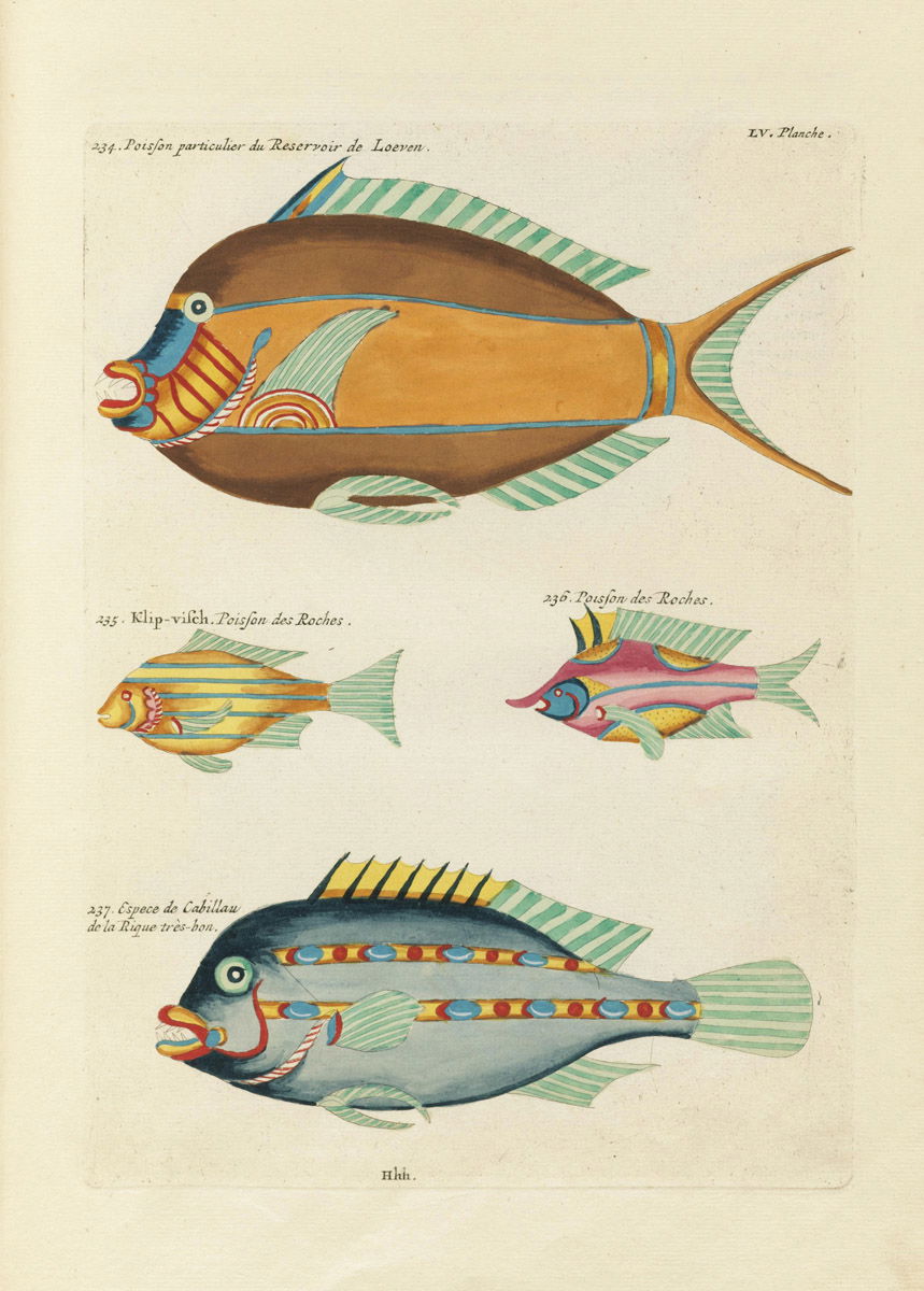 Originally published in 1719, with a second edition in 1754, Poissons, Ecrevisses et Crabes can lay claim to being the earliest known publication in colour on fish, in this case, celebrating those hailing from the waters of the East Indies. This wonderful book is the creation of Louis Renard, a publisher, bookseller and spy for the British Crown. All in all, across the two volumes, the book contains 100 plates bearing 460 hand-coloured engravings, a total of 415 fishes, 41 crustaceans, two stick insects, a dugong and, in a final foldout, a solitary mermaid. The engravings were supposedly based on drawings from life by the artist Samuel Fallours (active 1703 - 1720). Produced in two volumes, the images in the first part tend to be fairly realistic, but many in the second stray somewhat into the realms of fantasy, despite Renard's ardent claims of authenticity.