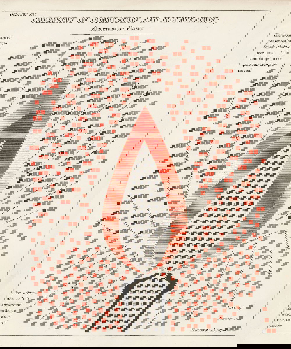 Color plate illustrating the chemistry of combustion and illumination through the structure of a flame. Diagram from Edward Livingston Youmans' Chemical Atlas; or, The Chemistry of Familiar Objects (1856).
