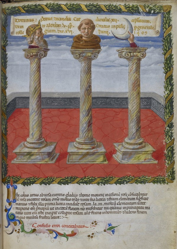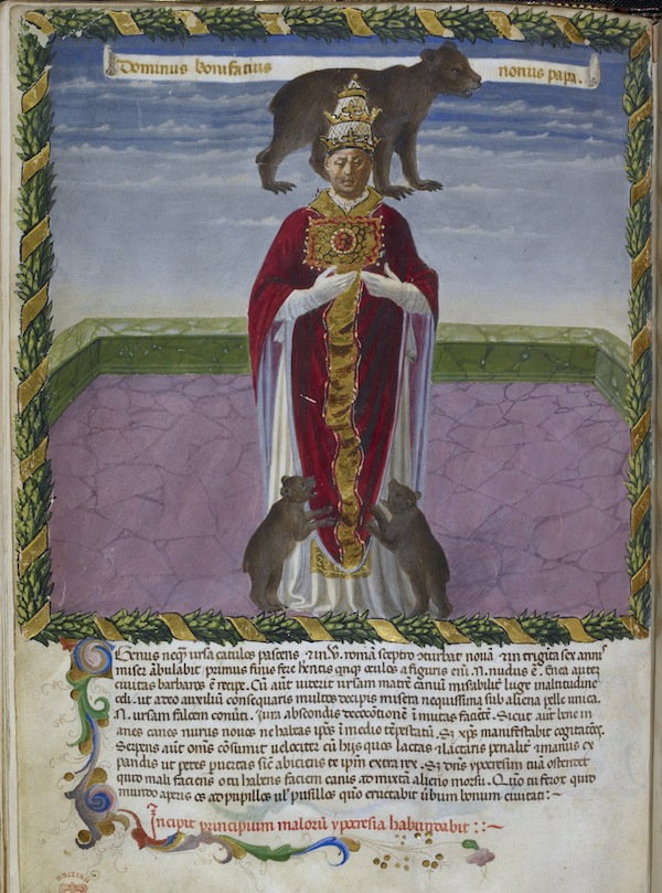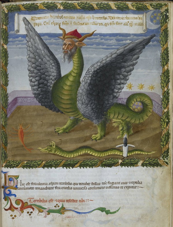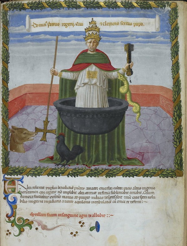 Selection of details from a 15th-century manuscript titled Vaticinia de Pontificibus depicting gloriously surreal portraits of various Popes in the midst of the prophecies relating to them. According to Wikipedia: