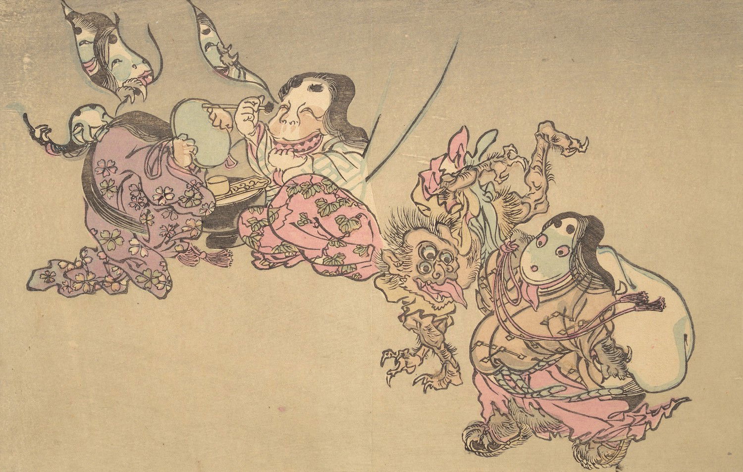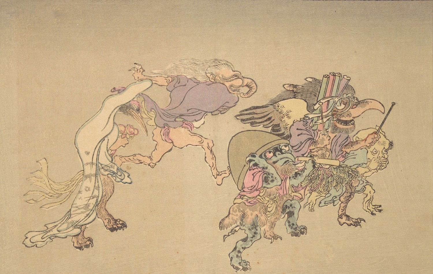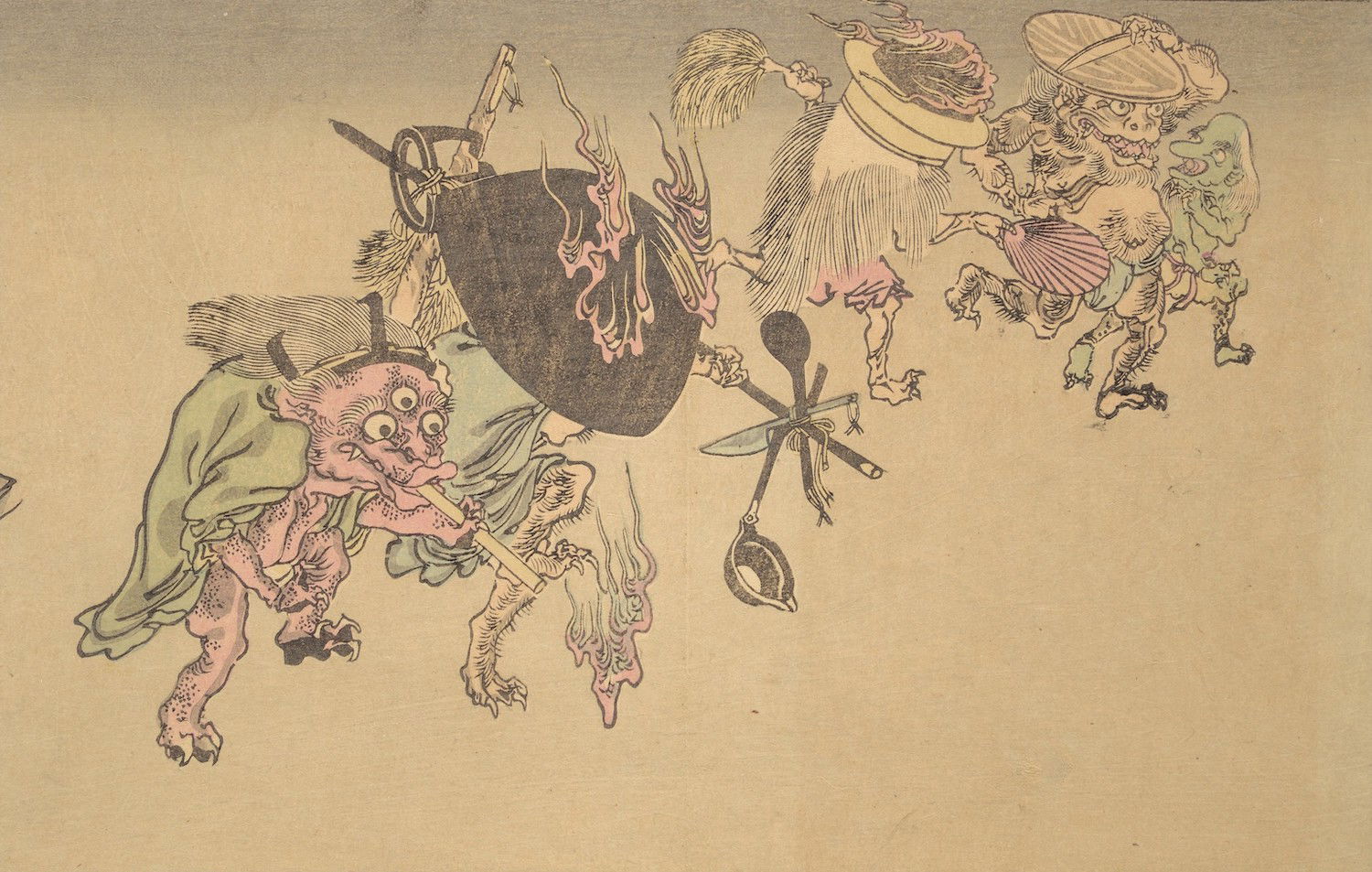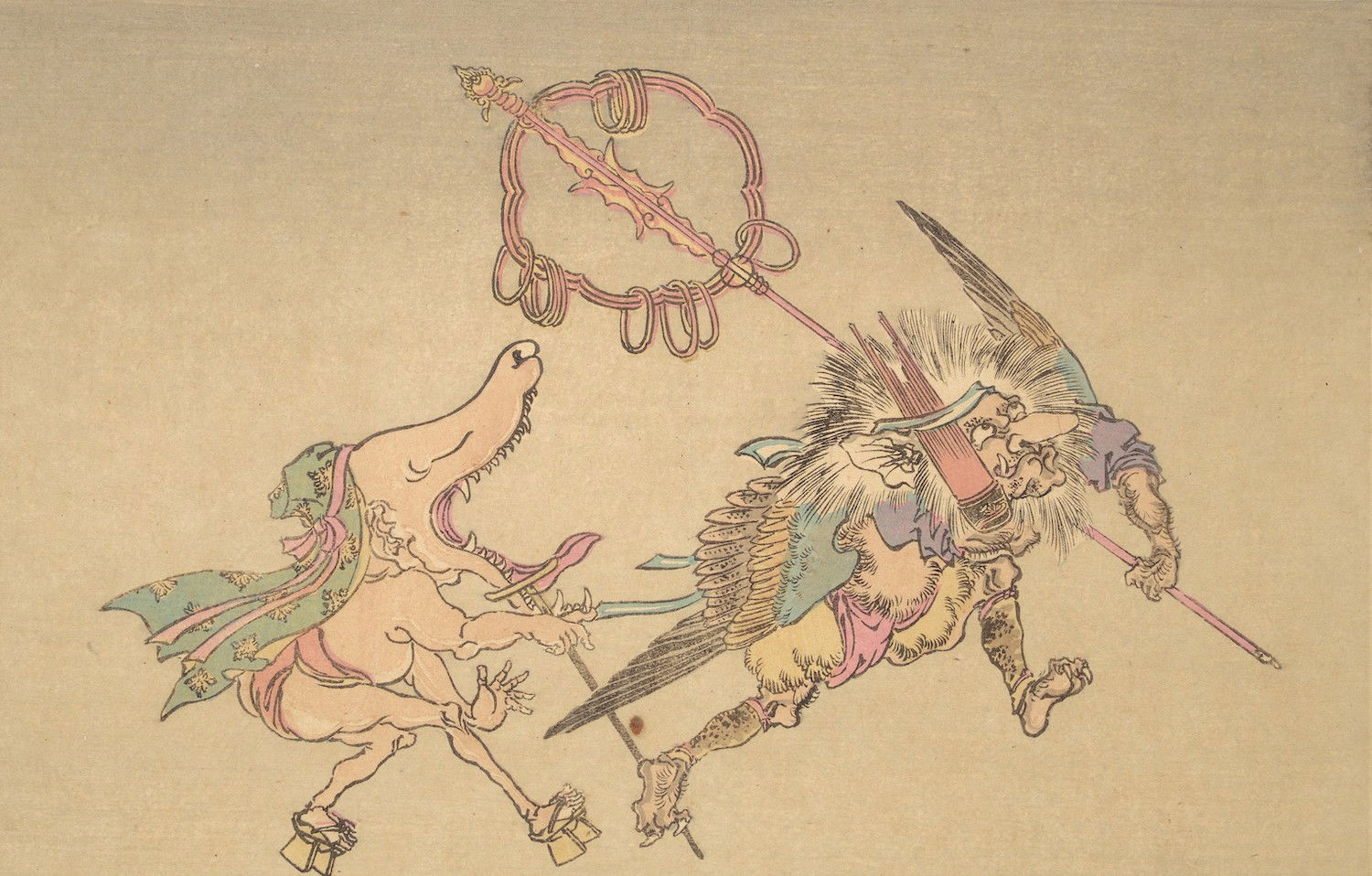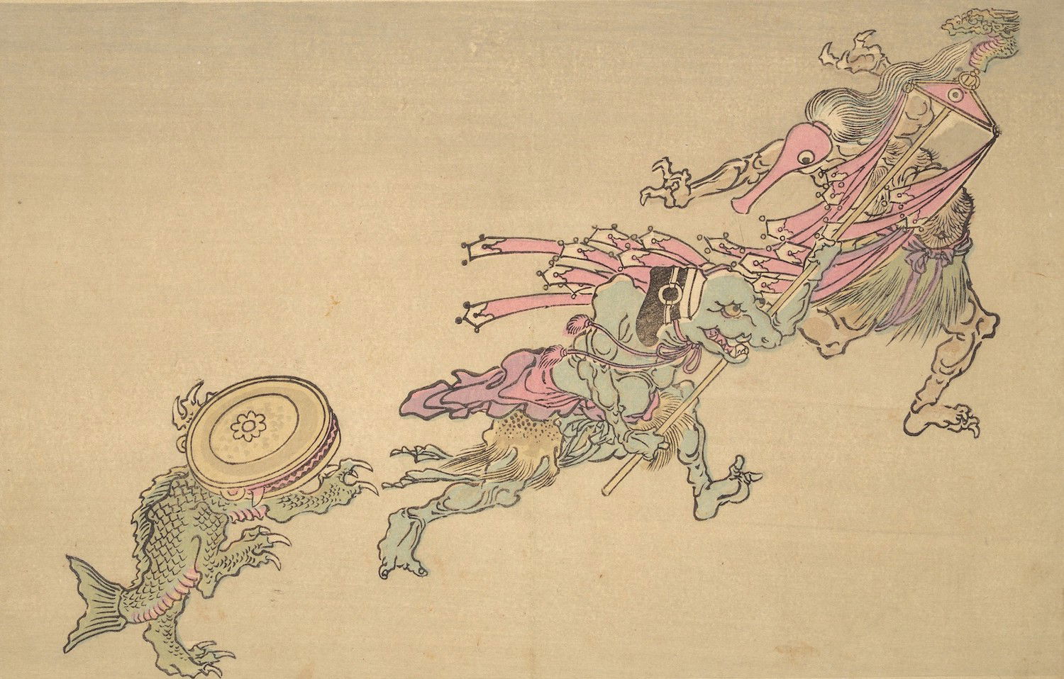 A helmet for a court dance (bugaku), a chime (kei), ritual scepter (nyoi), and a folding fan turn into flying and running demons.