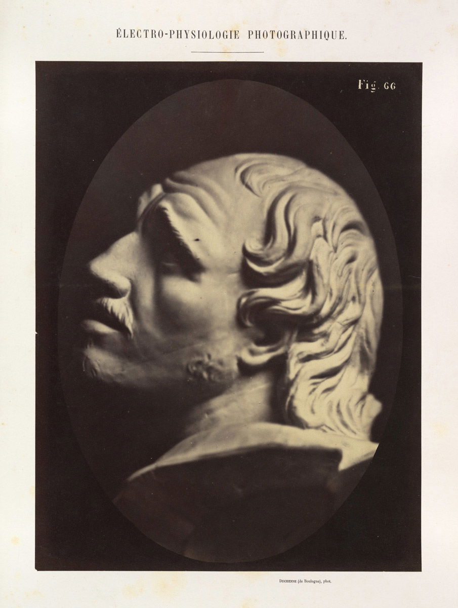 Figure 66 from Duchenne's 1862 monograph Mécanisme de la physionomie humaine, a pioneering work exploring the muscles of facial expression, work which involved the triggering of muscular contractions with electrical probes.