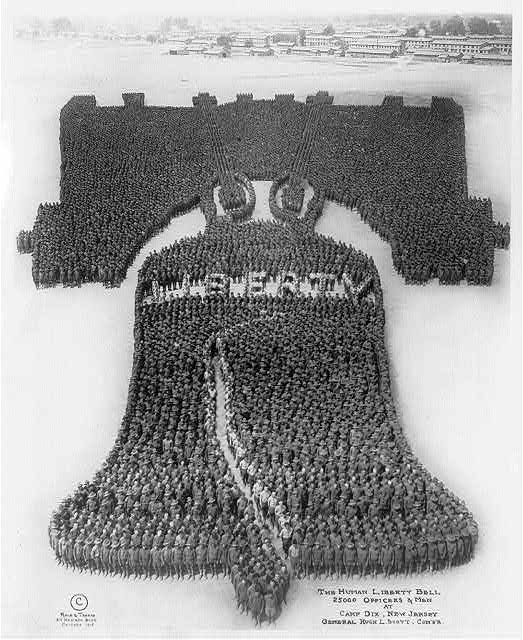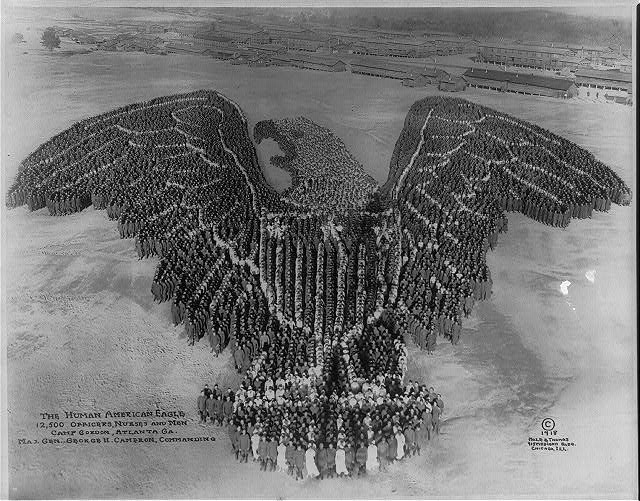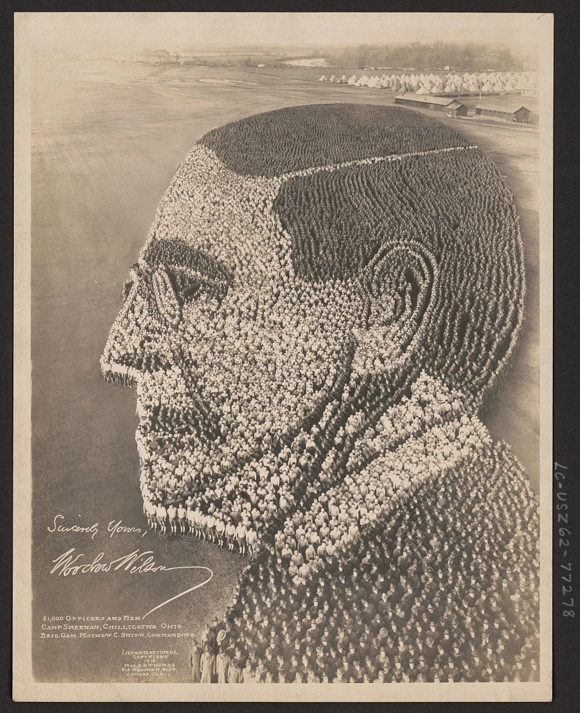 In search of some eye-catching imagery to boost morale surrounding US involvement in WWI, the US military commissioned the English-born photographer Arthur Mole and his assistant John Thomas to make a series of extraordinary group portraits. Between 1915 and 1921, with the dutiful help of thousands of servicemen and staff from various US military camps, the duo produced around thirty of the highly patriotic images, which Mole labelled "living photographs".