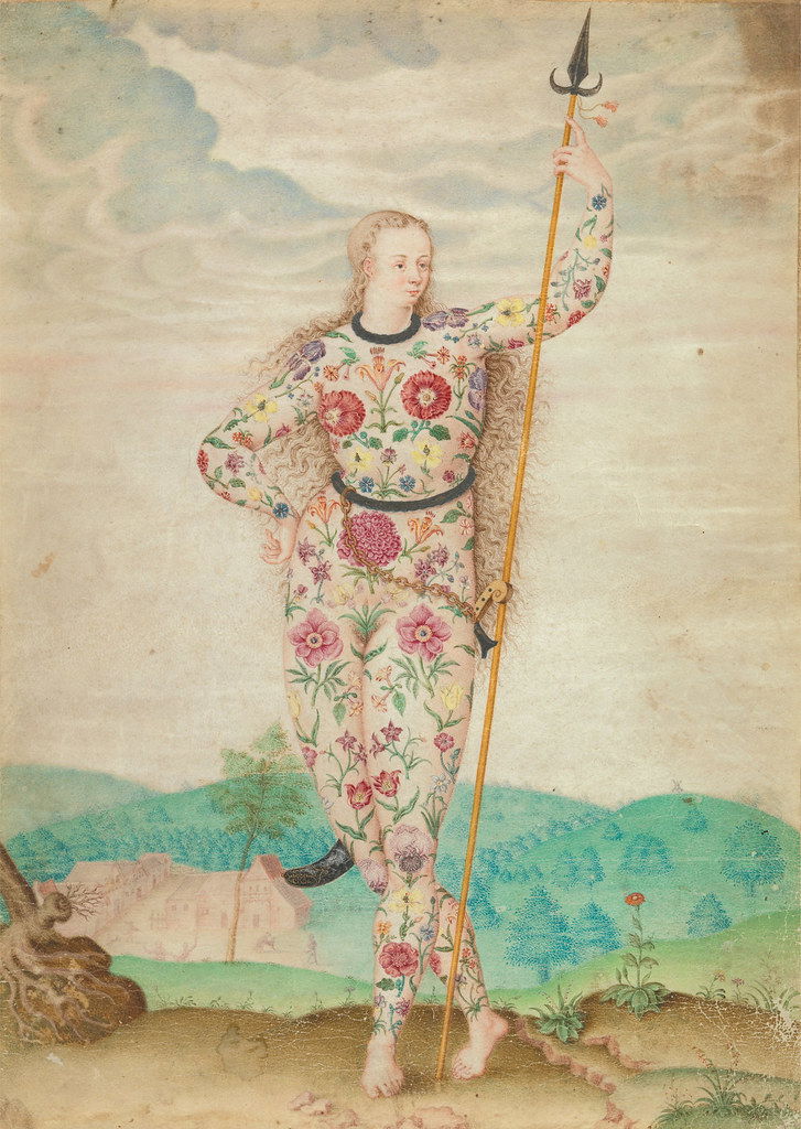 Originally thought to be one of John White's drawings from his 16th-century Virginia expedition, this colourful miniature is now attributed to the French artist Jacques Le Moyne. It does not show a North American native as first thought but rather imagines an early inhabitant of the British Isles, a member of the Picts, a group of people who lived in what is now modern-day Scotland during the Late Iron Age and Early Medieval periods. As Lisa Ford from the Yale Center for British Art notes, the image was most likely "intended to remind readers that early natives of the British Isles existed in a savage state similar to natives in the Americas". Although the Picts are often said to have tattooed themselves, there is little…