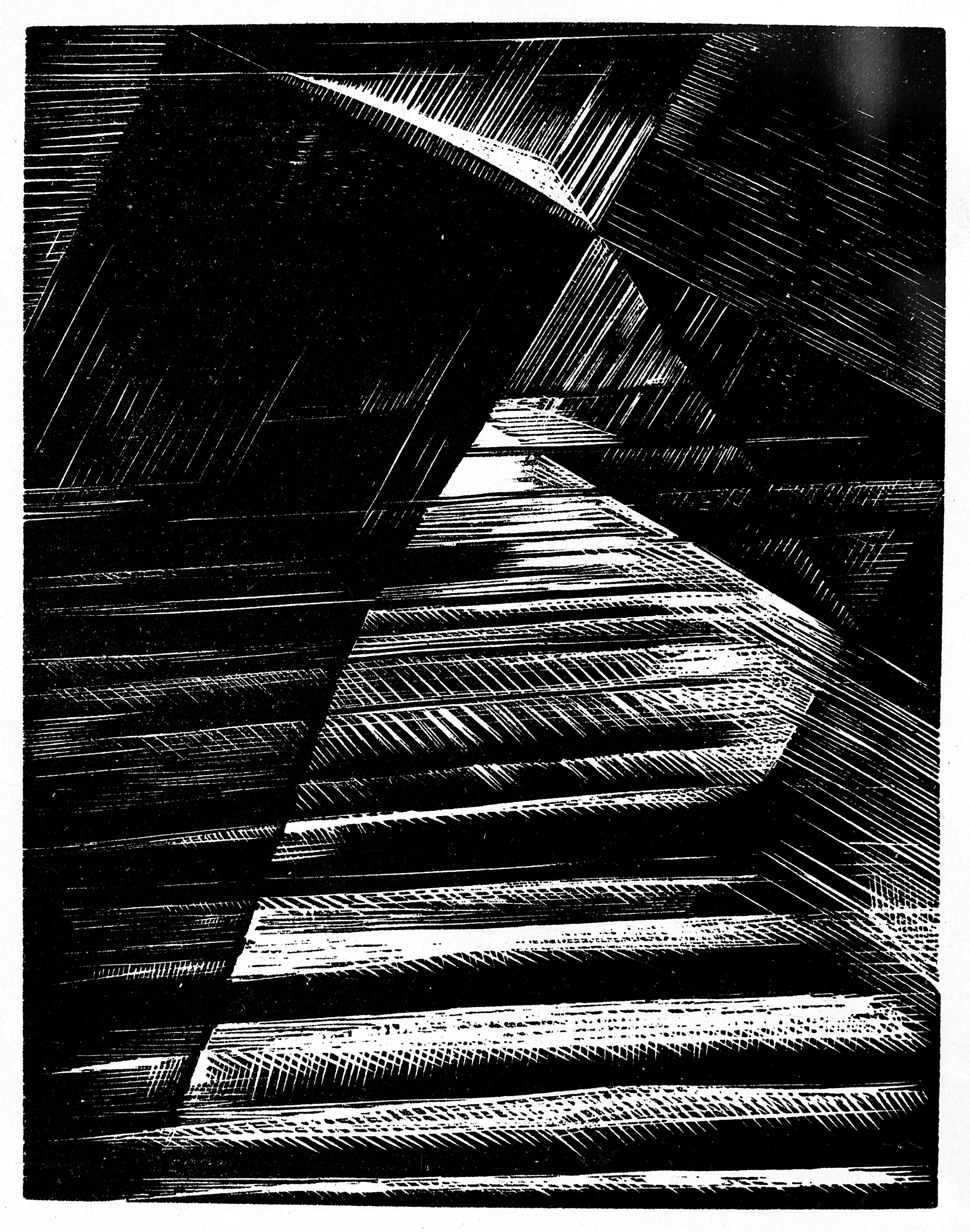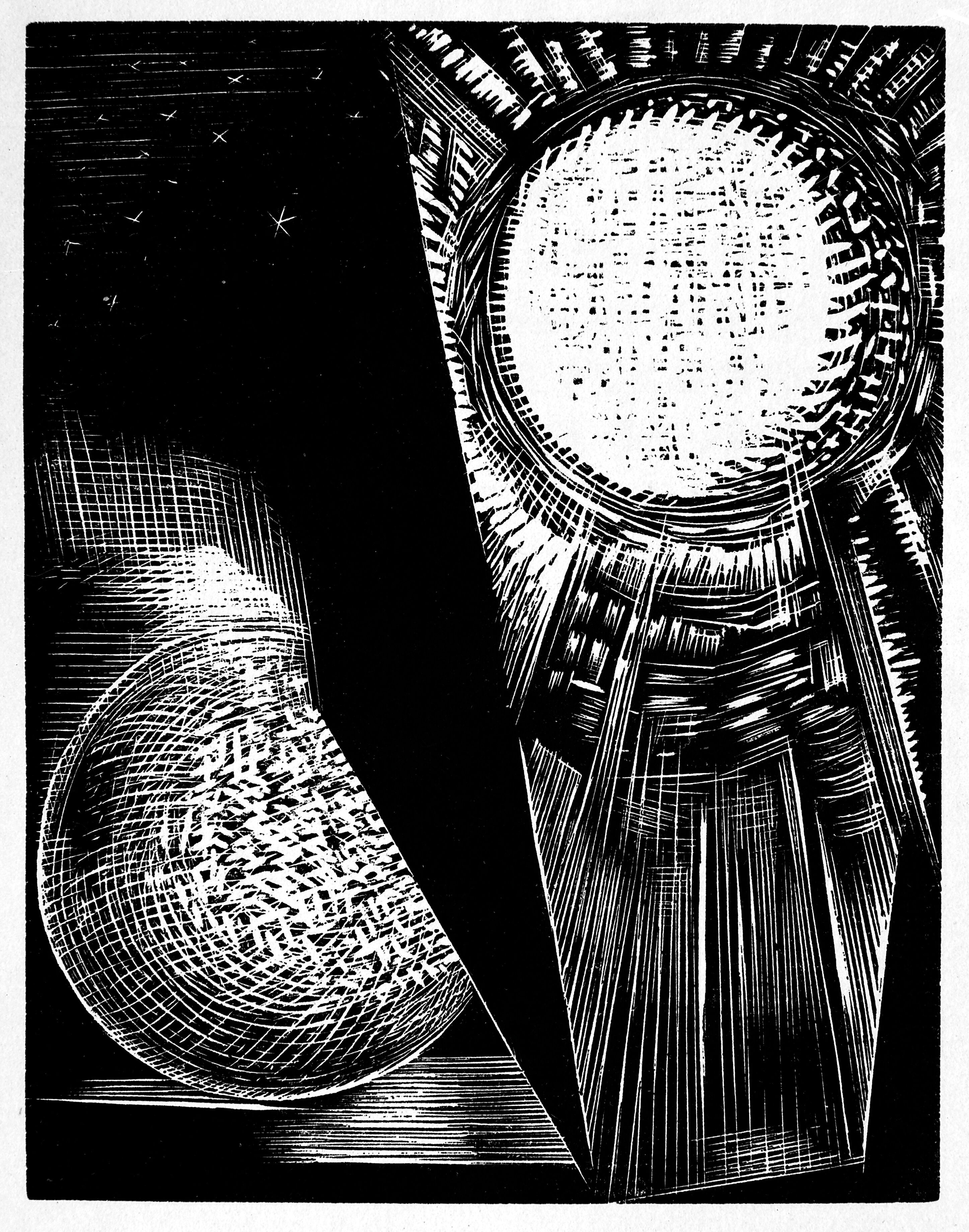 Woodcuts inspired by the biblical Genesis, which depict the creation of the world as a jerky, frightening cataclysm.
