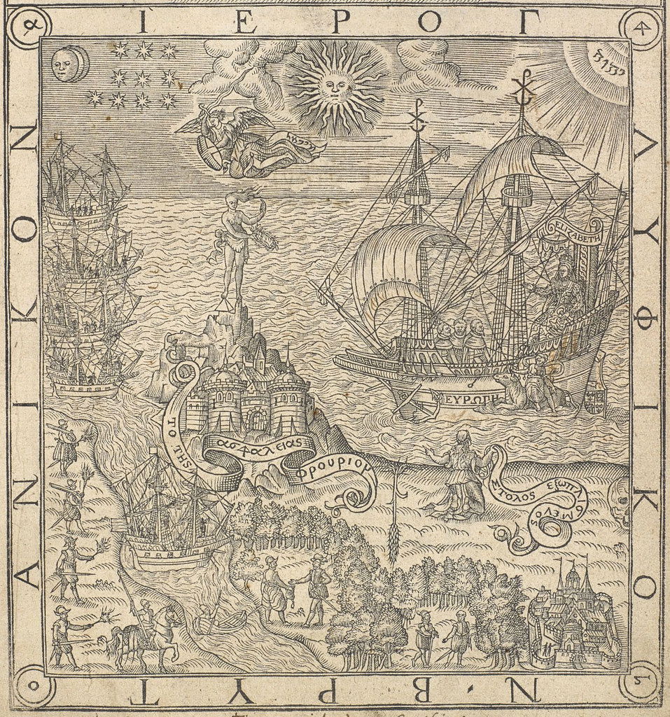 Title page image from John Dee's The General and Rare Memorials pertayning to the Perfect Arte of Navigation (1577) one of the first texts to express the idea of the "British Empire". The illustration was designed by Dee himself and shows Elizabeth at the helm of a ship (top right), in charge of Britain’s imperial destiny.