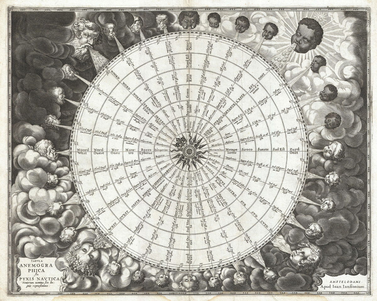 One of the earliest and most significant anemographic, or wind rose, charts to appear in the 17th century, by the Ducth cartographer Jan Janssonius.