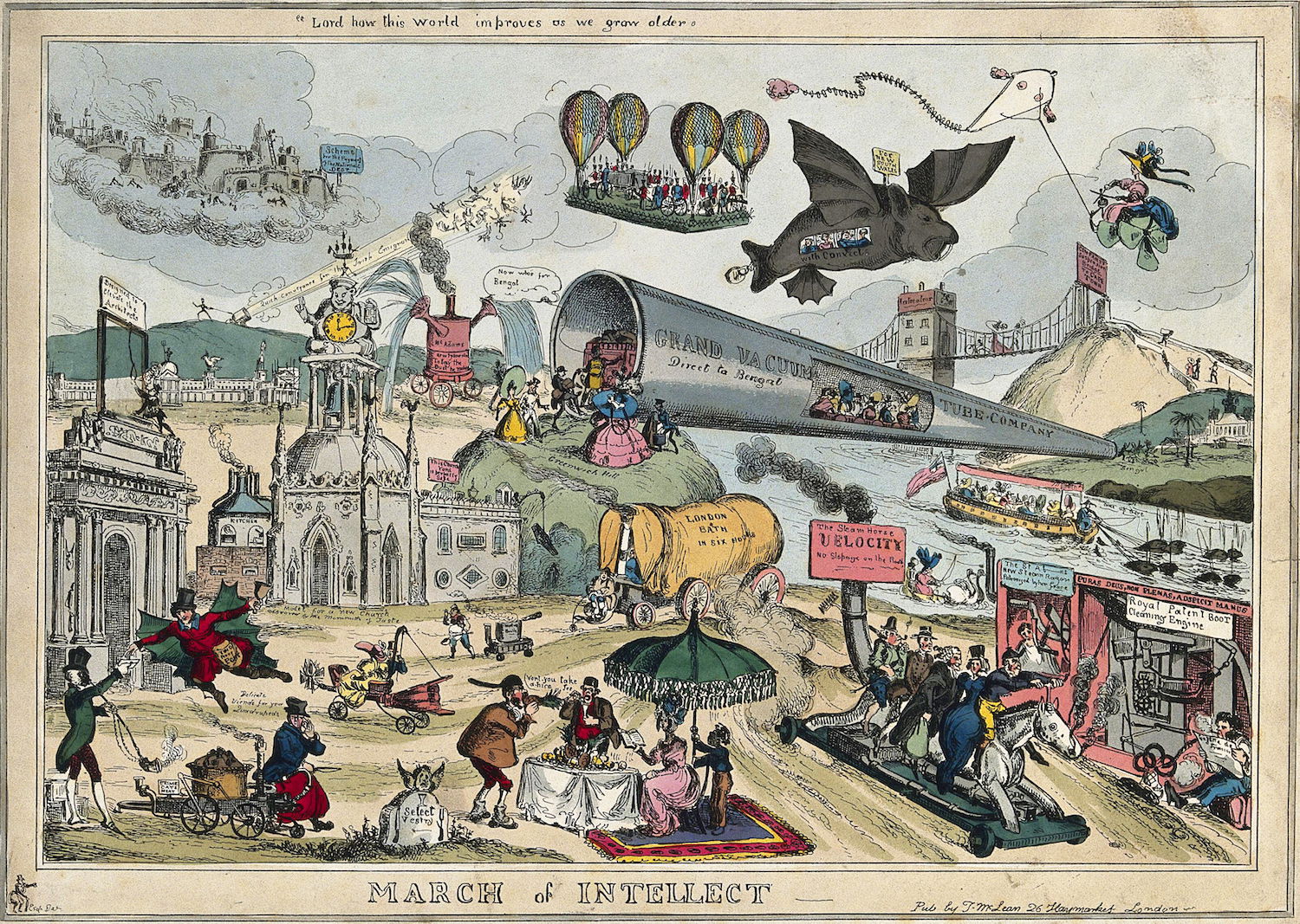 What did the future look like in 1820s Britain? Poking fun at liberal ambitions for education reform, the rapid pace of industrialization, and a fashionable interest in applied knowledge, William Heath’s March of Intellect series offered a satirical vision of the wonders and potential cost of progress. While extravagantly dressed ladies window-shop for pastel finery and forgo stairwells in favor of belt-driven slides, a child is moments away from being paved into the road by a carriage at full gallop. The automation of domestic labor — through a device called the “Grand Servant Superseding Apparatus for doing every kind of household work &c &c &c &c” — leaves women more time for recreation (or idle folly): smoking shisha in public, riding horsy hovercrafts, and traveling…