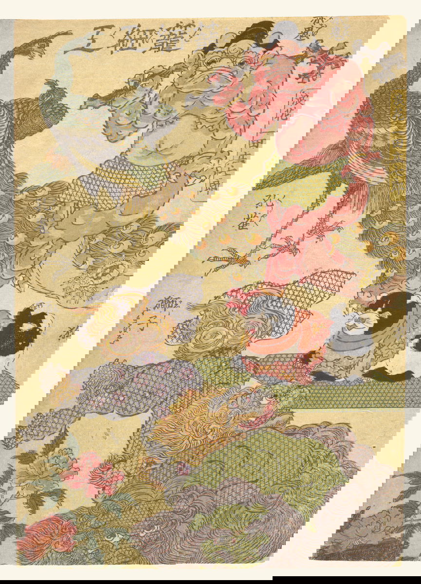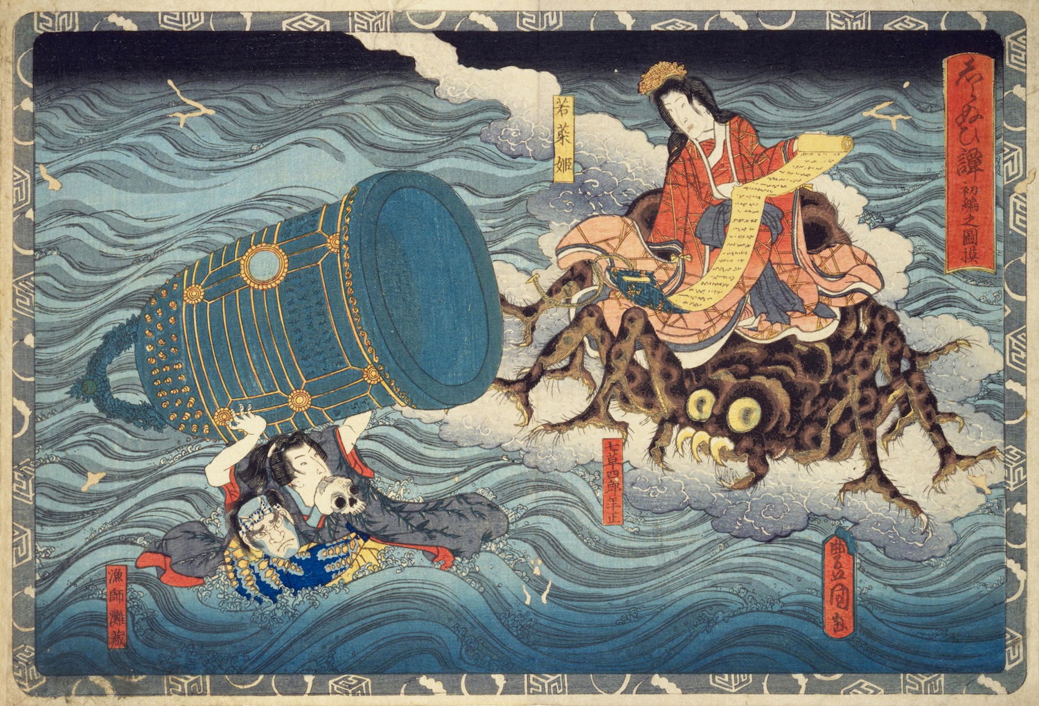 Color woodblock print by Utagawa Kunisada (Toyokuni III), titled Women and Children Playing in Snow, ca. 1830s.