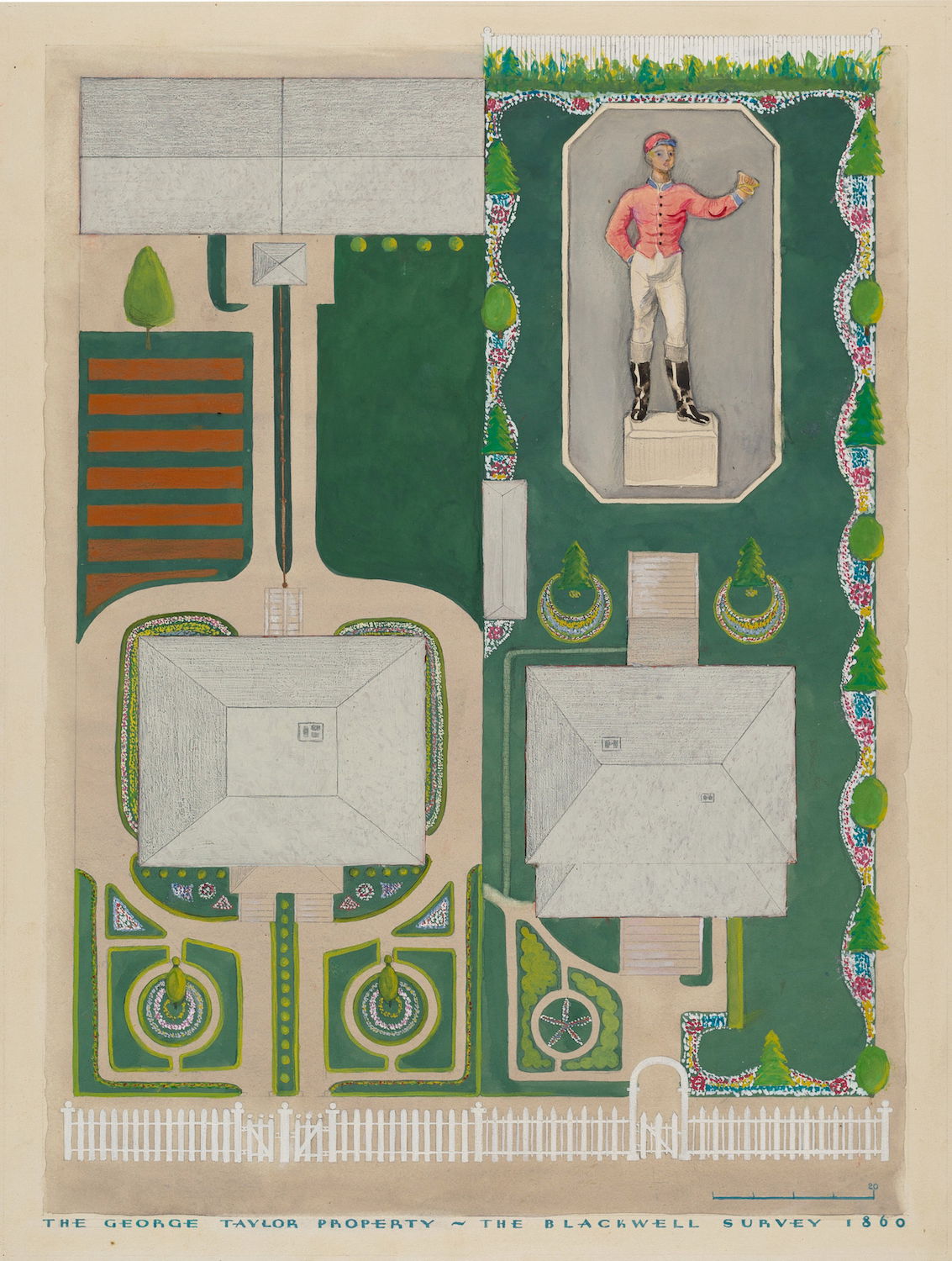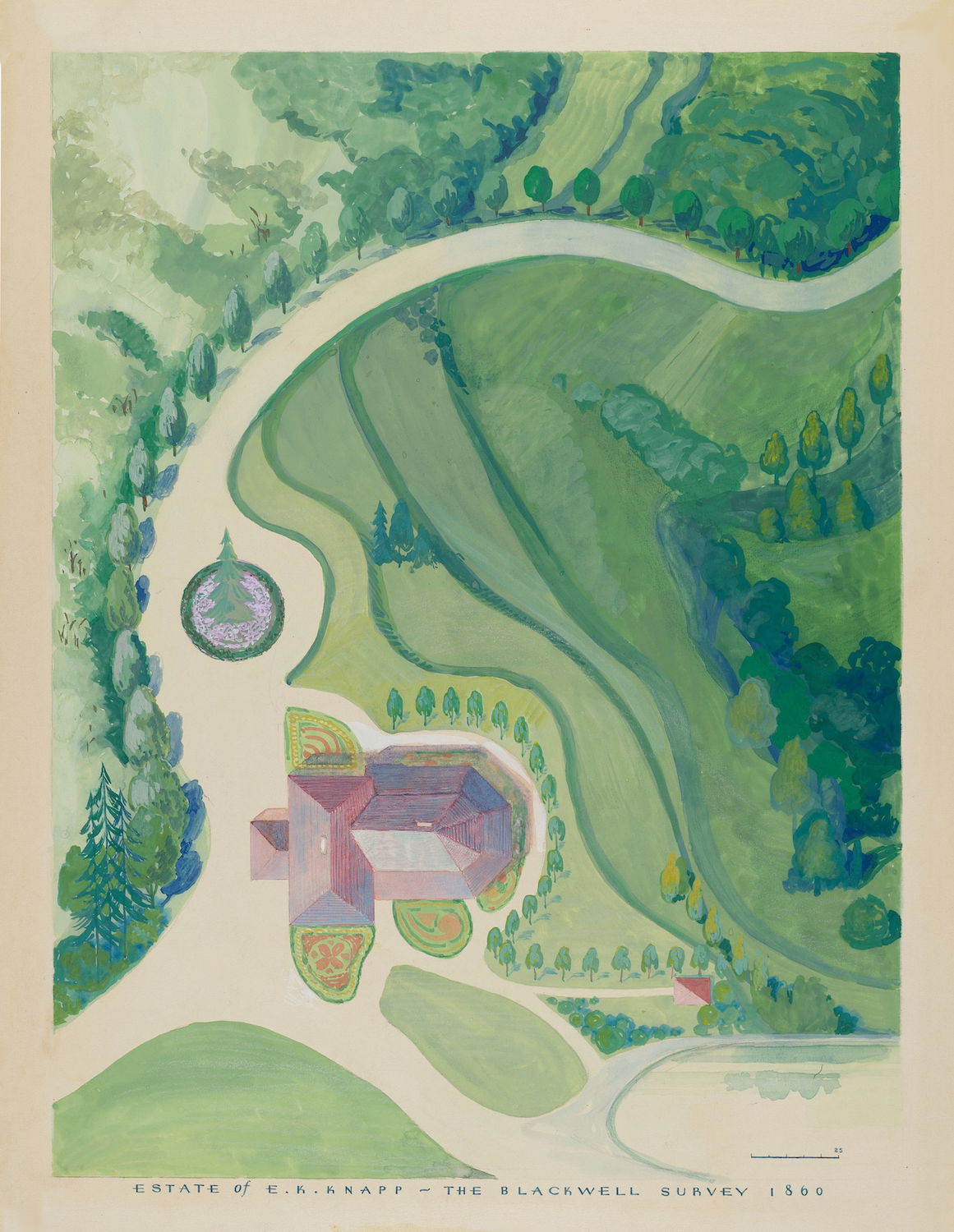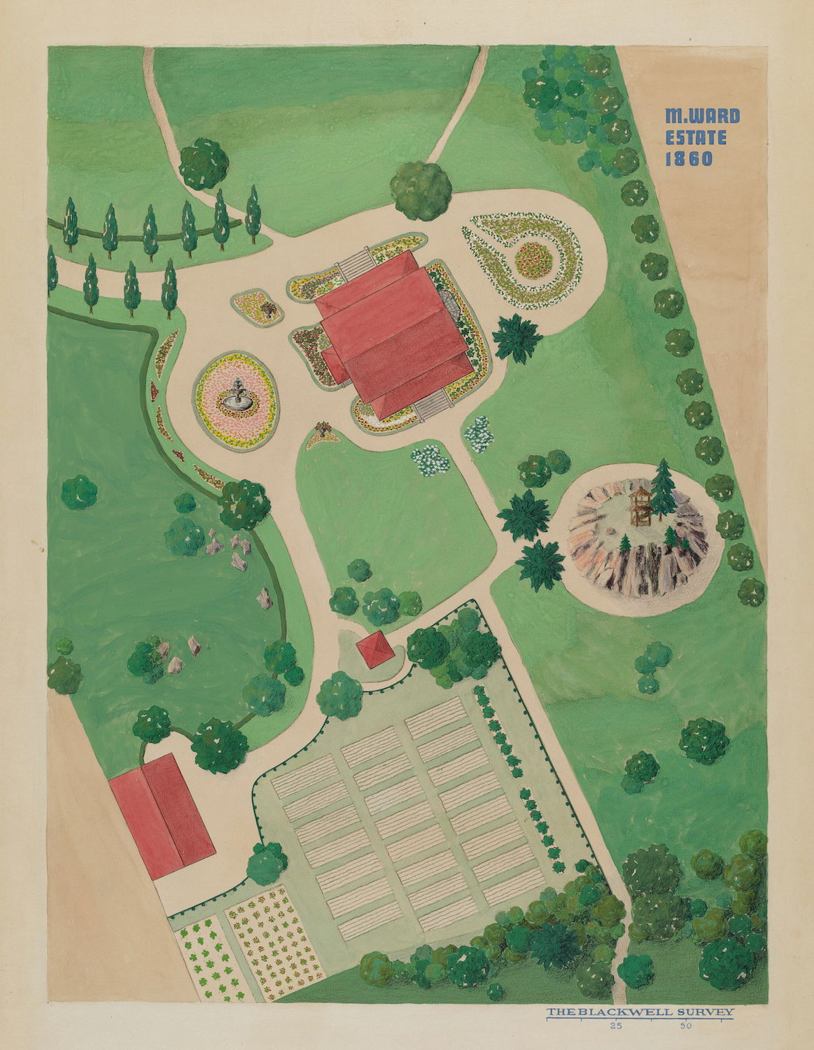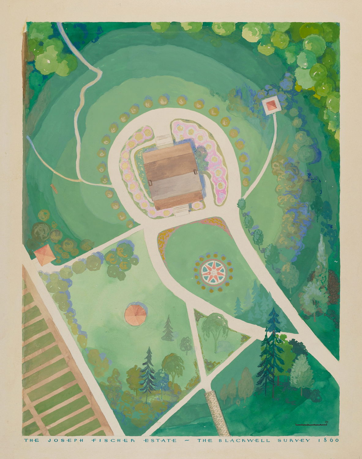 Scattered amongst the 18,257 watercolor, crayon, chalk, charcoal, and color pencil drawings of folk, decorative, and industrial art executed between 1936 and 1942 for the Index of American Design (IAD) are a handful of aerial views of handsome country estates, whose curvilinear drives meander through sweeping lawns, clumps of evergreen trees, and arabesque flowerbeds bordered by neatly cropped topiary and hedgerows. Some of the picturesque landscapes are punctuated with craggy bedrock knolls and steep escarpments. A few of the drawings include close-up views of fountains, gazebos, benches, and lawn ornaments. Mostly labeled “Blackwell’s Survey”, and occasionally bearing the date “1860”, these watercolors depict the semi-rural terrain of northern Manhattan just before it began to urbanize in the closing decades of the nineteenth century.