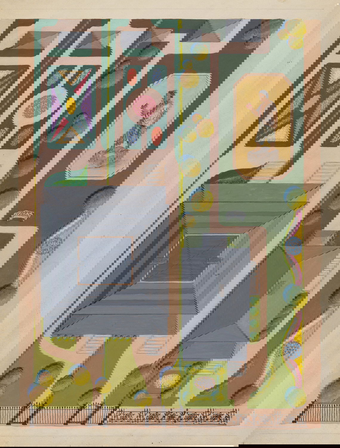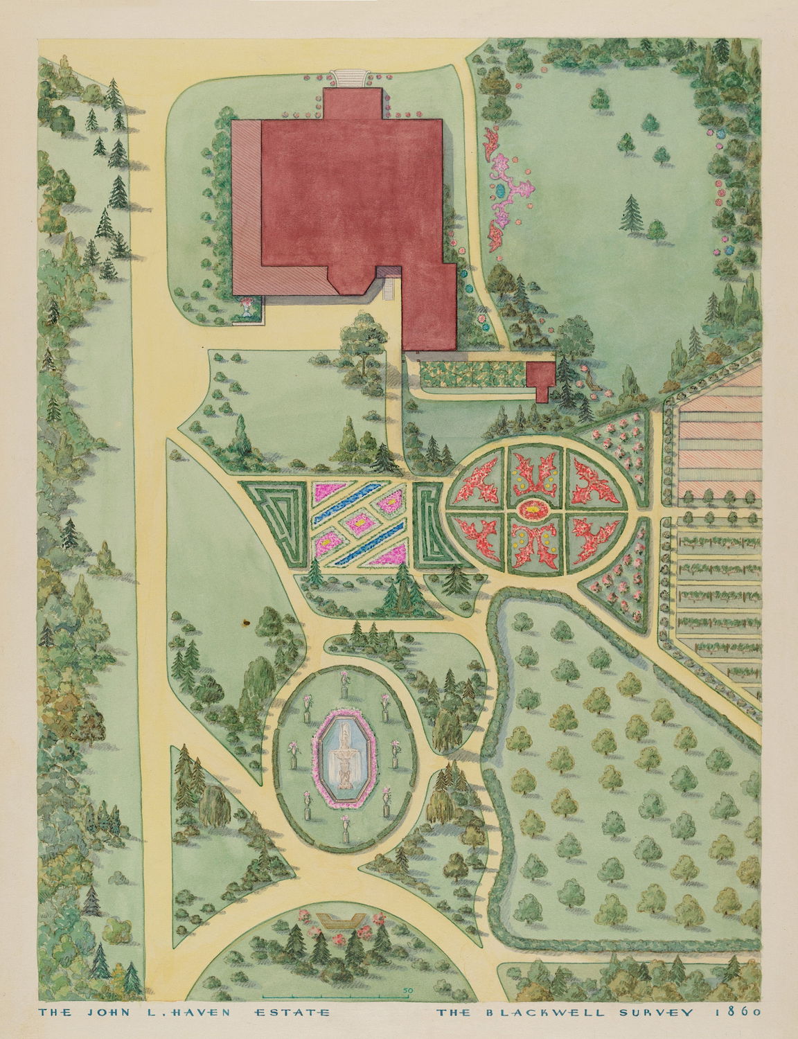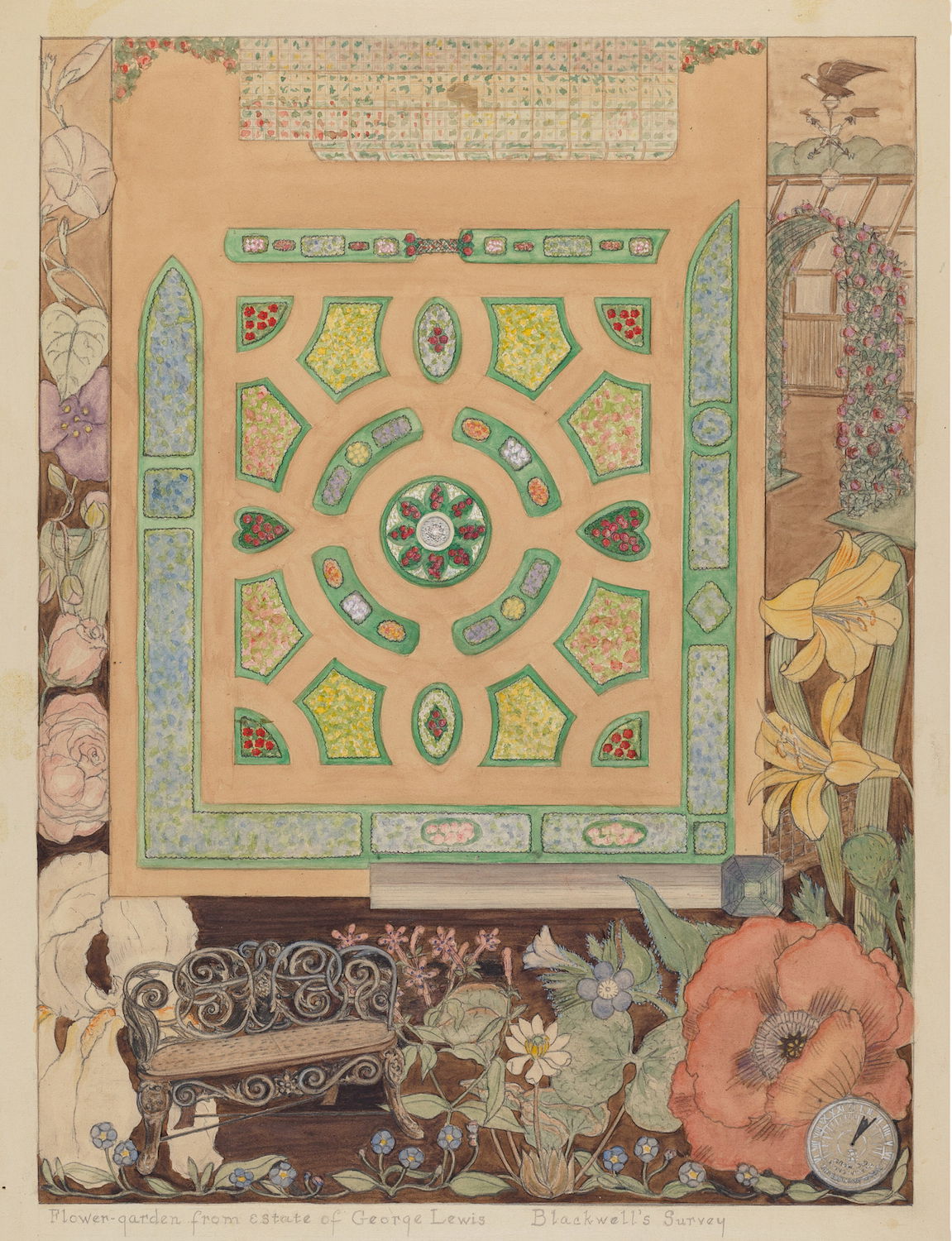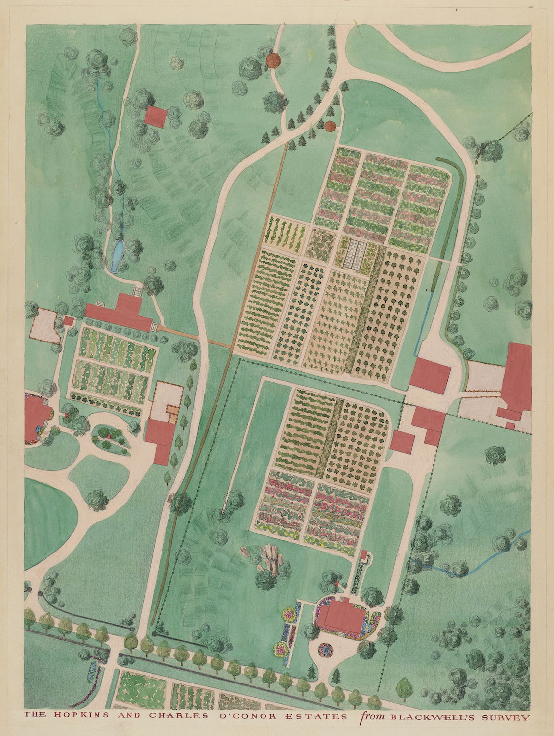 Scattered amongst the 18,257 watercolor, crayon, chalk, charcoal, and color pencil drawings of folk, decorative, and industrial art executed between 1936 and 1942 for the Index of American Design (IAD) are a handful of aerial views of handsome country estates, whose curvilinear drives meander through sweeping lawns, clumps of evergreen trees, and arabesque flowerbeds bordered by neatly cropped topiary and hedgerows. Some of the picturesque landscapes are punctuated with craggy bedrock knolls and steep escarpments. A few of the drawings include close-up views of fountains, gazebos, benches, and lawn ornaments. Mostly labeled “Blackwell’s Survey”, and occasionally bearing the date “1860”, these watercolors depict the semi-rural terrain of northern Manhattan just before it began to urbanize in the closing decades of the nineteenth century.