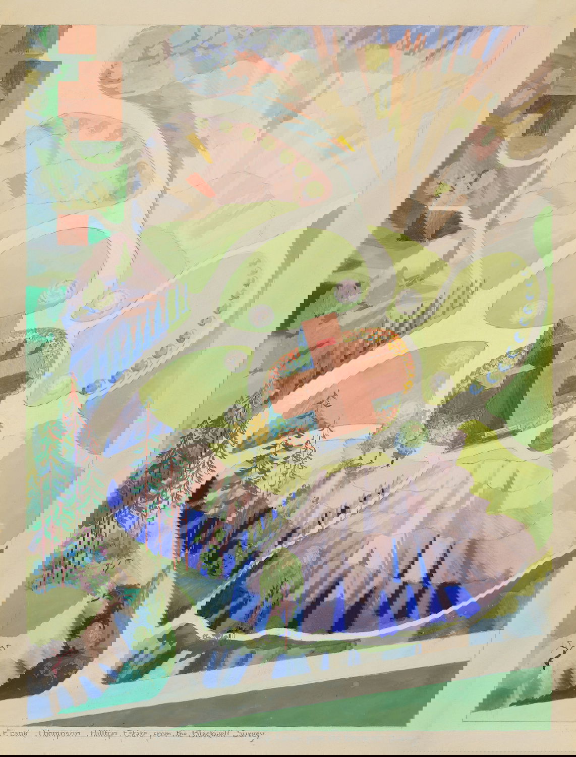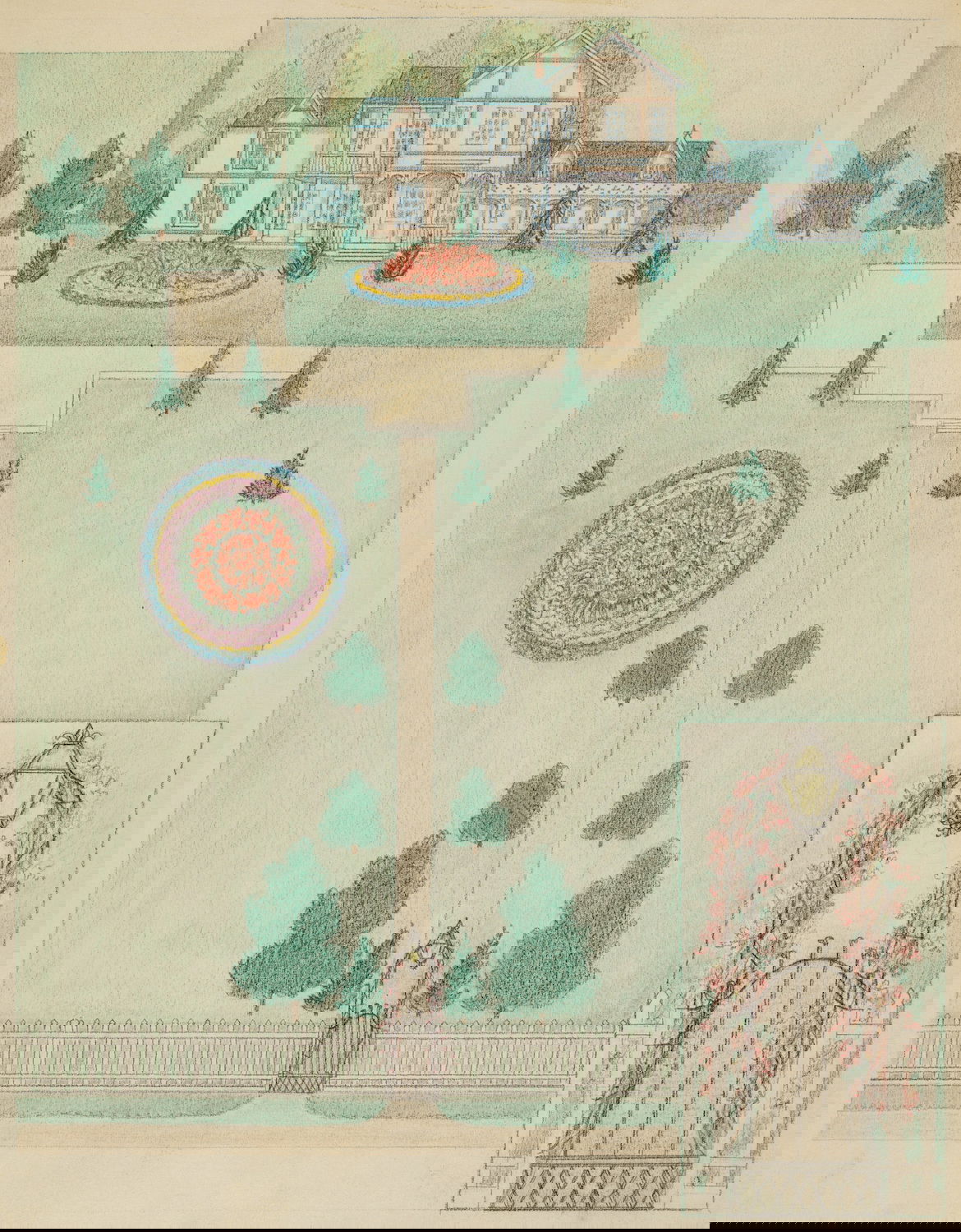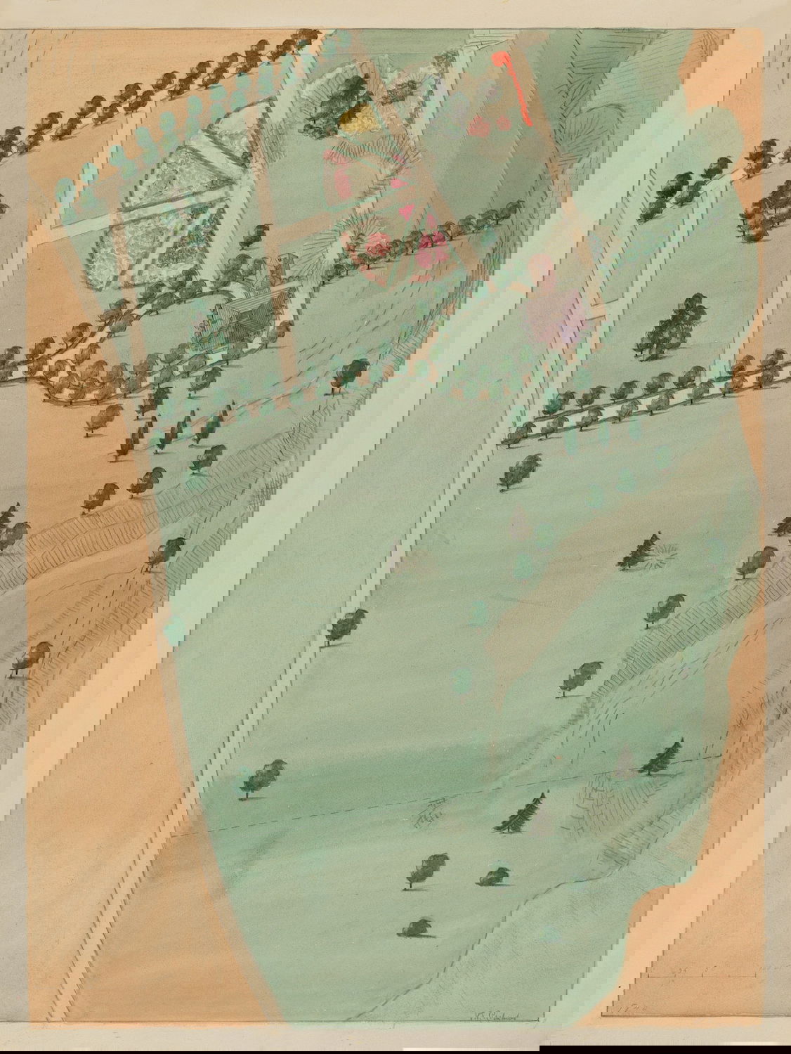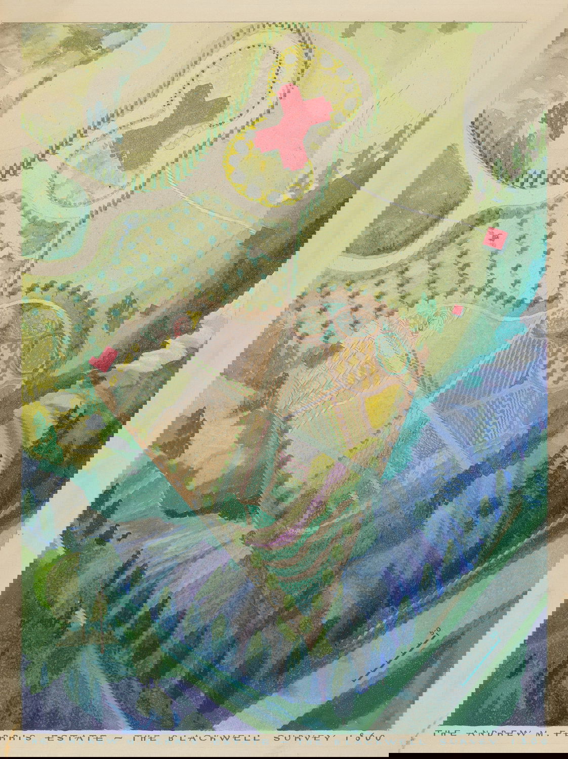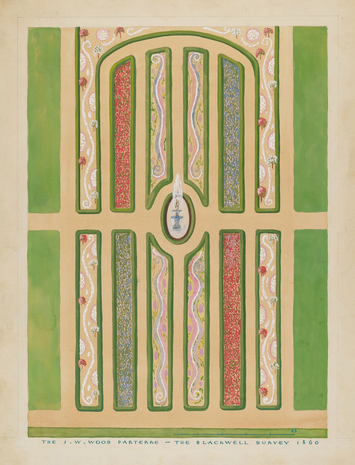 Scattered amongst the 18,257 watercolor, crayon, chalk, charcoal, and color pencil drawings of folk, decorative, and industrial art executed between 1936 and 1942 for the Index of American Design (IAD) are a handful of aerial views of handsome country estates, whose curvilinear drives meander through sweeping lawns, clumps of evergreen trees, and arabesque flowerbeds bordered by neatly cropped topiary and hedgerows. Some of the picturesque landscapes are punctuated with craggy bedrock knolls and steep escarpments. A few of the drawings include close-up views of fountains, gazebos, benches, and lawn ornaments. Mostly labeled “Blackwell’s Survey”, and occasionally bearing the date “1860”, these watercolors depict the semi-rural terrain of northern Manhattan just before it began to urbanize in the closing decades of the nineteenth century.