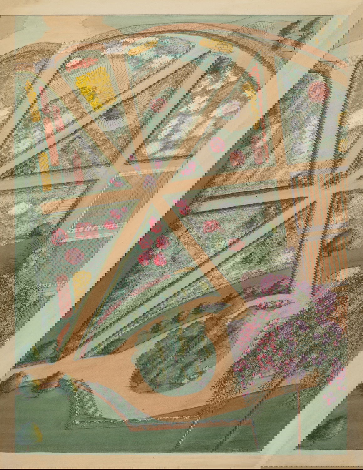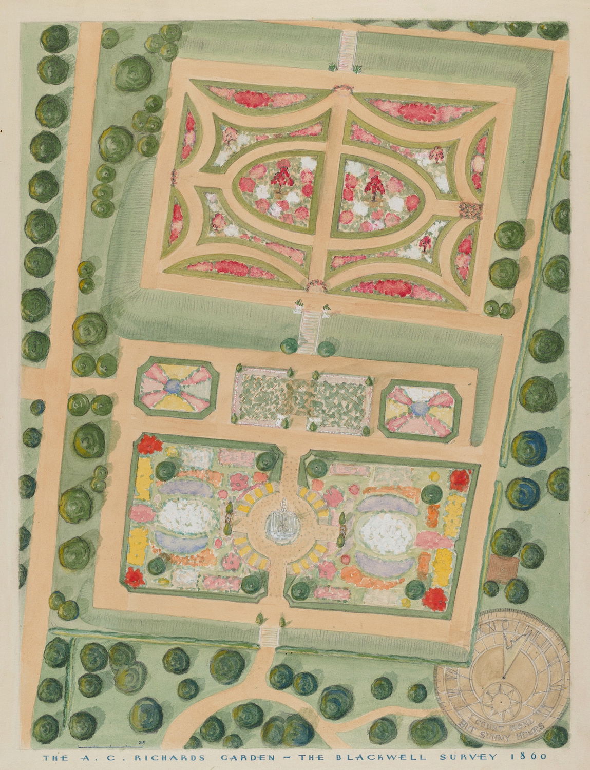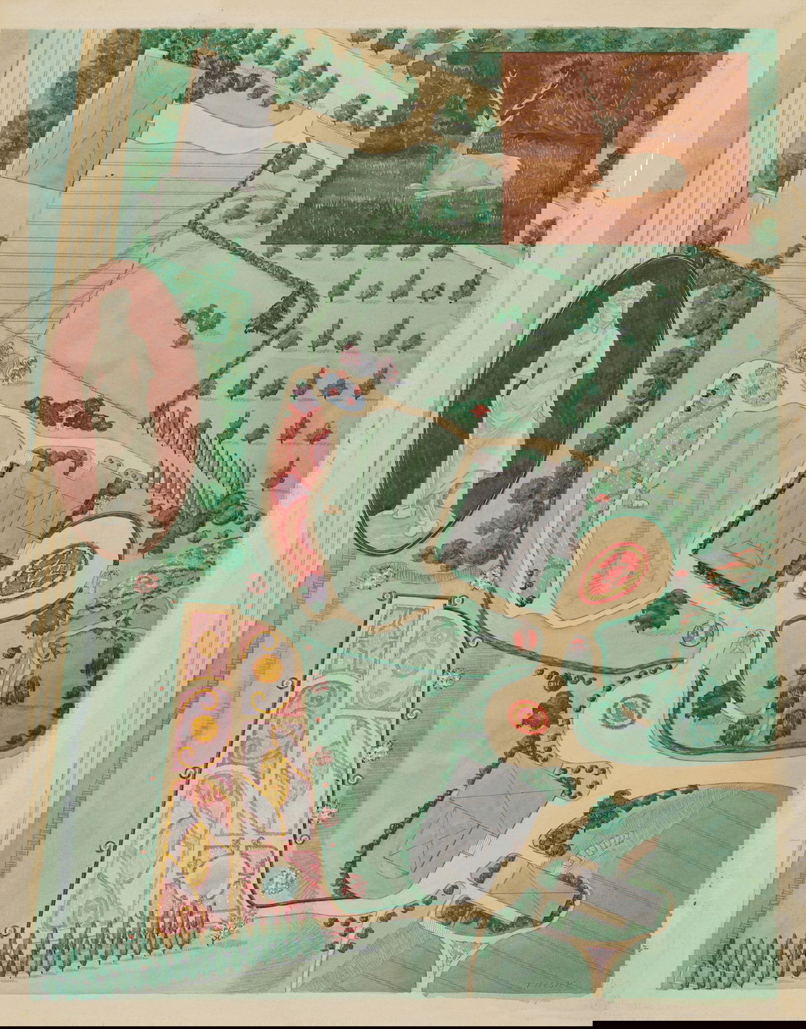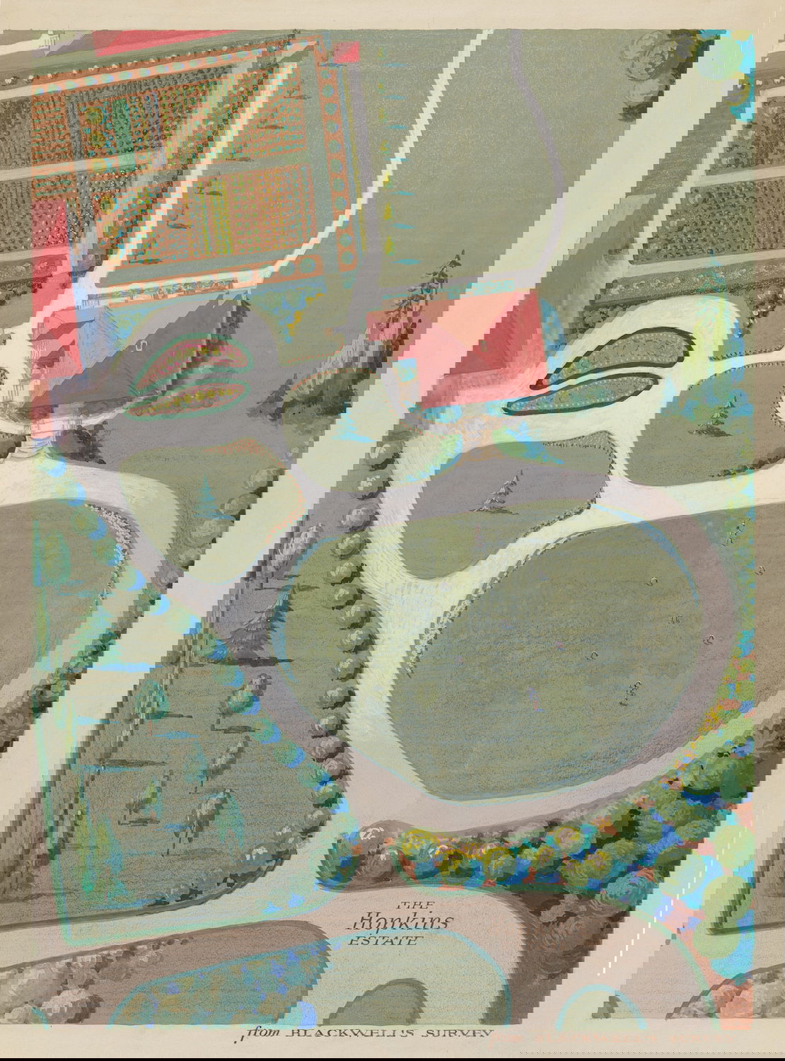 Scattered amongst the 18,257 watercolor, crayon, chalk, charcoal, and color pencil drawings of folk, decorative, and industrial art executed between 1936 and 1942 for the Index of American Design (IAD) are a handful of aerial views of handsome country estates, whose curvilinear drives meander through sweeping lawns, clumps of evergreen trees, and arabesque flowerbeds bordered by neatly cropped topiary and hedgerows. Some of the picturesque landscapes are punctuated with craggy bedrock knolls and steep escarpments. A few of the drawings include close-up views of fountains, gazebos, benches, and lawn ornaments. Mostly labeled “Blackwell’s Survey”, and occasionally bearing the date “1860”, these watercolors depict the semi-rural terrain of northern Manhattan just before it began to urbanize in the closing decades of the nineteenth century.