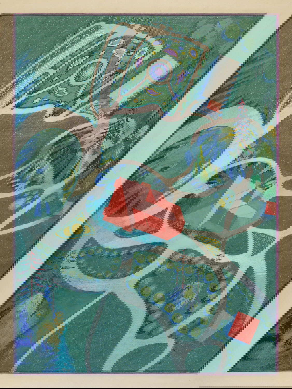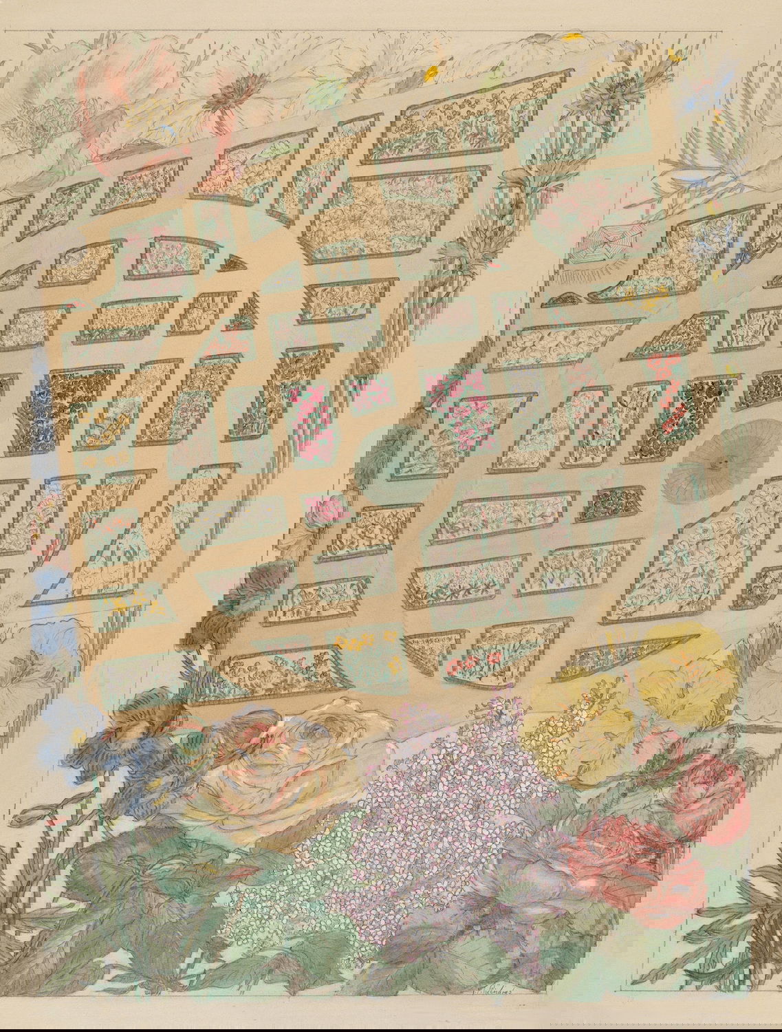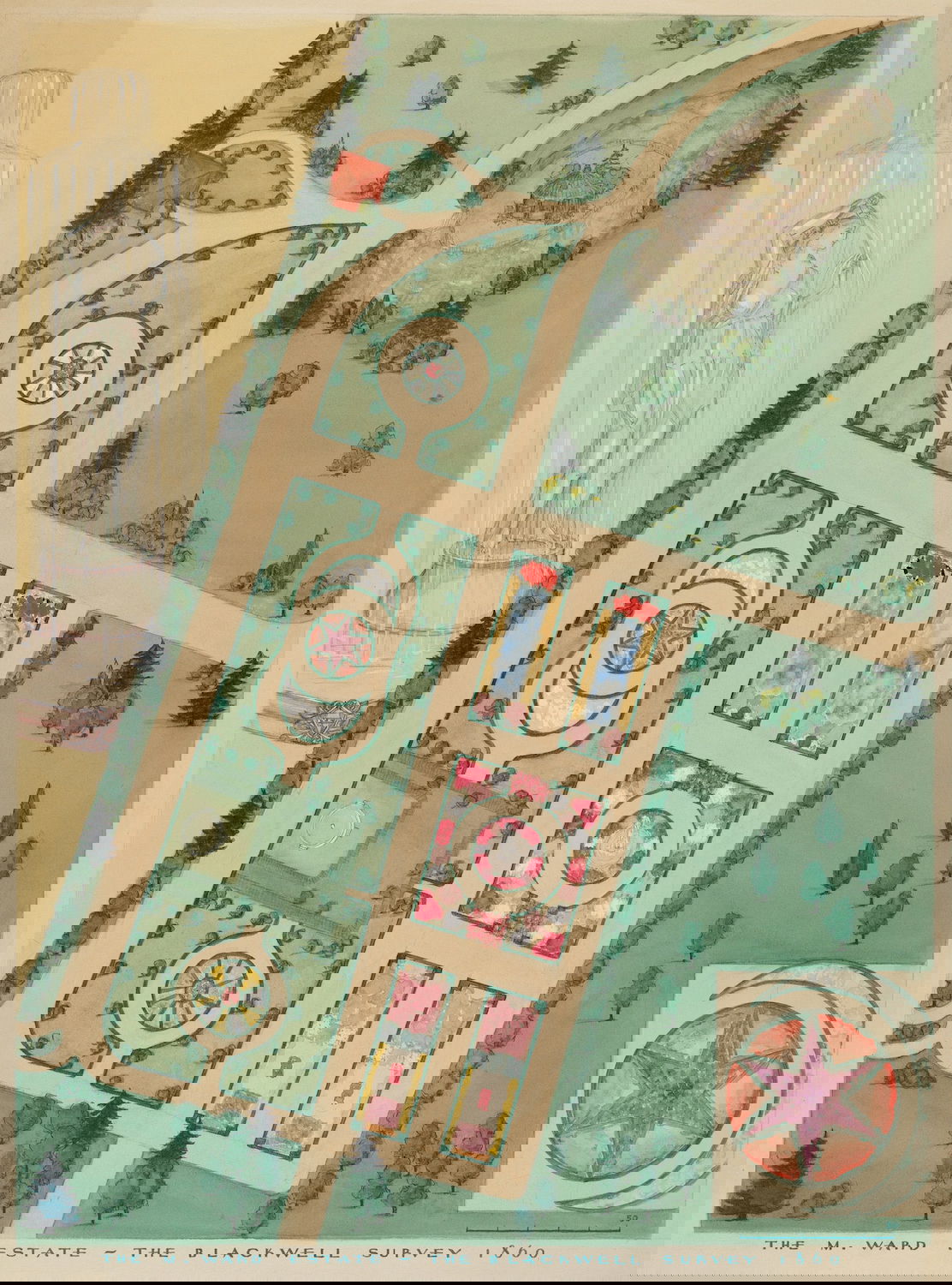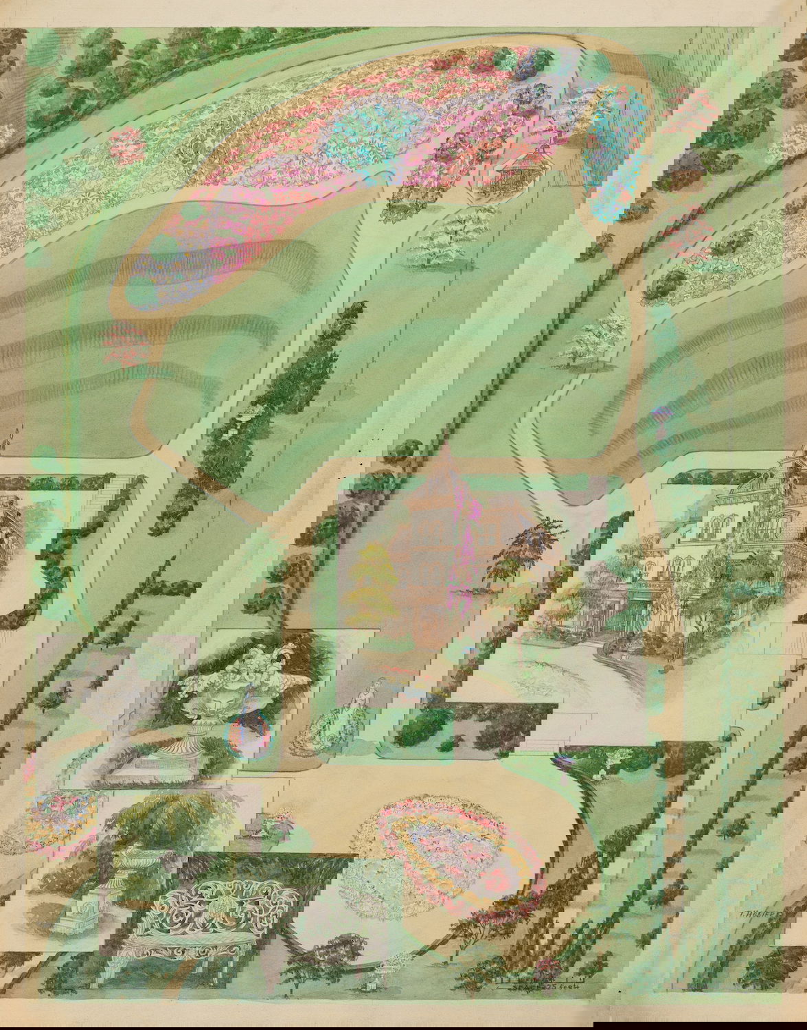 Scattered amongst the 18,257 watercolor, crayon, chalk, charcoal, and color pencil drawings of folk, decorative, and industrial art executed between 1936 and 1942 for the Index of American Design (IAD) are a handful of aerial views of handsome country estates, whose curvilinear drives meander through sweeping lawns, clumps of evergreen trees, and arabesque flowerbeds bordered by neatly cropped topiary and hedgerows. Some of the picturesque landscapes are punctuated with craggy bedrock knolls and steep escarpments. A few of the drawings include close-up views of fountains, gazebos, benches, and lawn ornaments. Mostly labeled “Blackwell’s Survey”, and occasionally bearing the date “1860”, these watercolors depict the semi-rural terrain of northern Manhattan just before it began to urbanize in the closing decades of the nineteenth century.