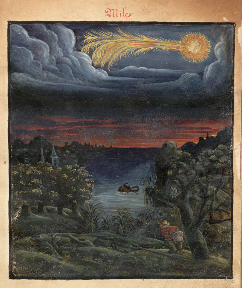 This stunning set of images come from a 16th-century treatise on comets, created anonymously in Flanders (now northern France) and now held at the Universitätsbibliothek Kassel. Commonly known as The Comet Book (or Kometenbuch in German), its full title translates as “Comets and their General and Particular Meanings, According to Ptolomeé, Albumasar, Haly, Aliquind and other Astrologers”. As the title (and indeed medieval origins of the book) suggests the focus is on the meaning of comets, the associated folklore and superstitions as played out on Earth, as opposed to an exploration from a scientific standpoint (the telescope would not be invented until the following century). Comets then are seen in terms of their mysterious terrestrial effects, which as a rule firmly occupy the disastrous category…