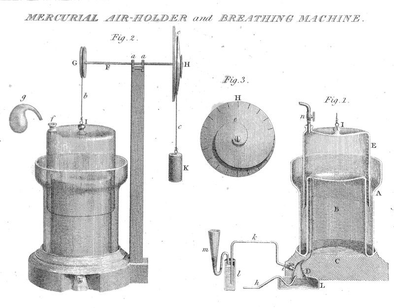 Frontispiece to Davy’s Researches, Chemical and Philosophical (1800), depicting the machinery used to create his experimental gases.