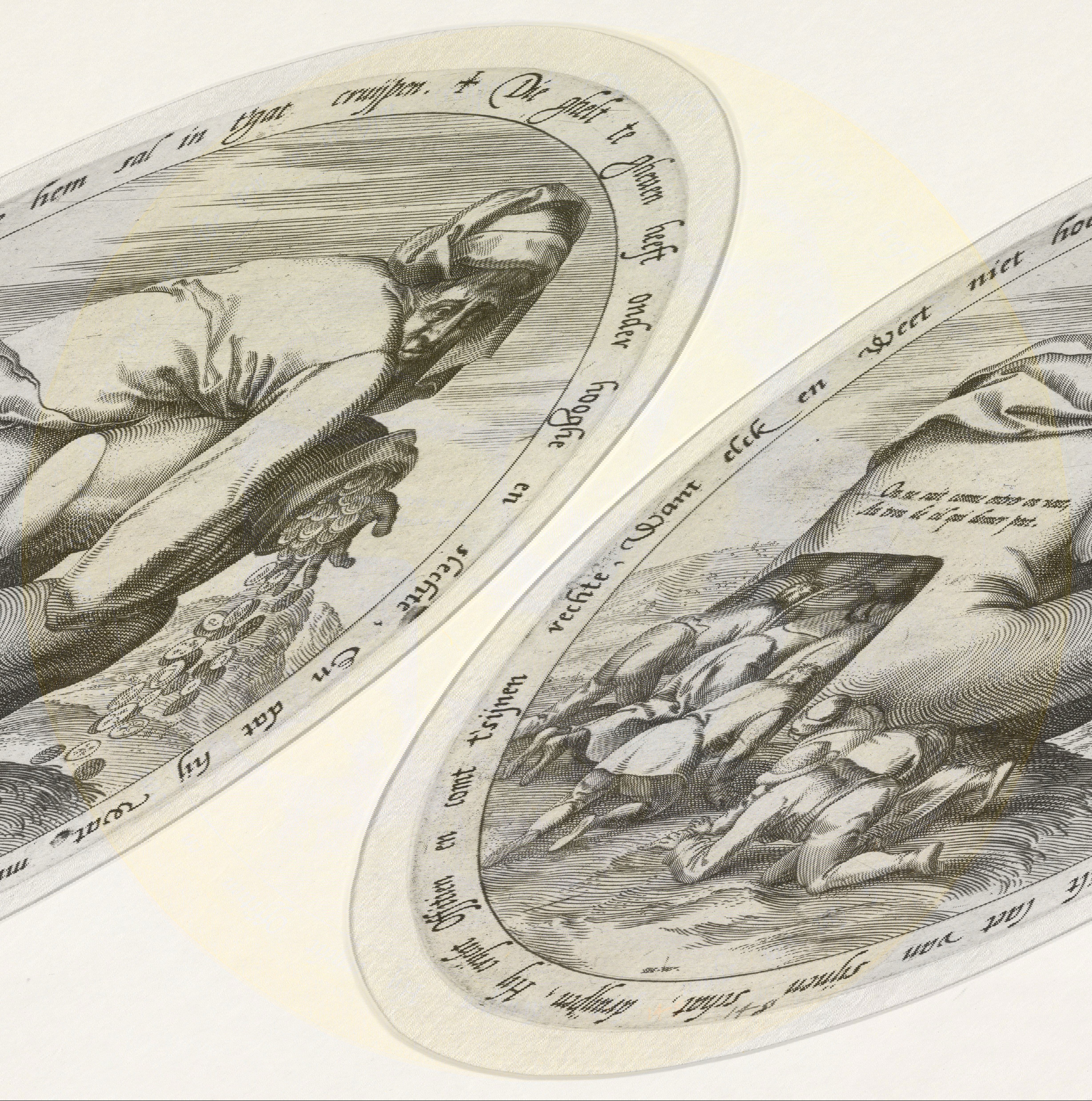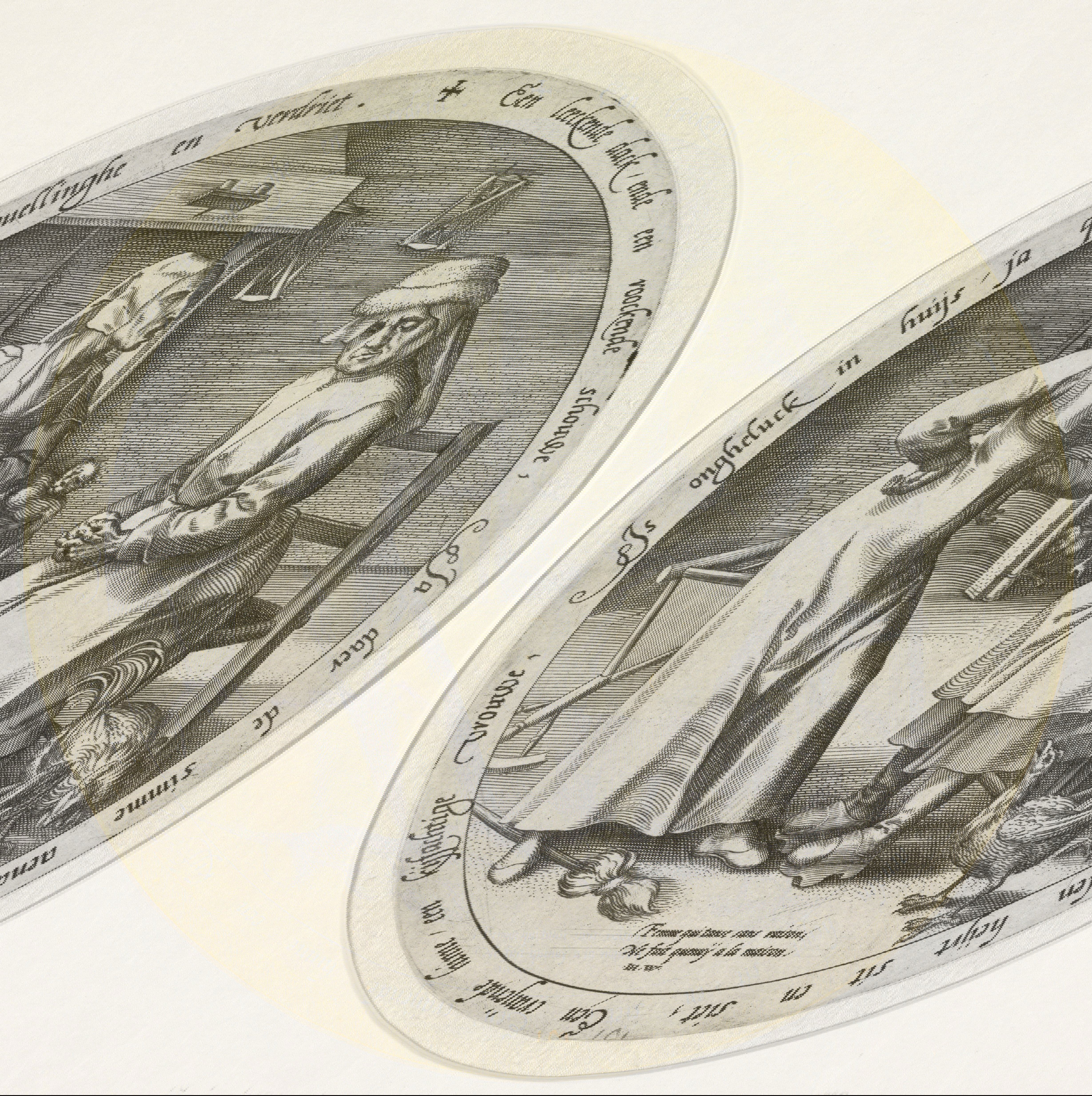 “I wear mourning, seeing the world in which so much deceit abounds.” So laments The Misanthrope as he skulks along, withdrawn emotionally and sartorially, in a deep-hooded cloak. But world-weariness does not amount to wisdom in Jan Wierix’s engraving; rather than serving as a hermetic sanctum, the misanthrope’s heavy garment only blinds him to the fact that the world — personified as a waddling orb — has caught up to him to steal his purse. The Misanthrope belongs to a series of twelve engraved roundels depicting literal enactments of Flemish proverbs, each concerned with some aspect of human folly or treachery. Seven of the scenes, collected below, were engraved by Wierix; the precise authorship of the remaining five remains mysterious. Rather like many actual proverbs,…