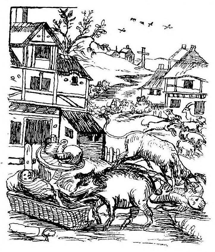 Illustration entitled "Trial of a Sow and Pigs at Lavegny" taken from The Book of Days (1863) edited by Robert Chambers.