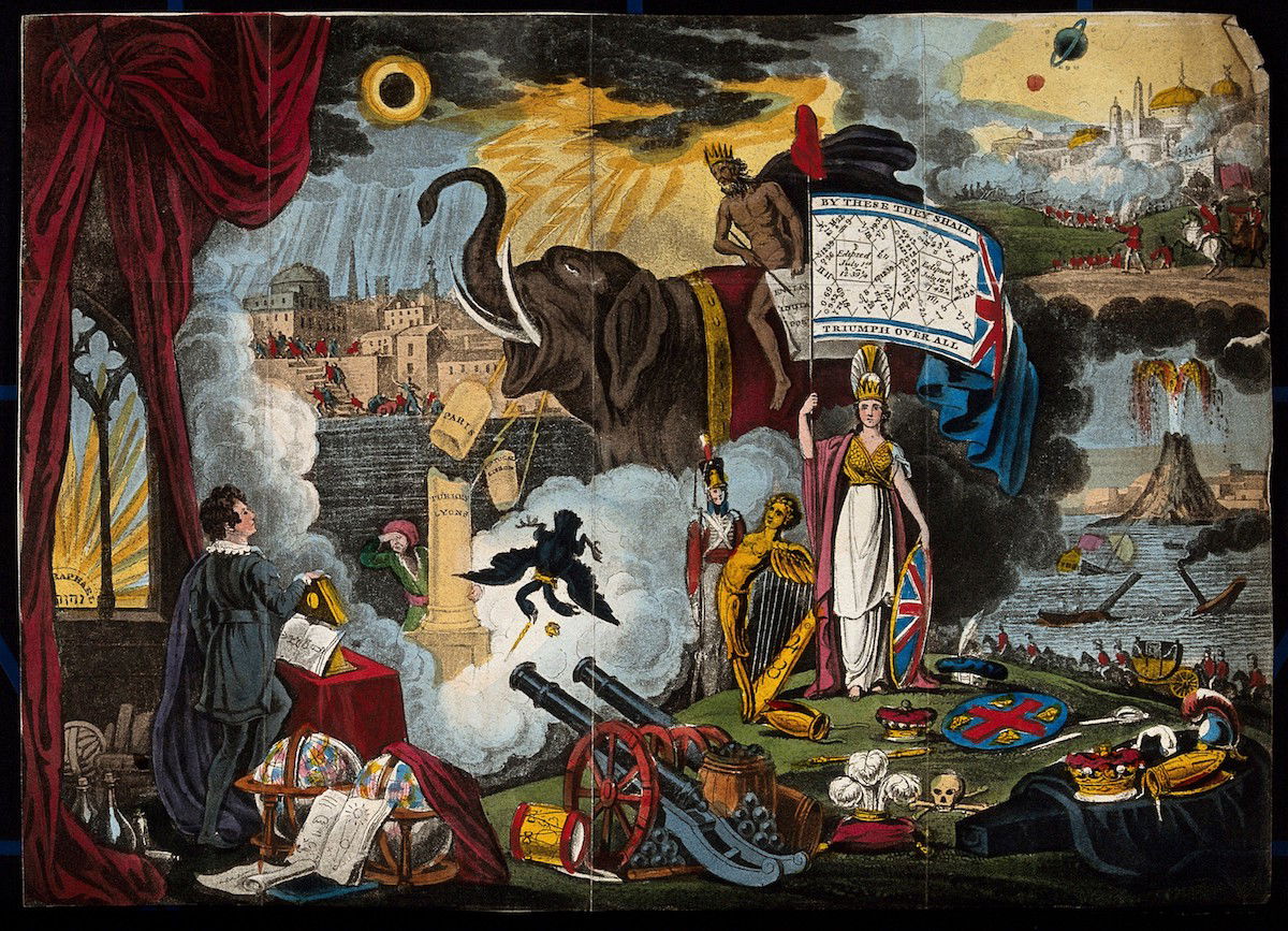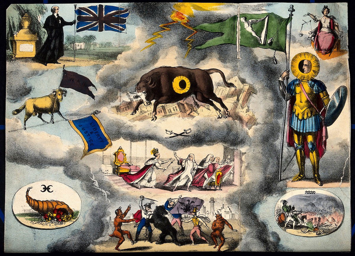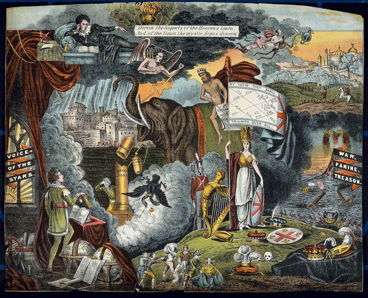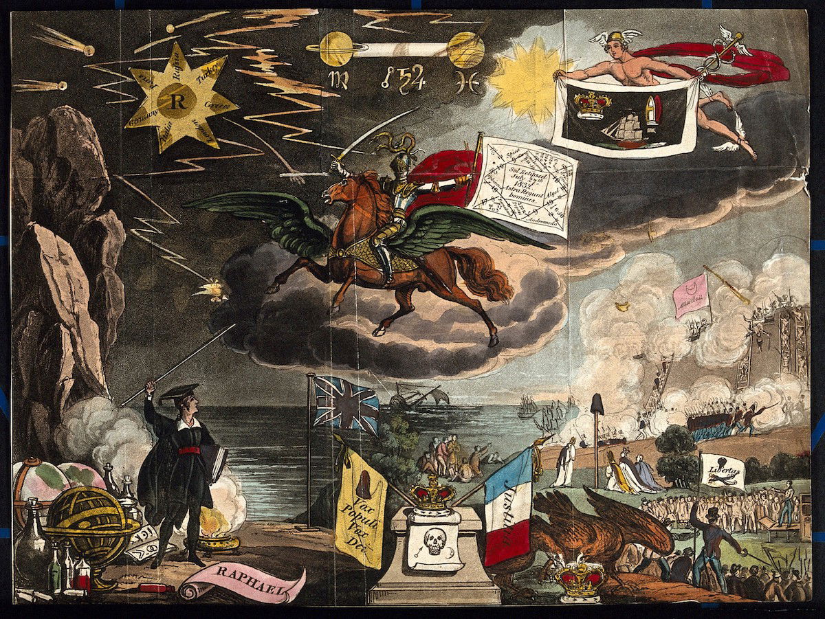 These colored lithographs, labelled as apocalyptic scenes by the Wellcome Collection, were printed in conjunction with the astrological magazine the Prophetic Messenger, aka Raphael’s Almanac, which ran from 1827 to 1861. Raphael, a pen name, was intended to invoke the power of the archangel Raphael — traditionally linked to Mercury, the messenger of the gods. It was used by several British astrologers in the first half of the nineteenth century, who together contributed to the revival of astrology.