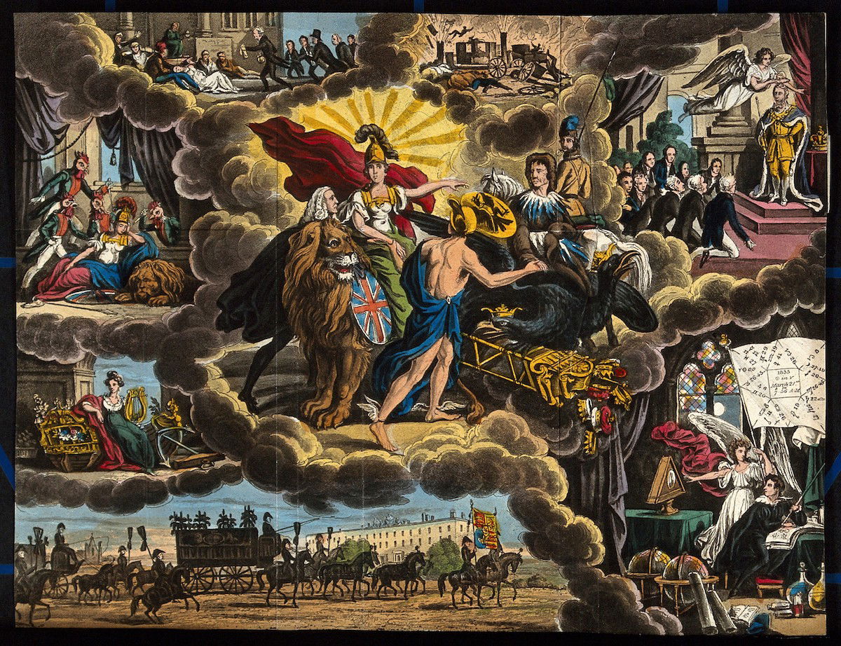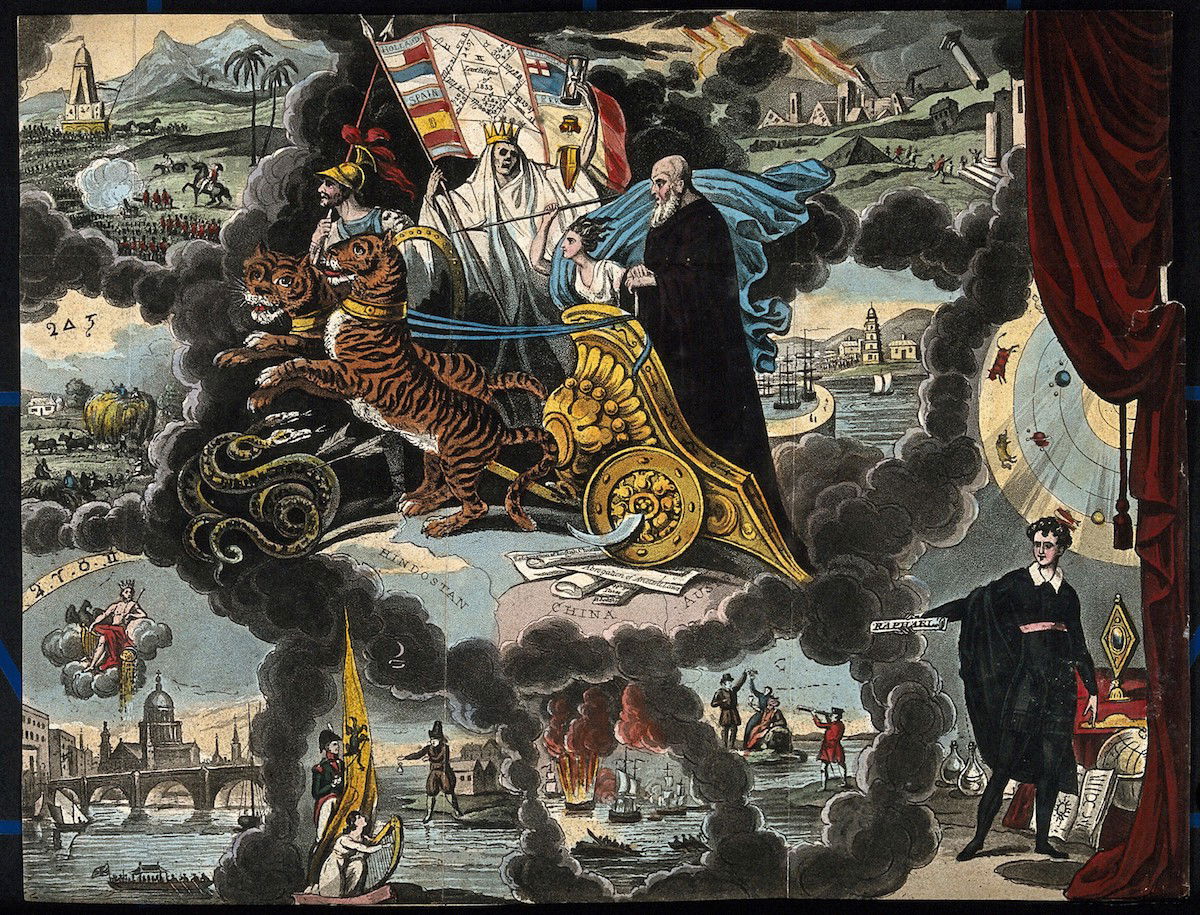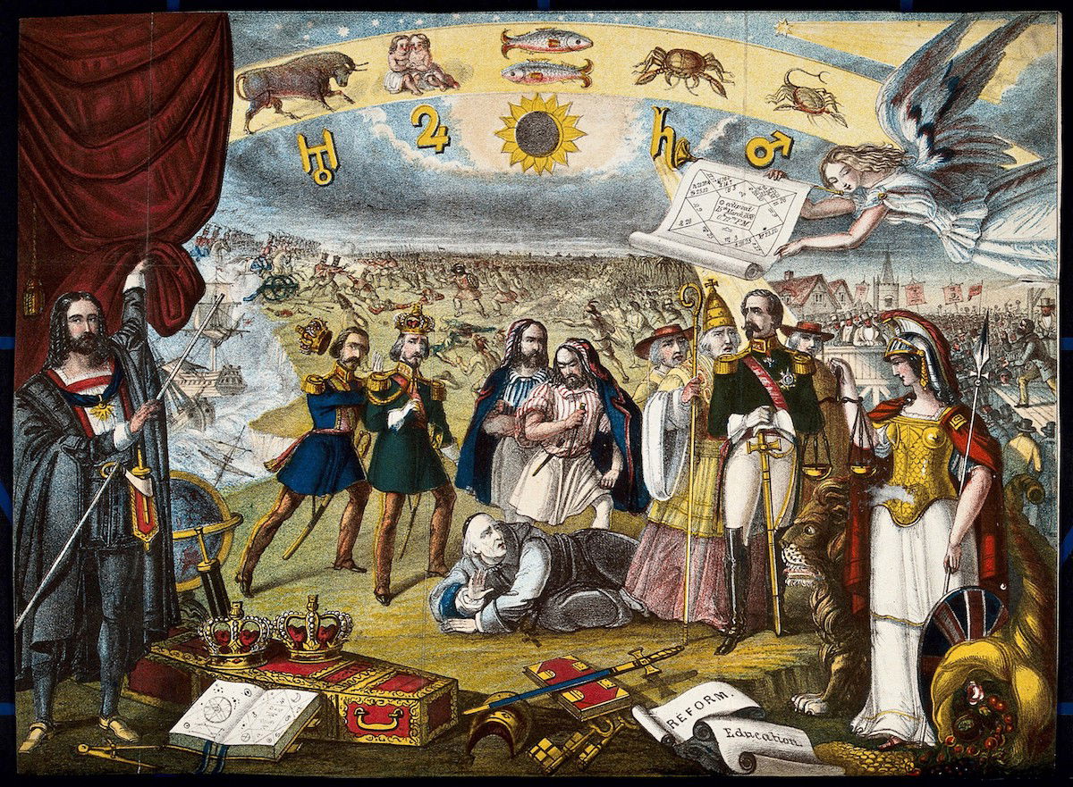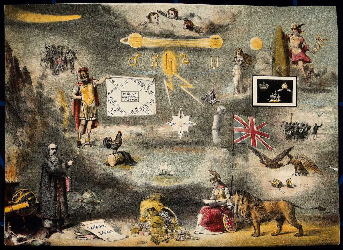 These colored lithographs, labelled as apocalyptic scenes by the Wellcome Collection, were printed in conjunction with the astrological magazine the Prophetic Messenger, aka Raphael’s Almanac, which ran from 1827 to 1861. Raphael, a pen name, was intended to invoke the power of the archangel Raphael — traditionally linked to Mercury, the messenger of the gods. It was used by several British astrologers in the first half of the nineteenth century, who together contributed to the revival of astrology.