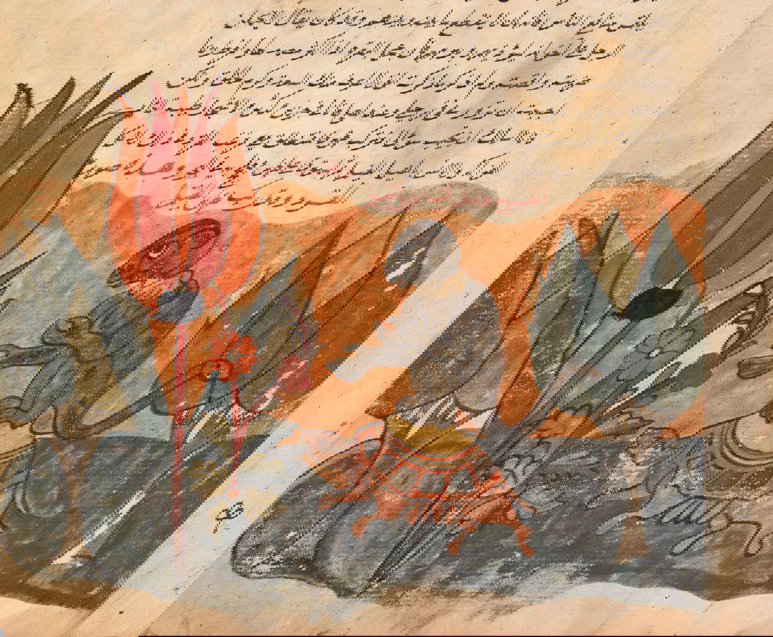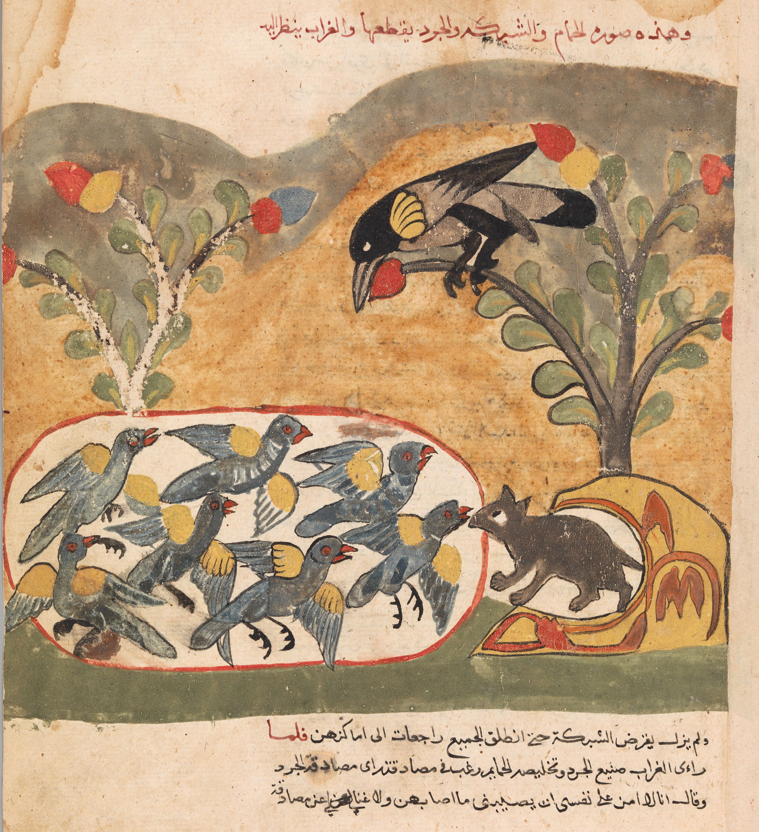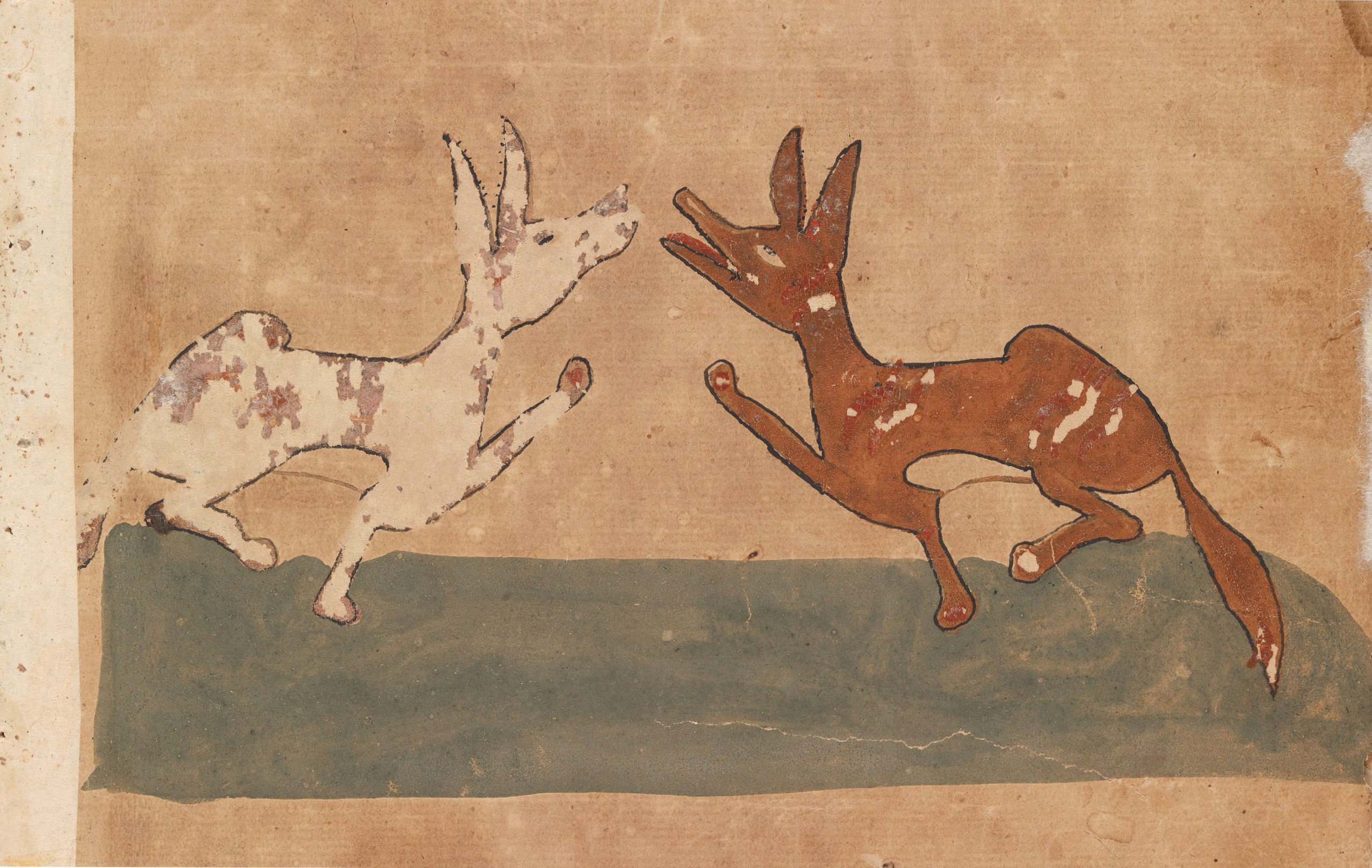Illustration of the greedy dog who, seeing his own reflection in a pond, drops the bone in his mouth in pursuit of the illusory, from an Egyptian manuscript of Kalīlah wa-Dimnah, ca. 1310.