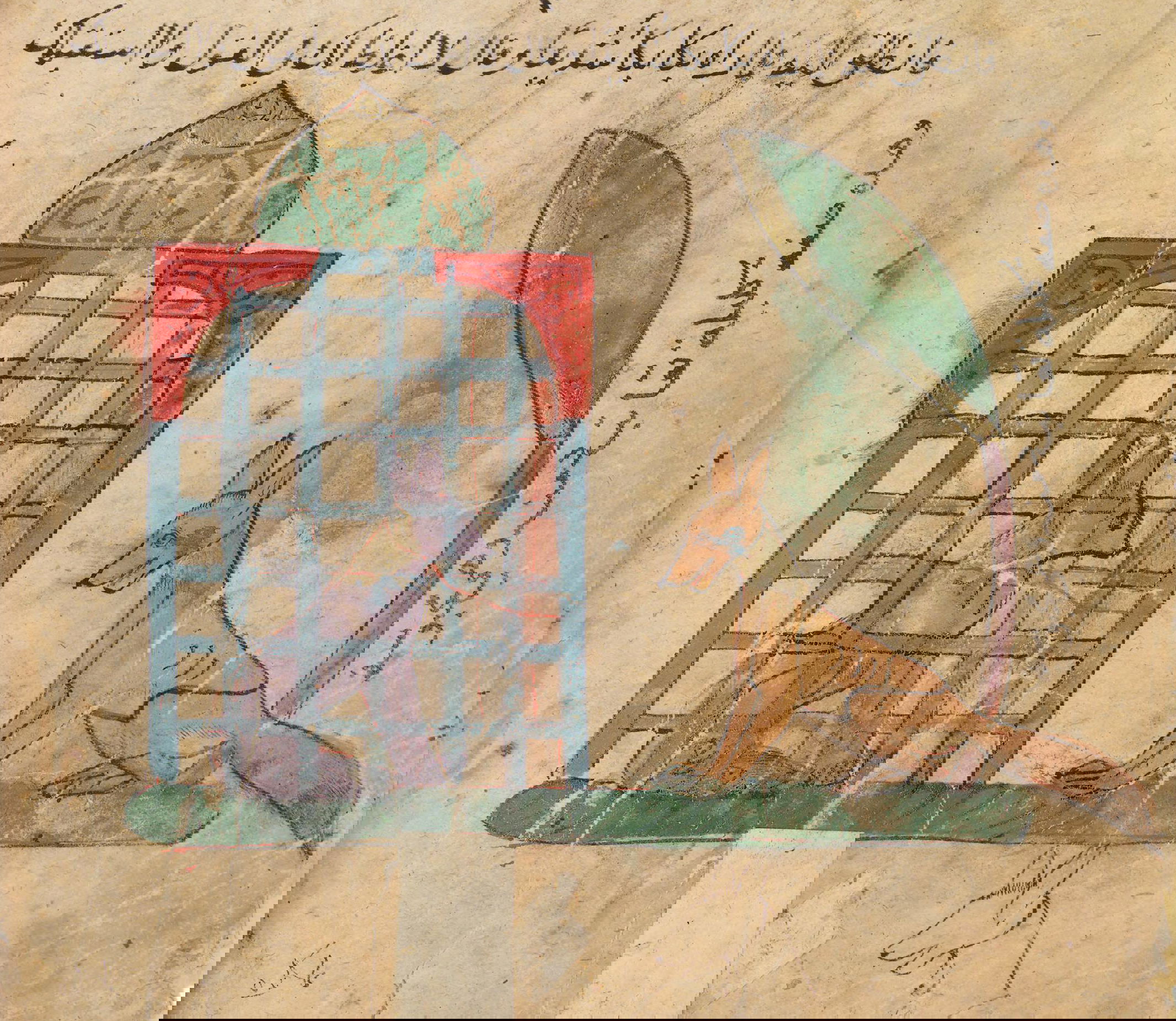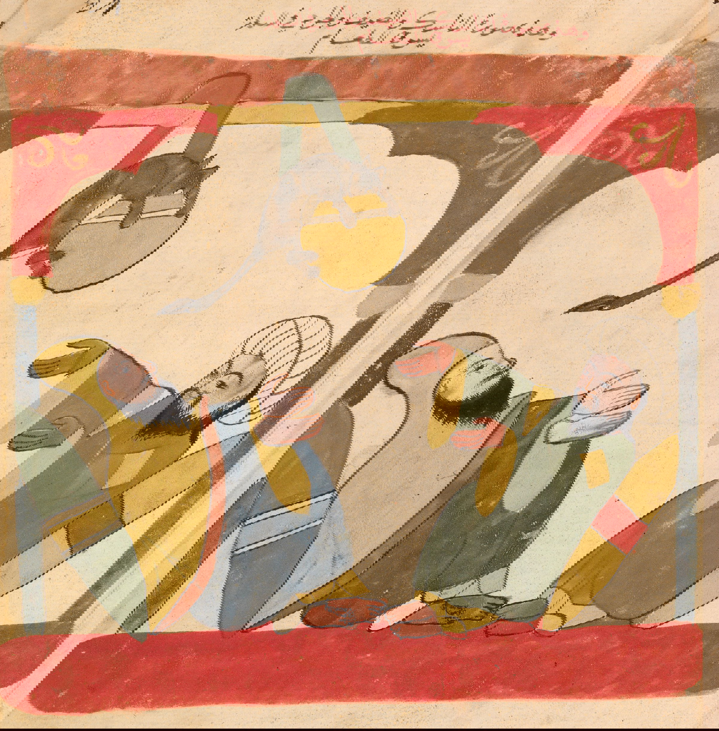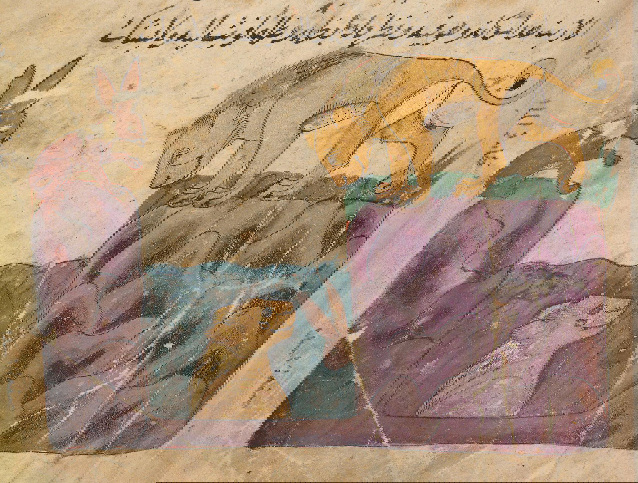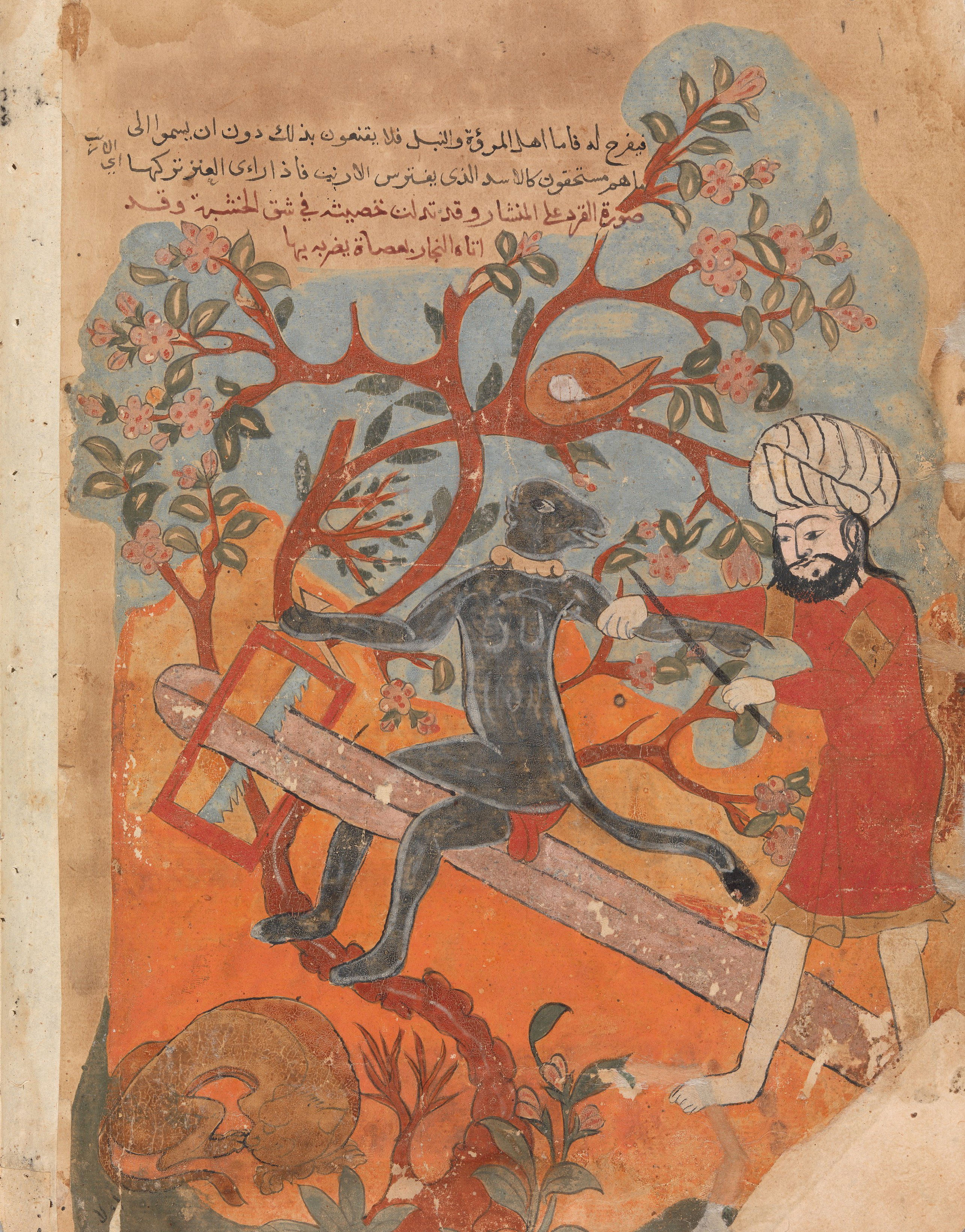 Illustration of the greedy dog who, seeing his own reflection in a pond, drops the bone in his mouth in pursuit of the illusory, from an Egyptian manuscript of Kalīlah wa-Dimnah, ca. 1310.
