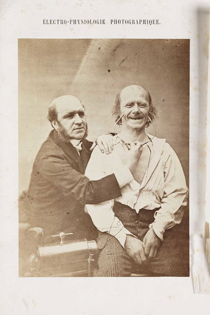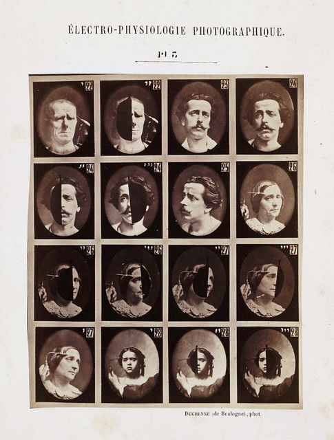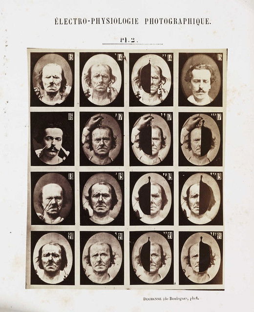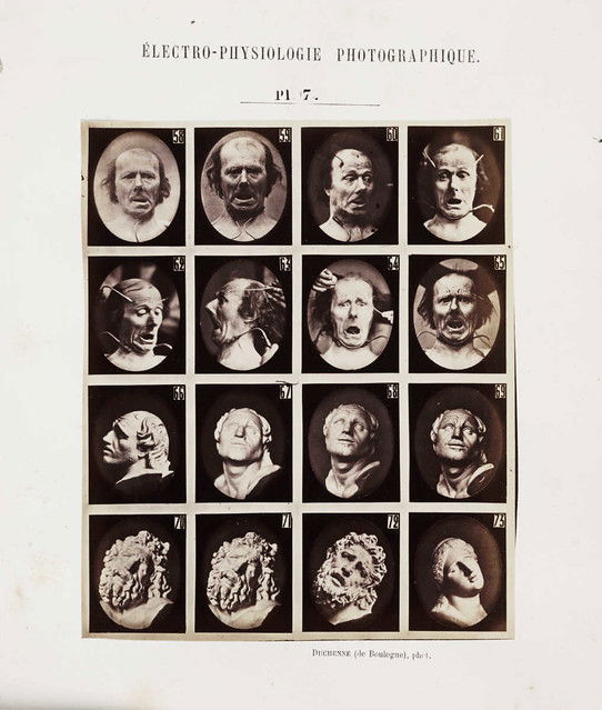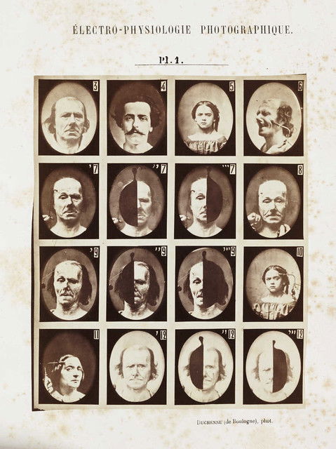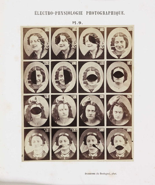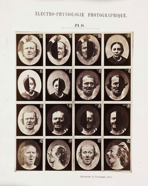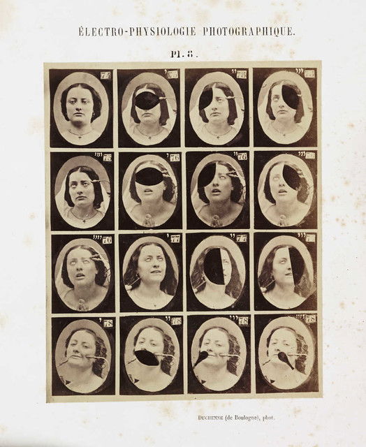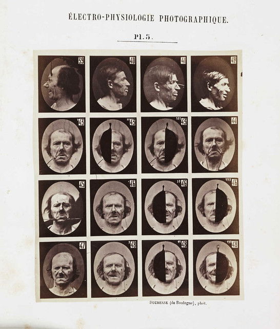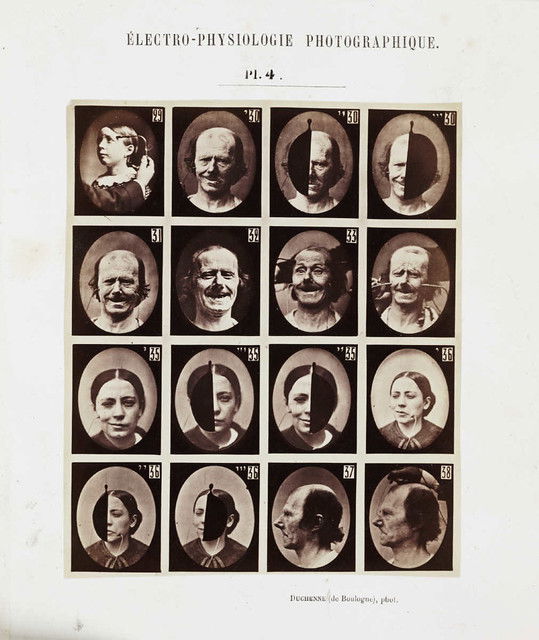 Plates from Guillaume-Benjamin Duchenne's Mécanisme de la physionomie humaine, published by Jules Renouard, Paris, in 1862. By applying electrodes to male and female volunteers, Duchenne was able to activate individual muscles in the face. He saw the human face as a map, the features of which could be codified into universal taxonomies of inner states, with each muscle representing a 'movement of the soul'. He listed 53 emotions that could be classified in terms of muscular action.