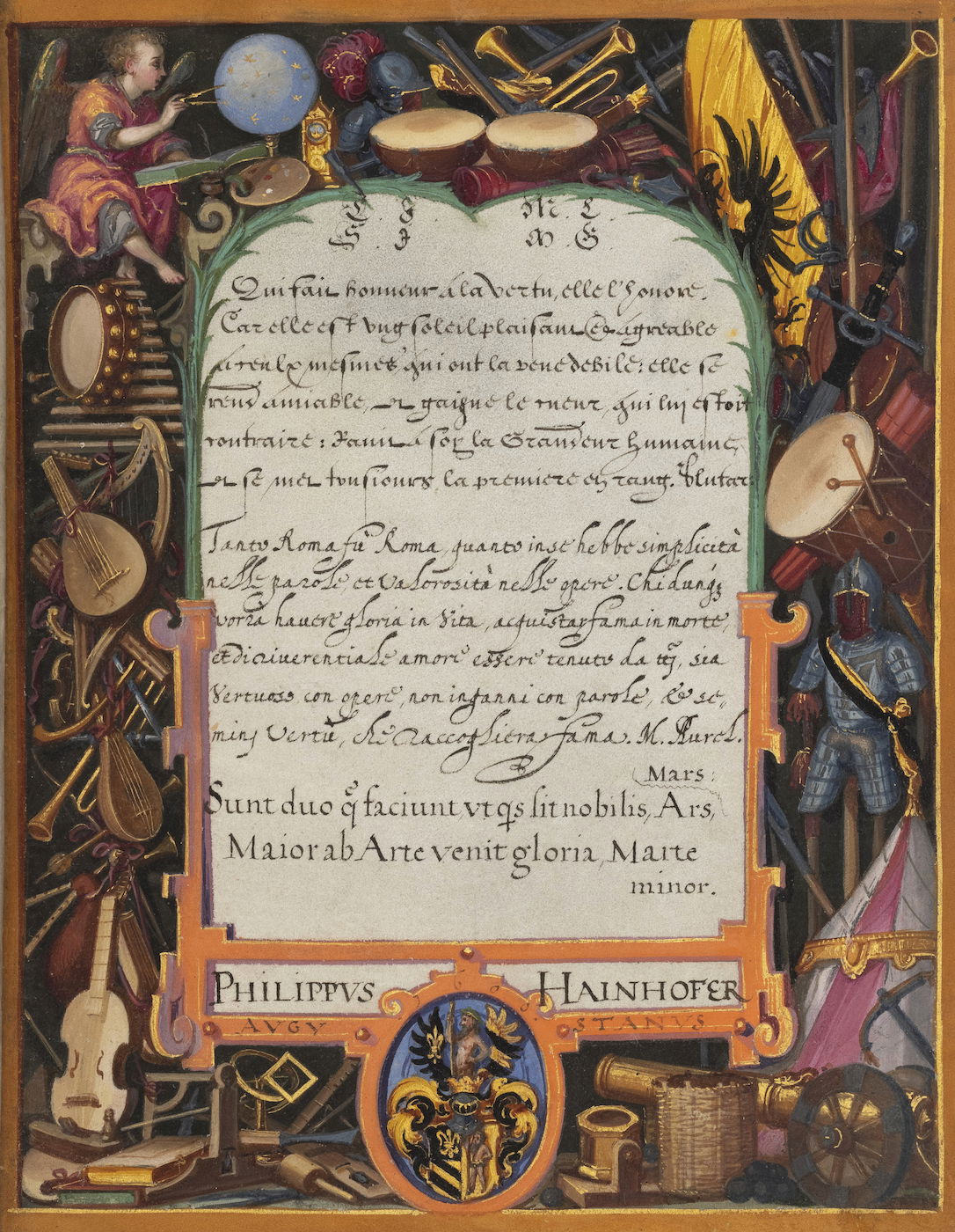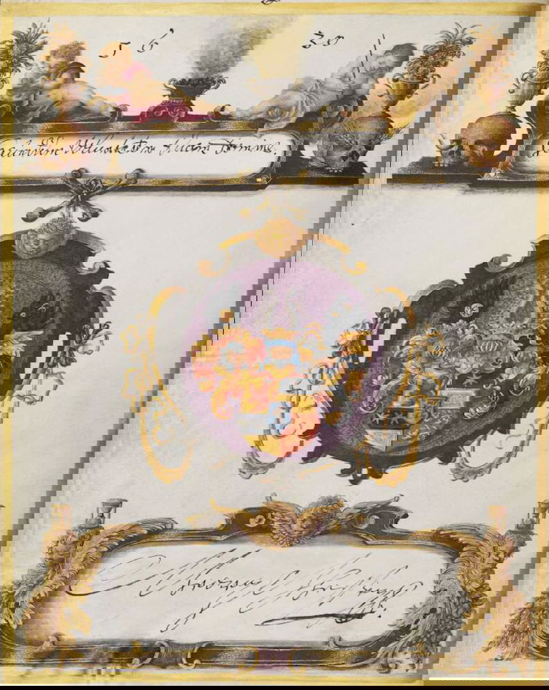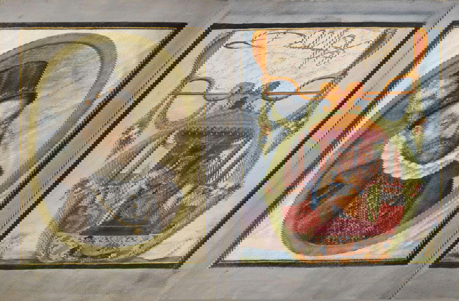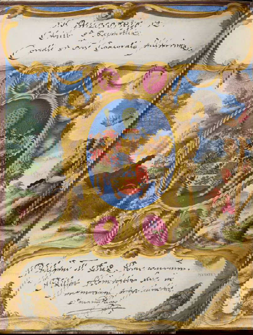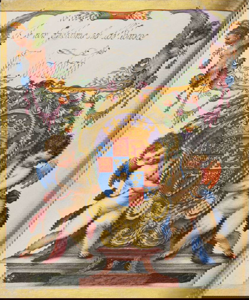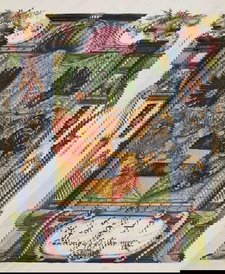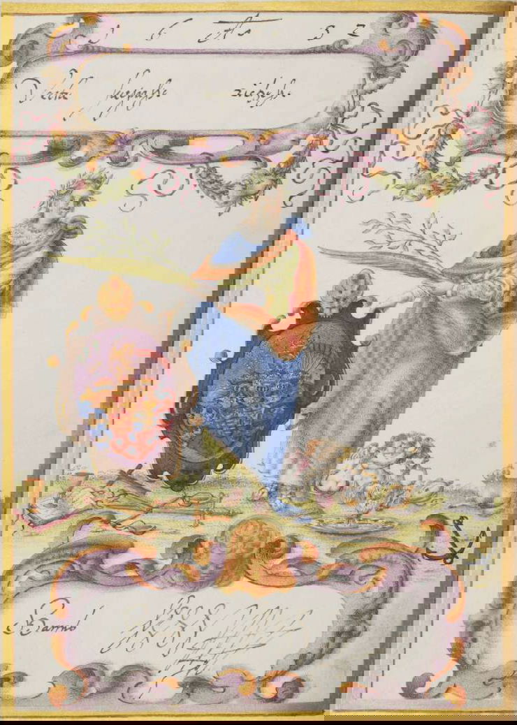 Art dealer and diplomat Philipp Hainhofer's 227-page volume collects the signatures of over seventy-five of Europe’s most notable seventeenth-century nobles. A richly illustrated album amicorum — a kind of friendship book for preserving the autographs of acquaintances — the Große Stammbuch was renowned in Hainhofer’s lifetime, becoming one of Augsburg’s must-see artworks. This vellum Kunstkammer brings together the royal, semi-divine hands of the Holy Roman Emperor Rudolf II [17], King of Denmark Christian IV [20] and Cosimo II de’ Medici [30] with exquisite drawings, a painting on silk, and embroidered panels made by dozens of artists, including Georg Behem, Tobias Bernhard, Joseph Heintz, Johann Mathias Kager, Lucas Kilian, Jacopo Ligozzi, and Anton Mozart.