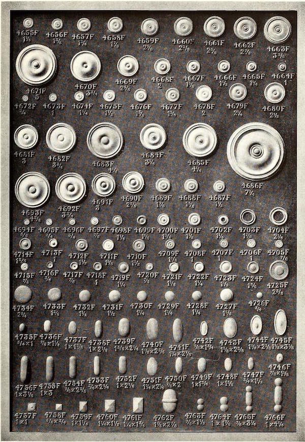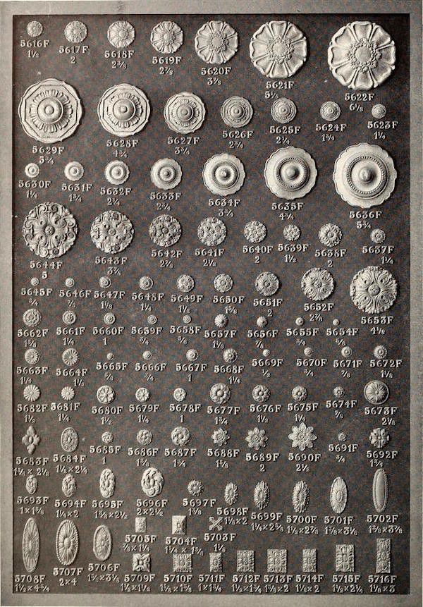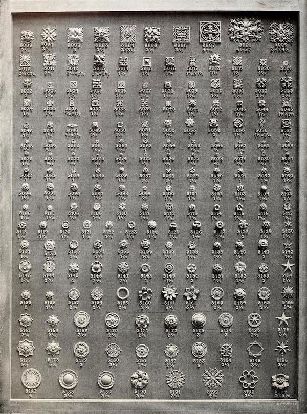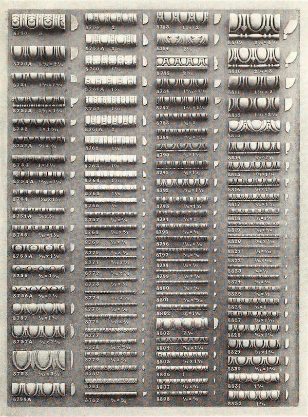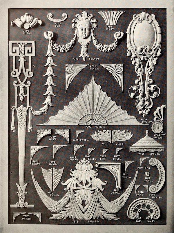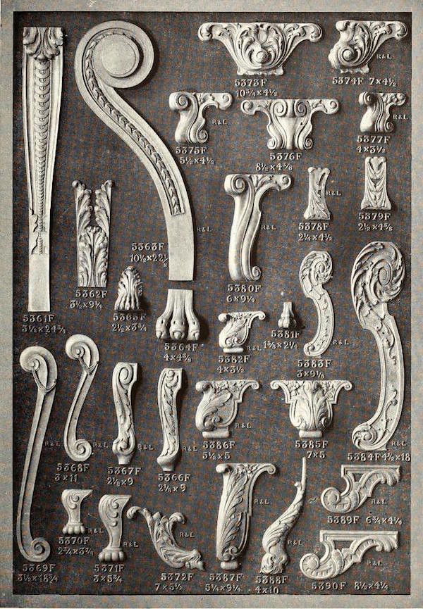 The Illustrated Catalogue of Period Ornaments Cast in Composition and Wood Fibre for Woodwork-Furniture features samples of wood carvings offered by the Decorators Supply Company of Chicago at the beginning of the 20th century. These decorative elements — so pleasingly presented in the catalogue — could be glued or nailed to furniture, ceilings, and other architectural surfaces. The catalogue would have been used not only to display the Company’s selection of ornaments, but also to allow customers to request personalised designs. The Decorators Supply Corporation of Chicago is still operative to this day and it specializes in the production of “composition carvings”, also present in the catalogue. These are ornaments which are cast from mixtures containing, among other materials, pitch, oil, and clay.