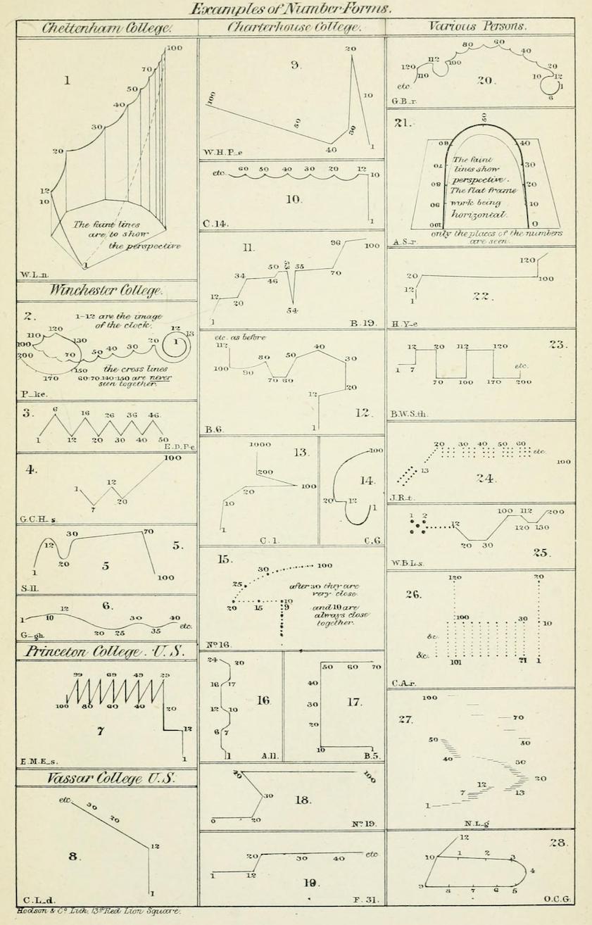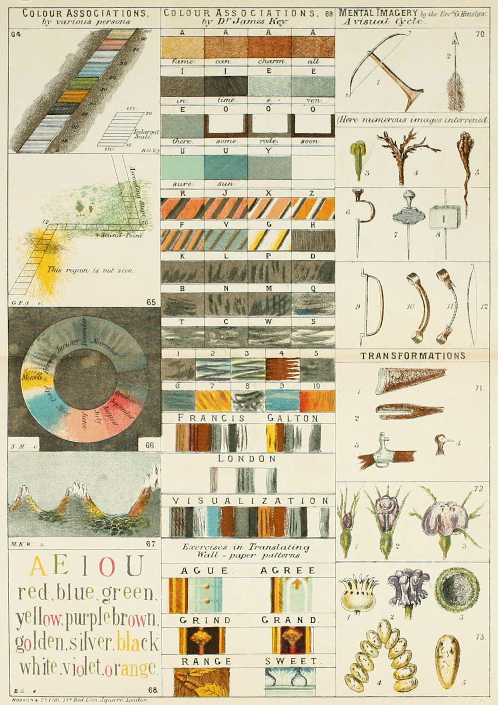 Victorian polymath Francis Galton is known as the inventor of many things: the world’s first weather and isochronal climate maps; the statistical concepts of correlation and regression toward the mean; the ultrasonic whistle; and — with a more harmful afterlife — many aspects of the field he named “eugenics”, as well as its supposed application to criminology. An indefatigable student of physical appearance, who is remembered (and often reviled) for a fanatical dedication to hegemonic British imperial norms of behavior and appearance, Galton also turned his curiosity to the inner world and its perceptions. Pioneering research into the visual-spatial complex known as “number form” — in which individuals experience numbers as possessing distinct spatial properties — Galton published the very first color plate of synaesthetic…