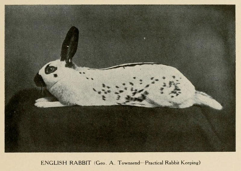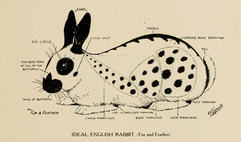 The image above details the aesthetic requirements for achieving the "Ideal English Rabbit", the benchmark of perfect markings for a particular breed of rabbit first developed in the middle of the nineteenth century. The diagram reproduces one of a series of eight images created by the English artist Ernest George Wippell for Fur and Feather magazine in 1893, two years after the founding of the English Rabbit Club (though some sources give the date for Wippell's drawings as 1903). In 1927, Fur and Feather published the colour print pictured below in their "ideal breed" series.