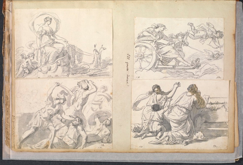 Selections from "Album 11", a sketchbook belonging to the French neoclassical painter and revolutionary Jacques-Louis David. The sketches are from his student years in Rome in the 1770s, a time in which he became obsessed with the ancient and Renaissance art to be found in the city. During this period he made well over 1000 "Roman sketches" and relied on them as a visual resource throughout his career. Once returned to Paris, David dismantled his sketchbooks and reorganised the leaves into albums according to type, numbering 12 in total. This 11th album - held by the Getty Research Institute and included in The Getty's Open Content program - is mainly concerned with studies of the bas-reliefs and sculptures from prominent Italian collections, including the ancient…
