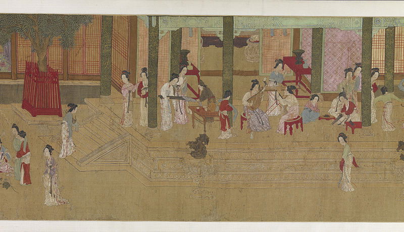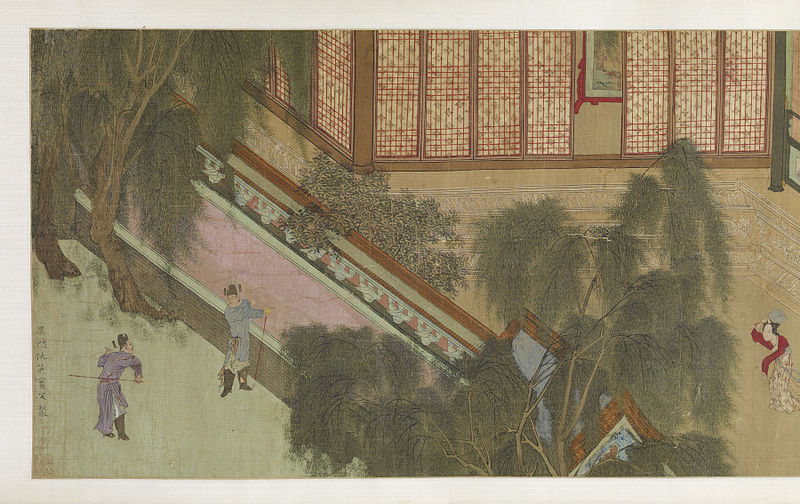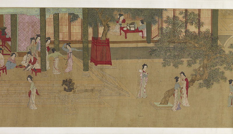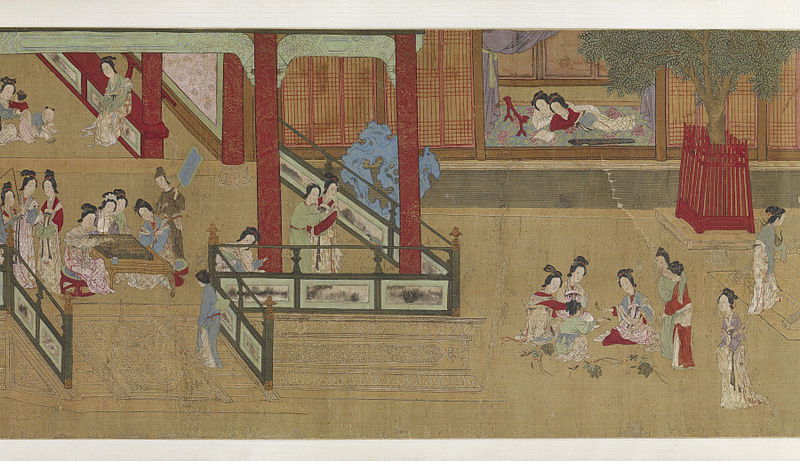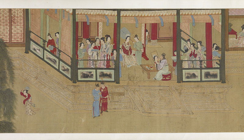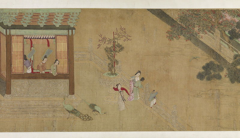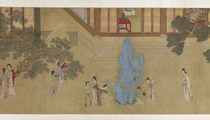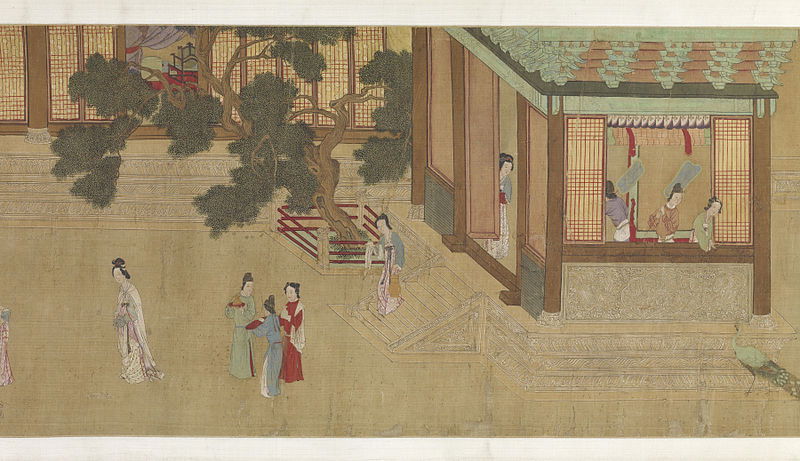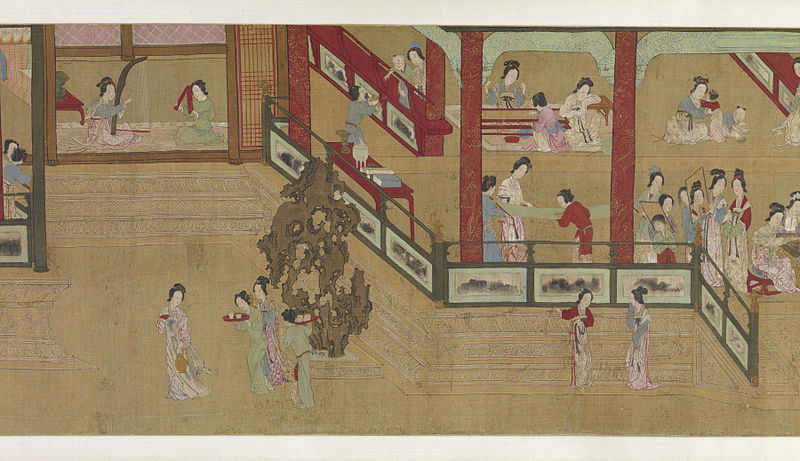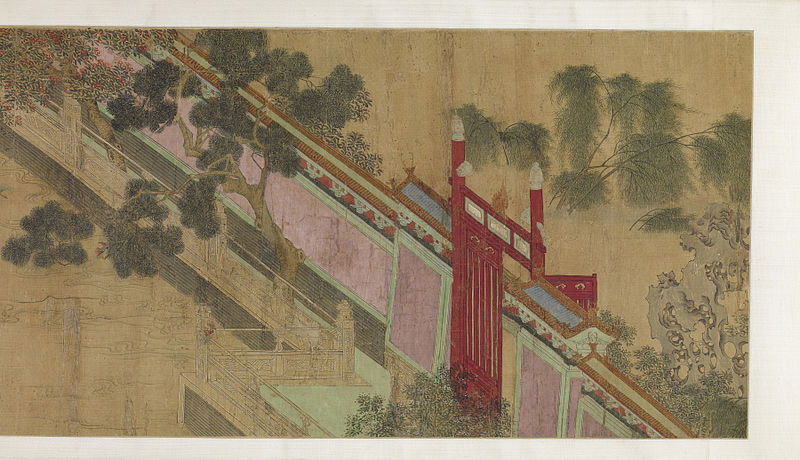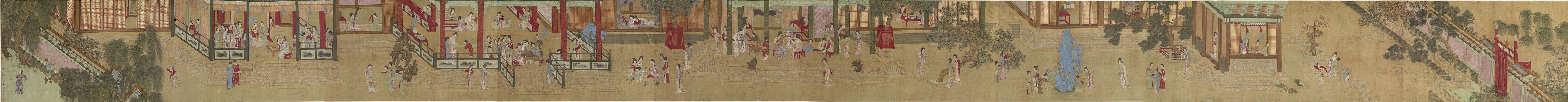 A 17th century copy of Spring Morning in the Han Palace, a famous handscroll by the 16th century Ming Dynasty artist Qiu Ying [Ch'iu Ying]. It depicts imperial life at its most idyllic. During the years of the Qing [Ch'ing] Dynasty, copies such of this of Qiu Ying's painting were popular because they were considered an excellent guide to elegant behaviour. (Above image stitched together from images, below, in the collection of the Walters Art Museum).