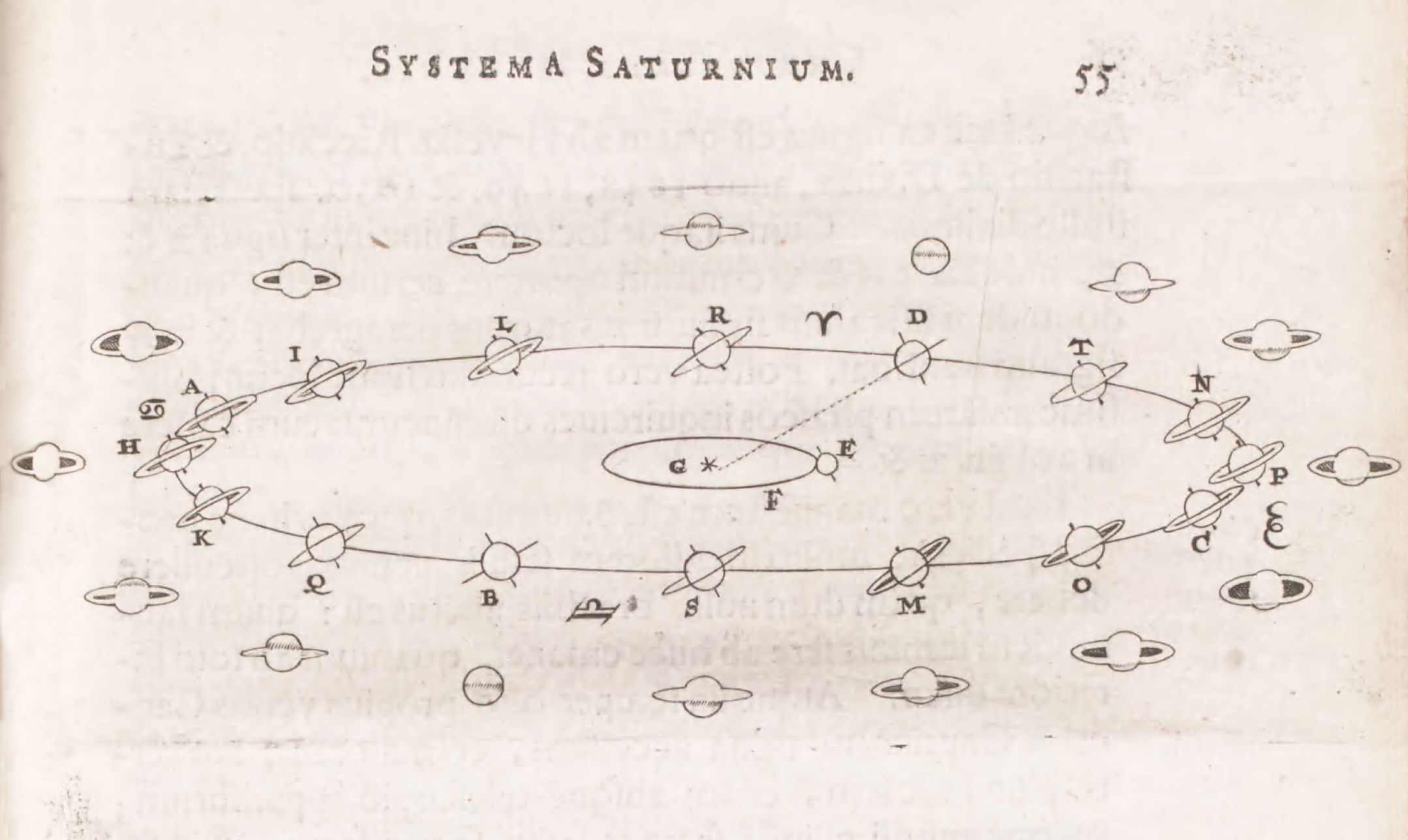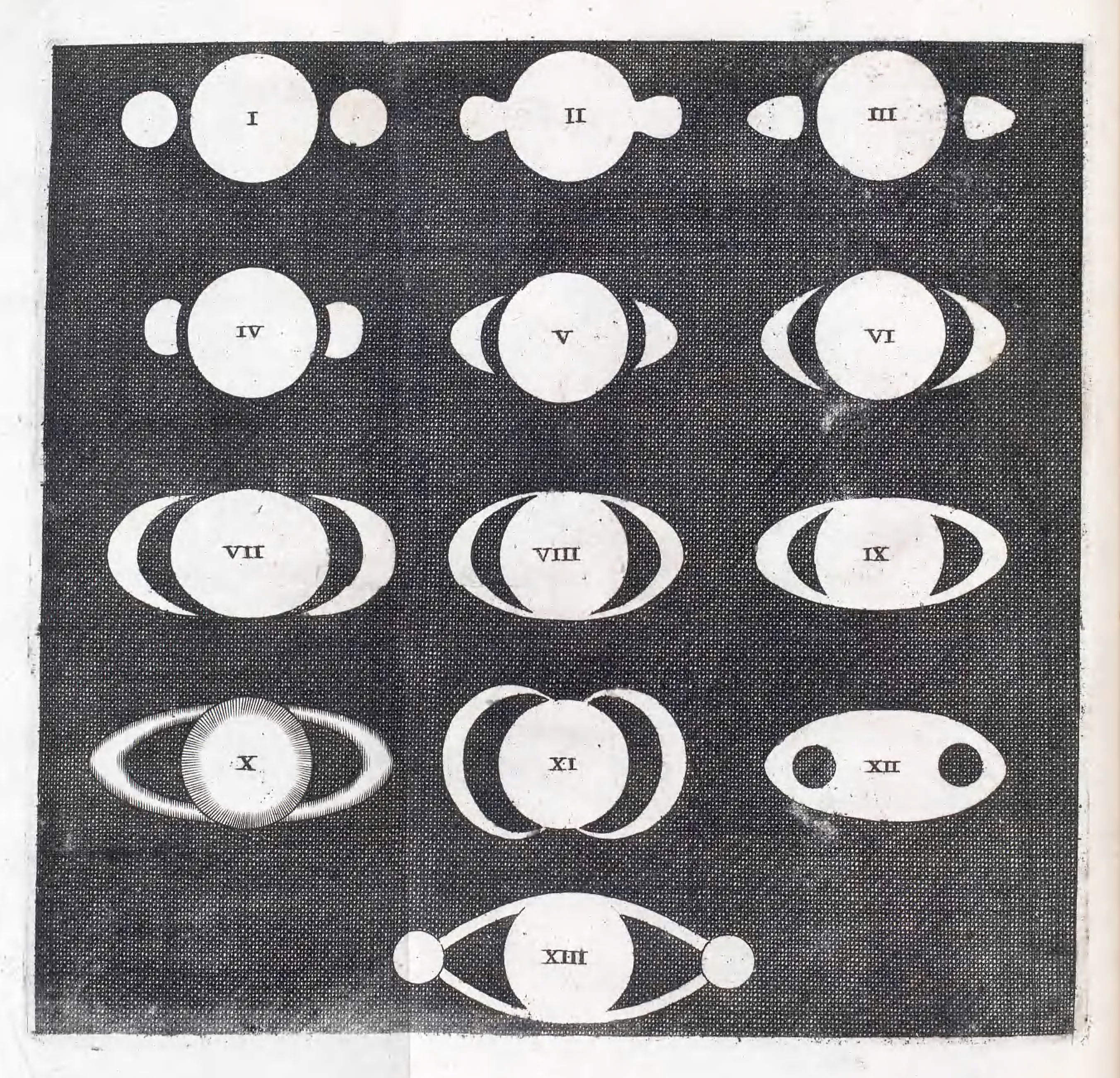 Diagram from Huygens' Systema Saturnium (1659) showing why the appearance of Saturn's ring changes as it orbits the sun.
