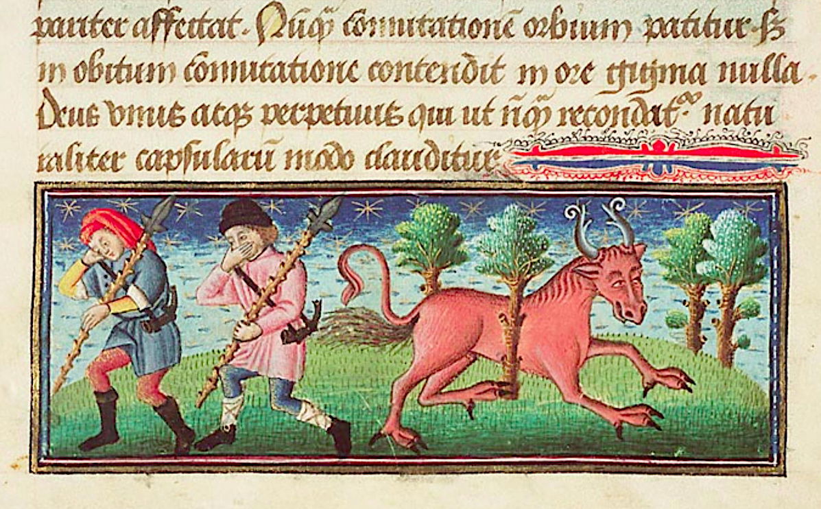 When it comes to self-defense, skunks and spitting cobras have nothing on the bonnacon. If threatened, it fled. While fleeing, it defecated. Violently. According to Pliny the Elder, the excrement voided the animal’s body with such explosive force that it could hit targets more than a football pitch away. Contact with its dung was said to burn like a kind of fire, scorching hunting dogs and anyone not equipped with protective gear. (There is some uncertainty whether the weapon was liquid or gaseous, super-heated or acidic.)