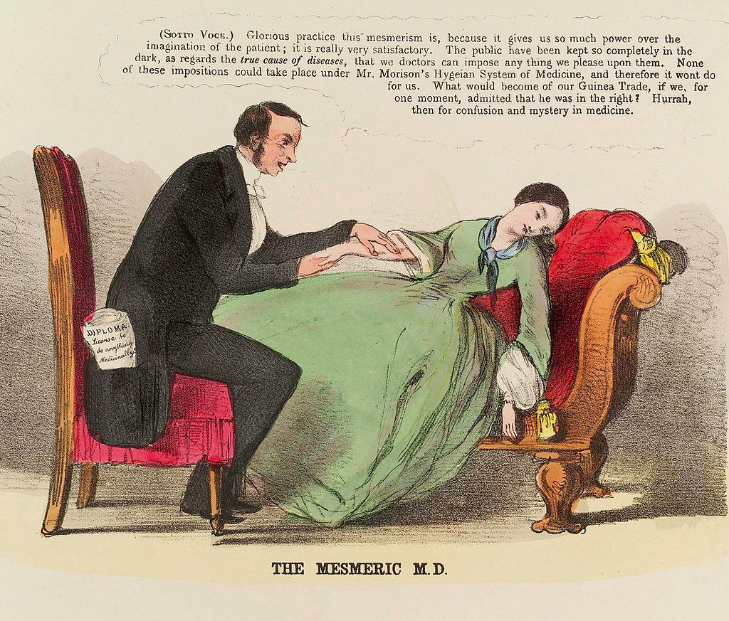 A mesmeric physician taking advantage of his female patient, 1852. In his pocket can be seen a diploma reading "License to do anything medicinally".