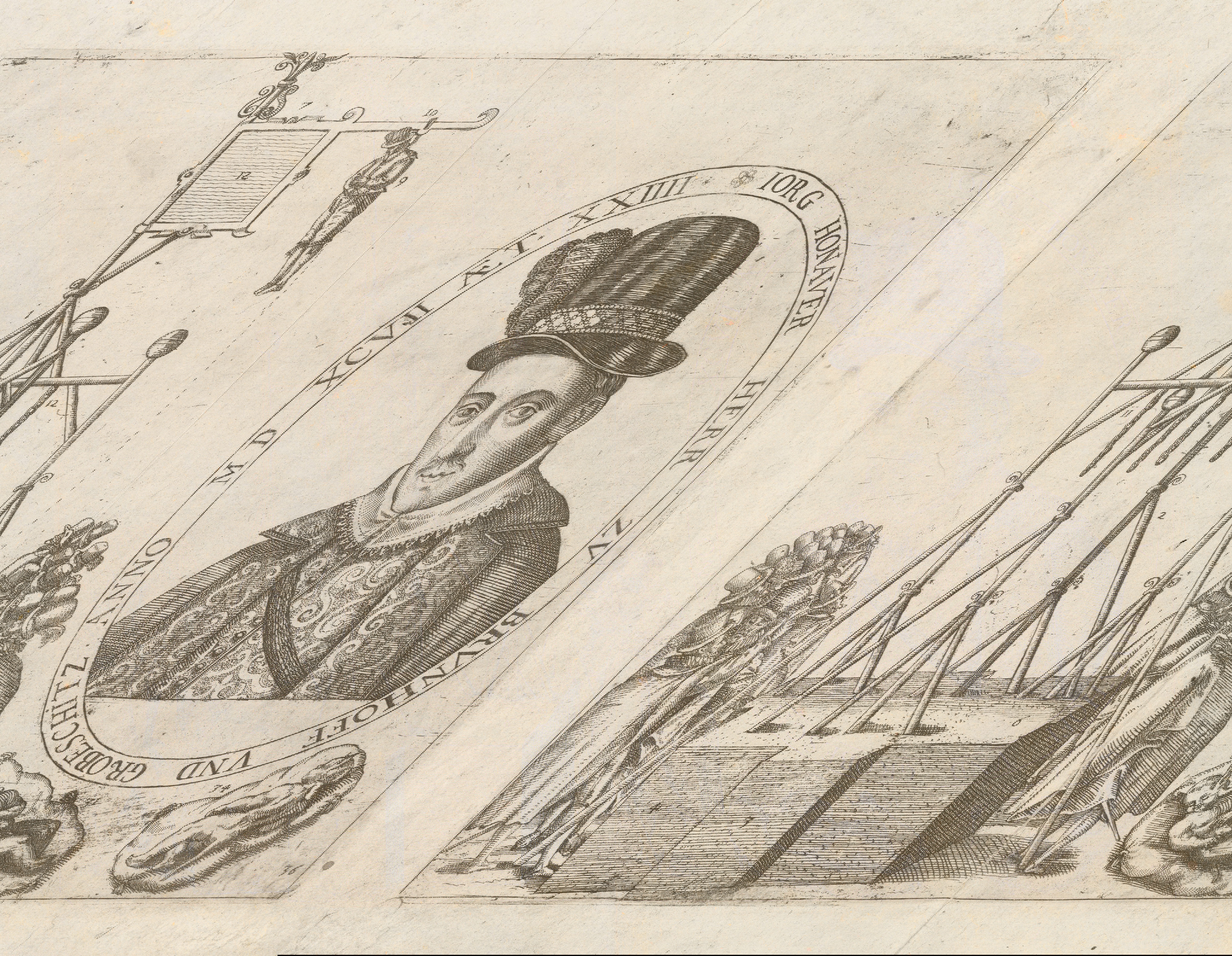 The man in the oval frame here is Georg Honauer. On the left, we see his unusual execution. A Latinized inscription gives his pretended noble alias, Lord of Brunhoff and Grobeschütz, along with the year 1597 and his age: twenty-four years old. Honauer is richly dressed in an embroidered tunic and is wearing an extravagant plumed hat. Two little devils repose on cushions beneath him.