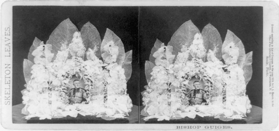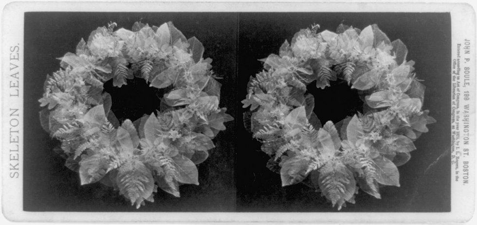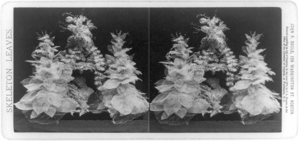 A series of elaborate "skeleton leaf" arrangements, from the photographic studios of John P. Soule which stood on Washington Street in Boston from 1861 to 1882. As well as producing many pictures of Boston's buildings, notable events (such as the 1869 National Peace Jubilee and the great fire of 1872), carte-de-visite portraits etc., Soule also produced these so called "Skeleton Leaves". As well as comprising wreath shapes and crosses the leaves also served as elaborate frames for the portraits of individuals which were sometimes embedded within them. The process of drying out leaves in such a way was very popular at the time, with whole books being published that were devoted to the subject such as Phantom Flowers, a treatise on the art of producing