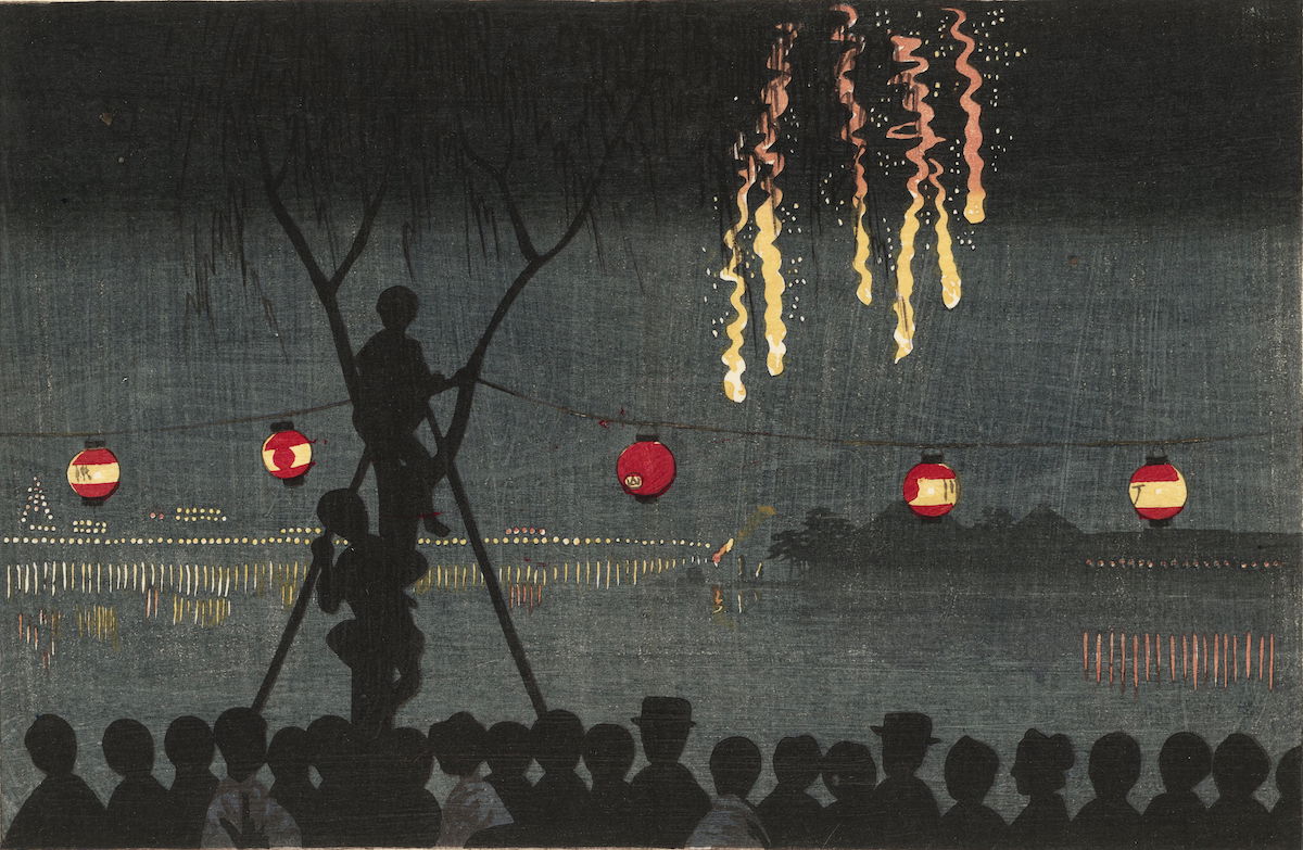 Spectators, at the edge of the pond, under a garland of lanterns, watching fireworks explode over the Benten shrine.