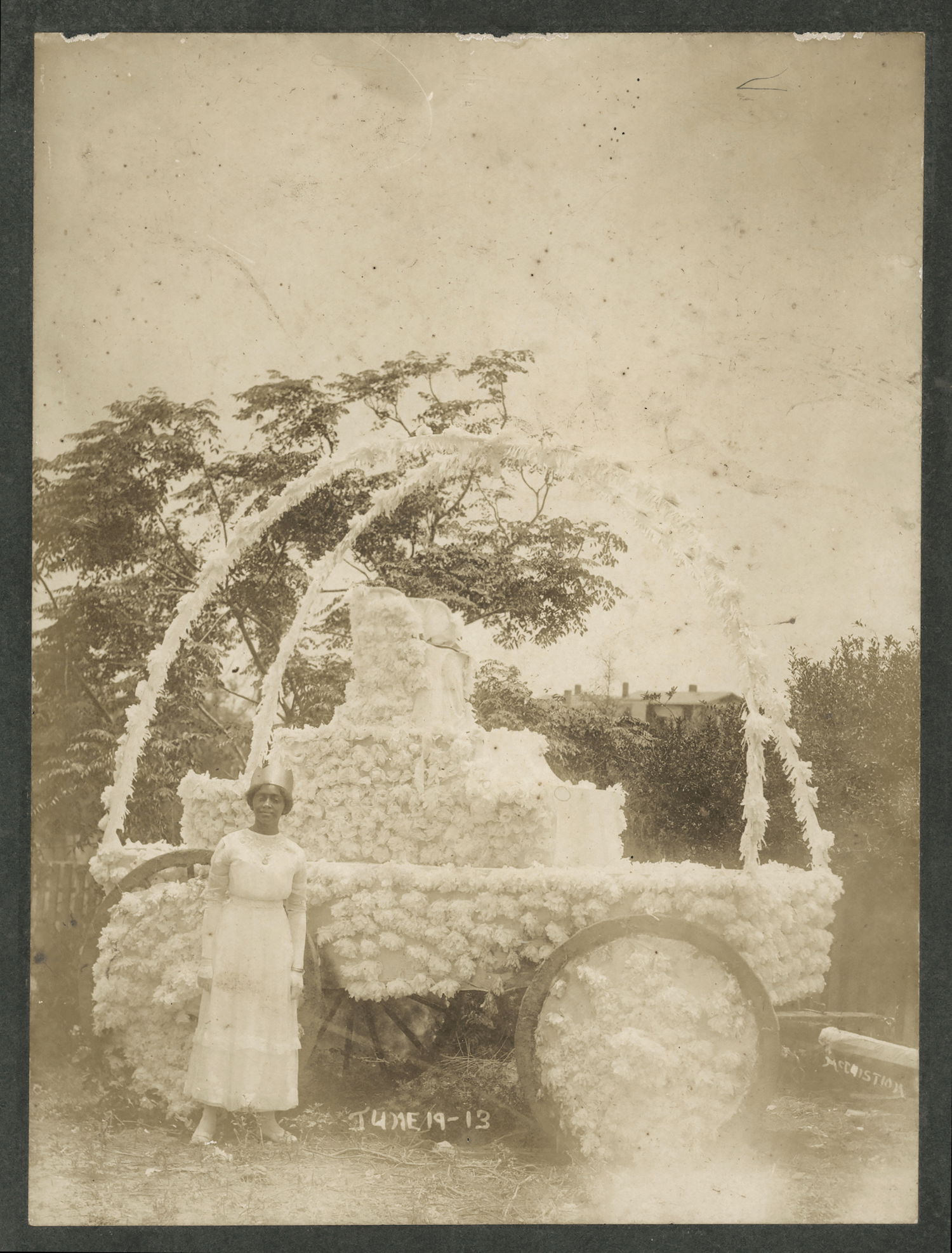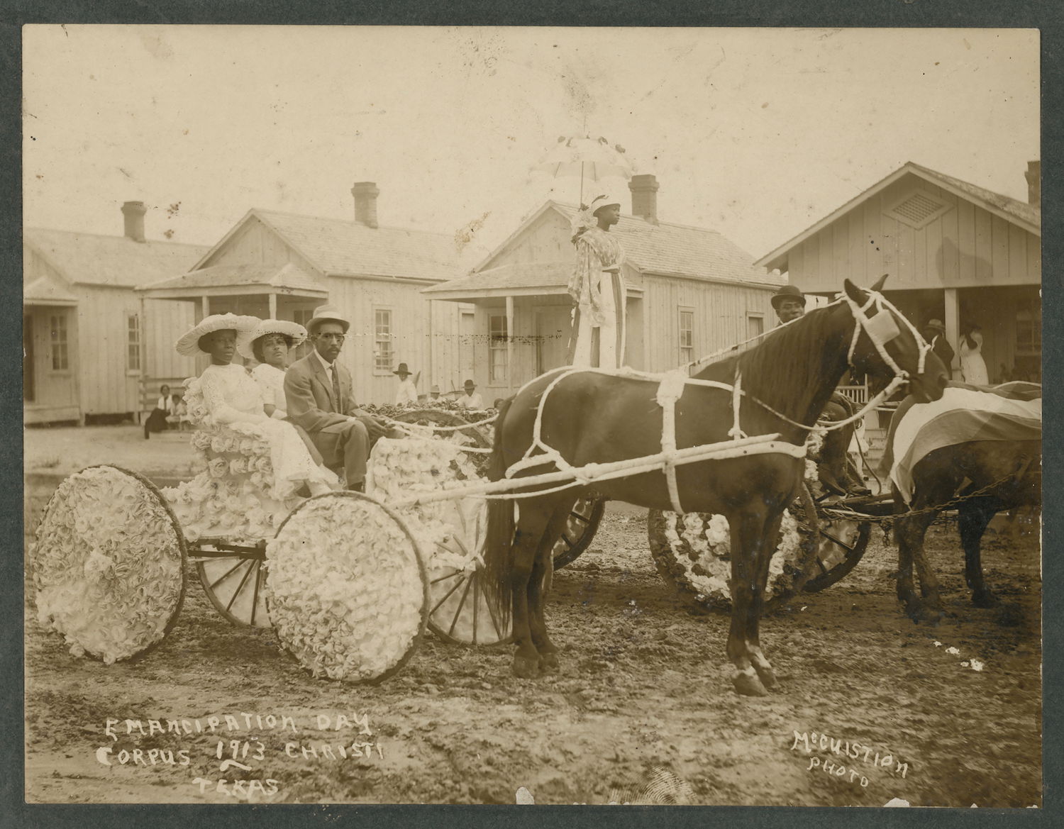 Mr. Daniel. N. Leathers Sr., sat in a decorated carriage. Leathers, born in North Carolina in 1855, moved to Corpus Christi and became a successful merchant and was involved in state politics. A public housing development in Corpus Christi named in his honor was destroyed in 2017 to make way for the Harbor Bridge. Photograph by George McCuistion of Juneteenth celebrations in in Corpus Christi, Texas, 1913.