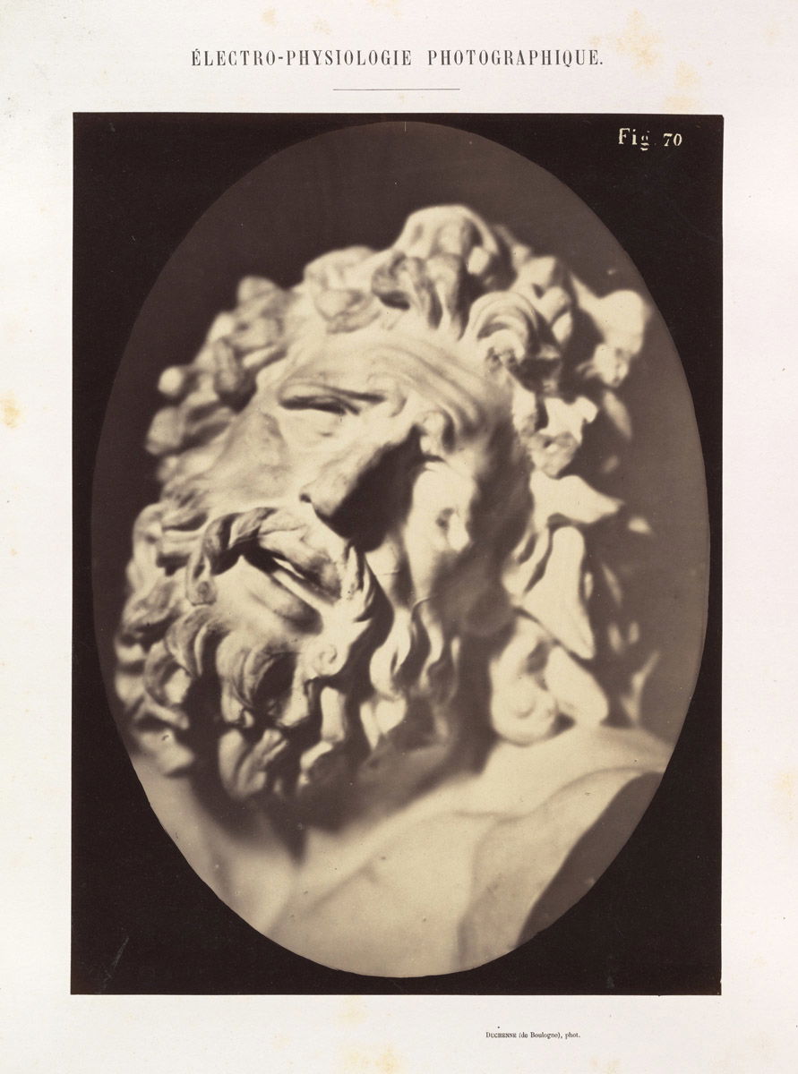Figure 70 from Duchenne's 1862 monograph Mécanisme de la physionomie humaine, a pioneering work exploring the muscles of facial expression, work which involved the triggering of muscular contractions with electrical probes.