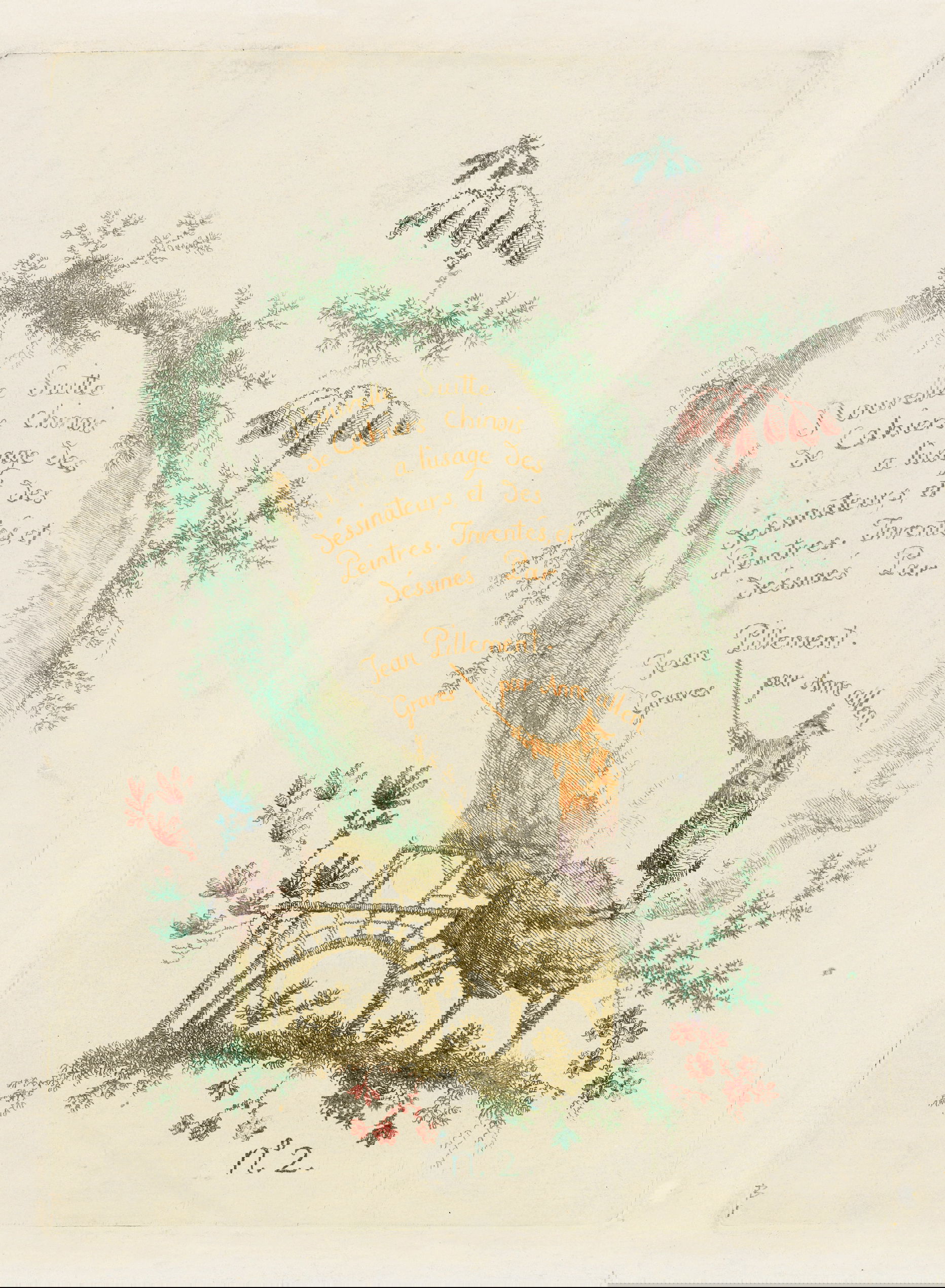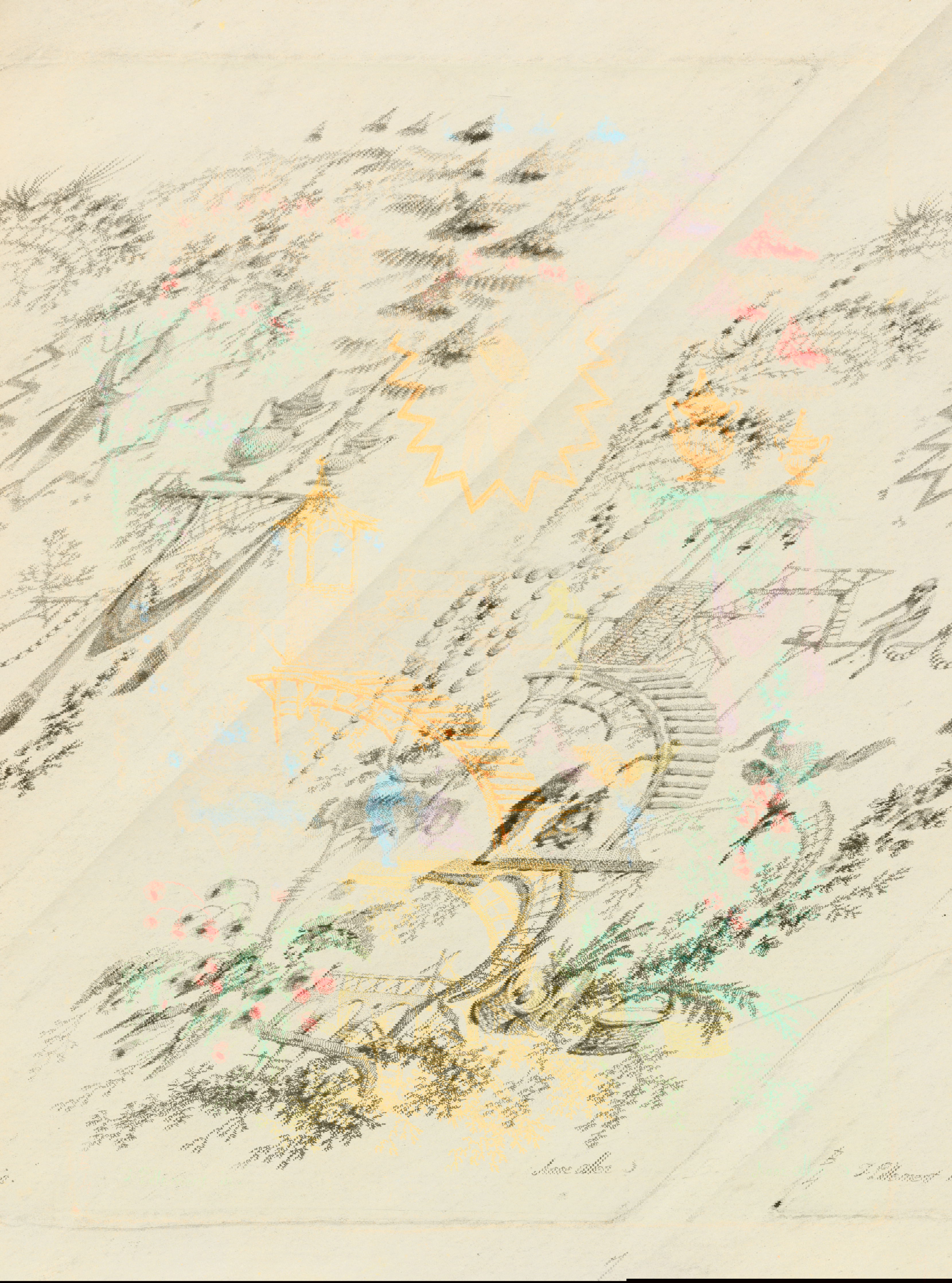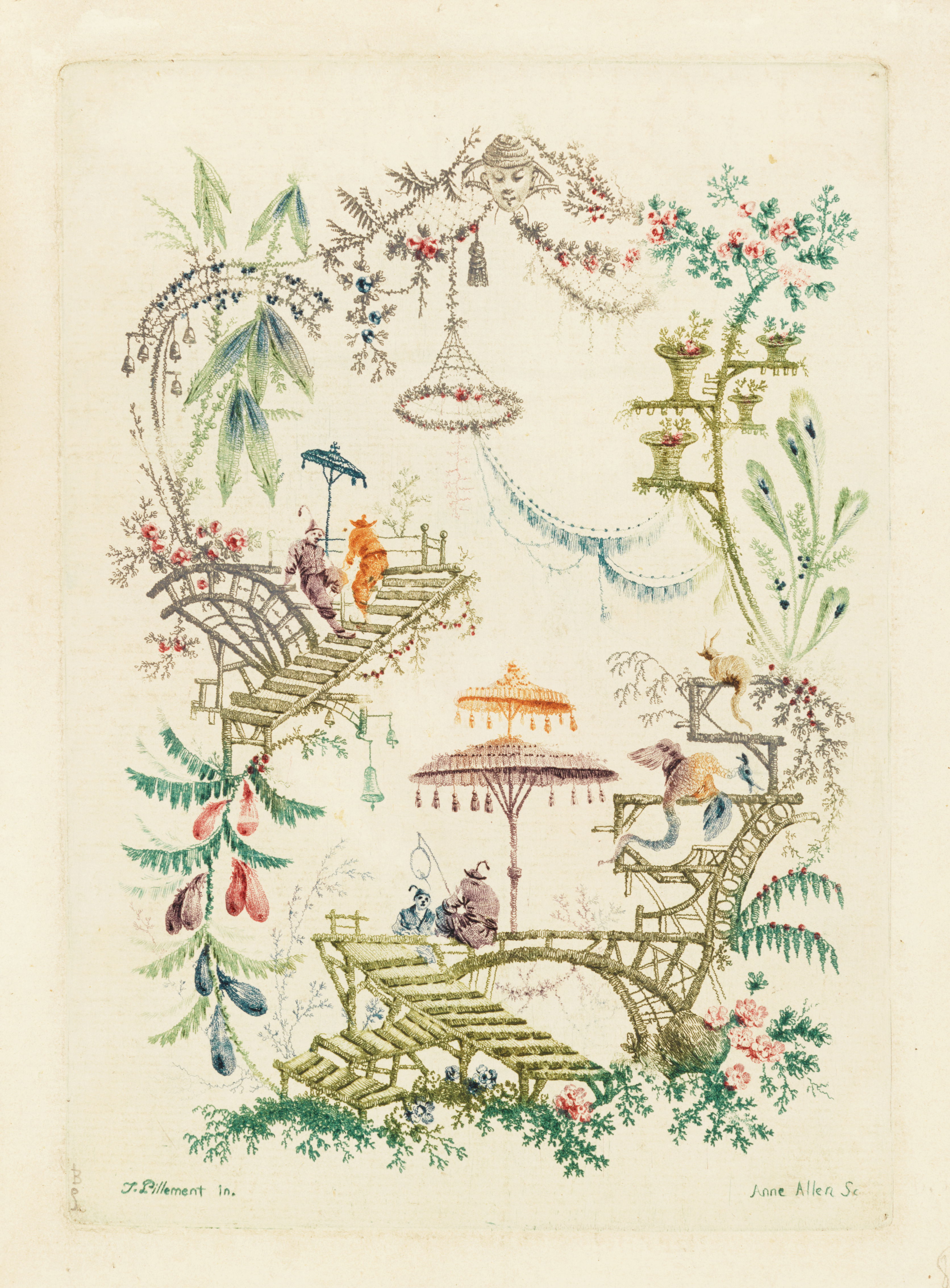 Gravity is an intermittent force in Jean-Baptiste Pillement’s designs for “New Suite of Chinese Arabesques”, etched by his wife, Anne Allen. Festoons drape and fishing lures drop within floral microcosms populated by tiny Orientalized figures and fantastical, Boschian critters. But the architectural structures — stairs, pagodas, pavilions, and bridges — seem enchanted, hovering in air or perching improbably on frothy foliage. The garden settings themselves, loosely framed by fantastical botany, float above, or beyond, our own grounded reality. Pillement’s knack for creating visual confections that facilitate intellectual and aesthetic escape sustained his success as a designer and proponent of the rococo decorative idiom, which he popularized far beyond its native France.