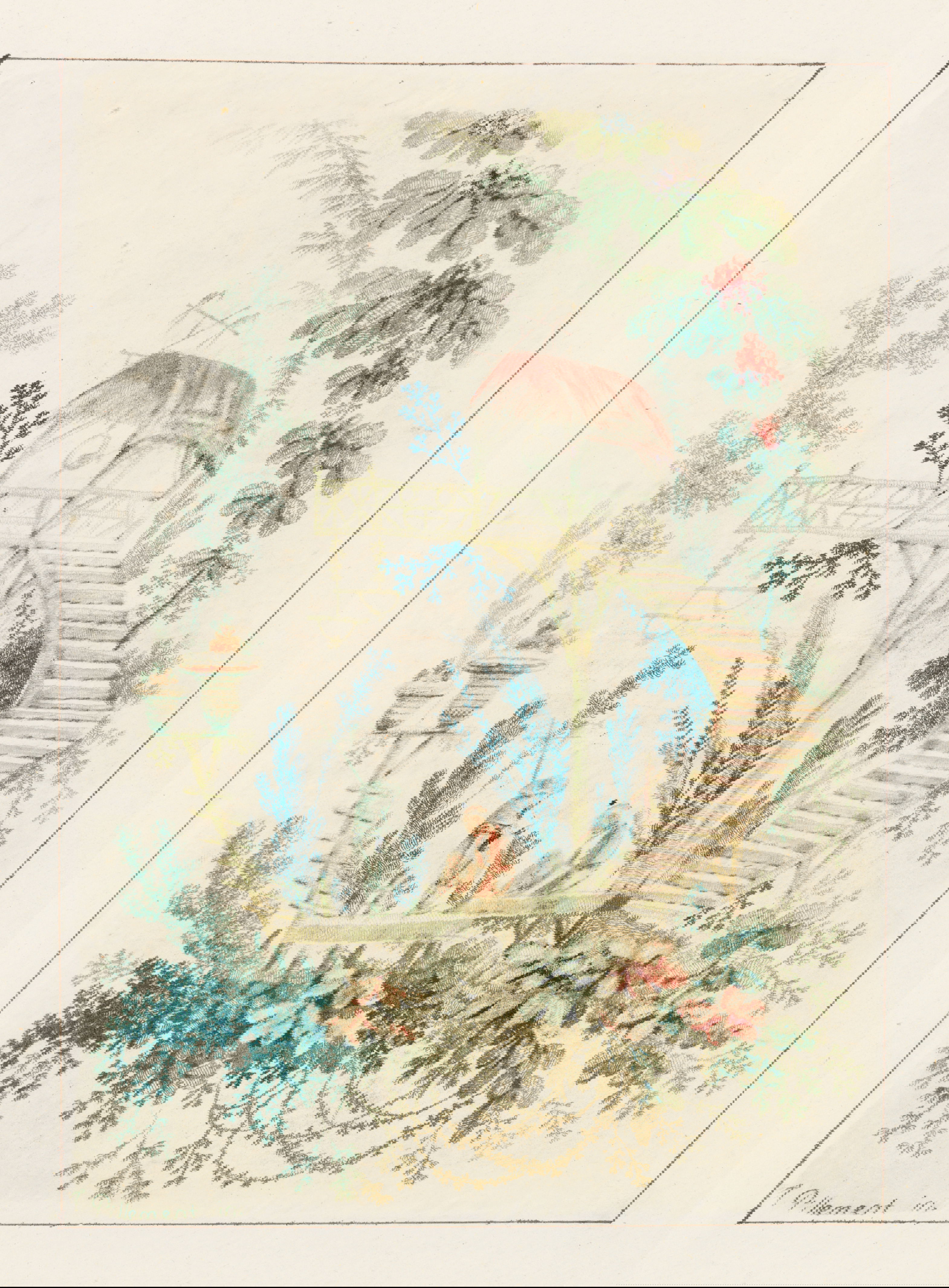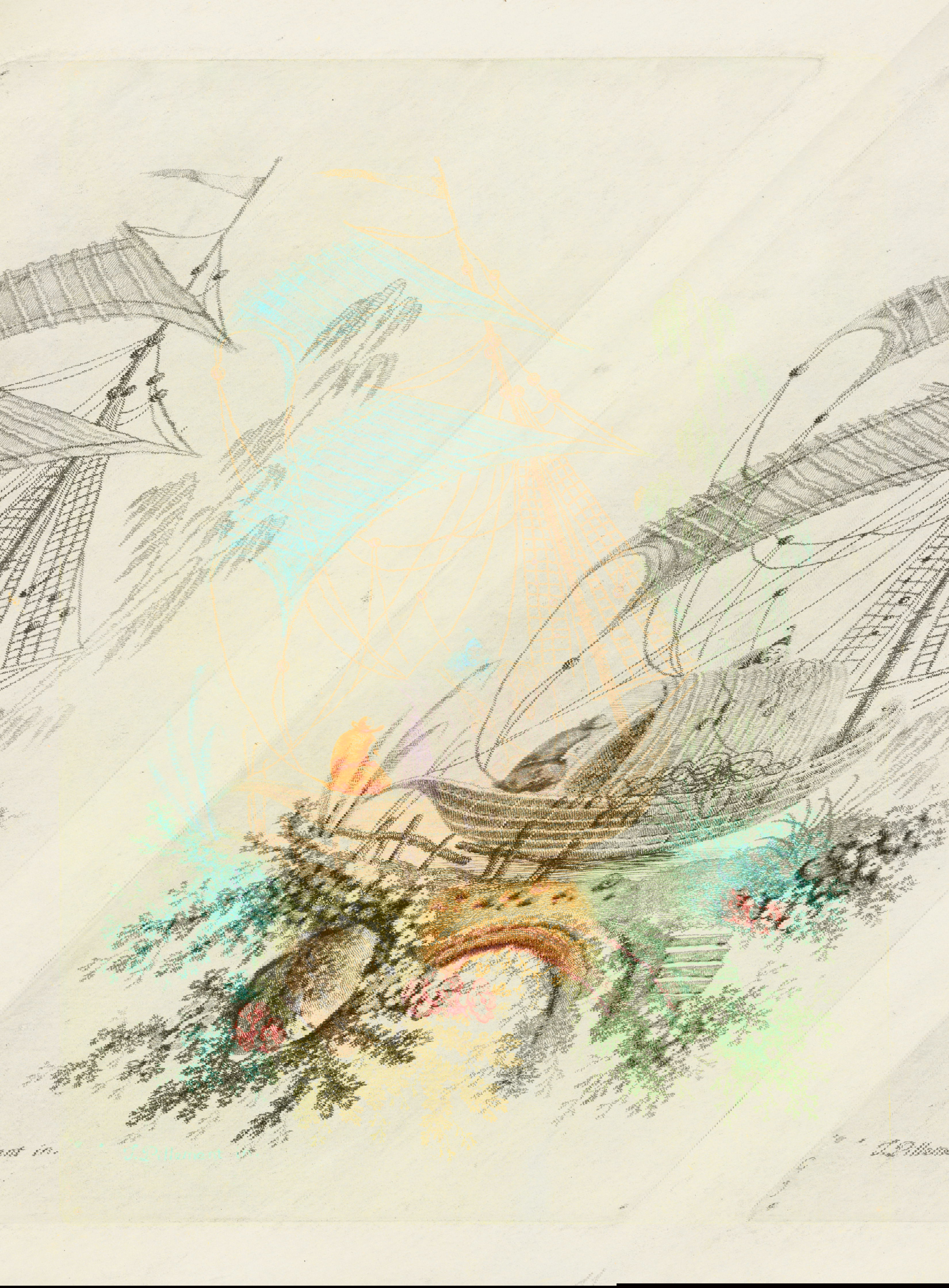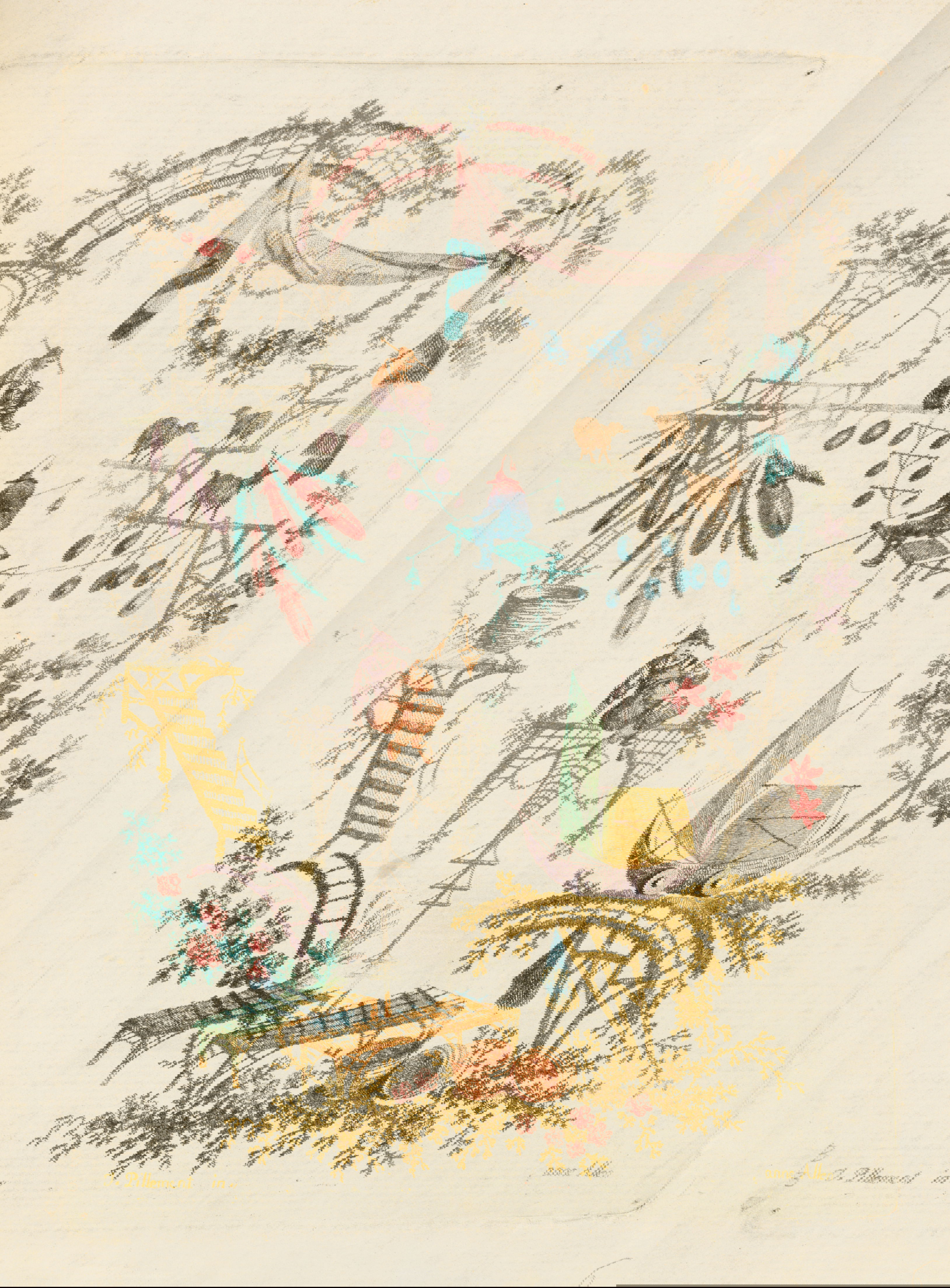 Gravity is an intermittent force in Jean-Baptiste Pillement’s designs for “New Suite of Chinese Arabesques”, etched by his wife, Anne Allen. Festoons drape and fishing lures drop within floral microcosms populated by tiny Orientalized figures and fantastical, Boschian critters. But the architectural structures — stairs, pagodas, pavilions, and bridges — seem enchanted, hovering in air or perching improbably on frothy foliage. The garden settings themselves, loosely framed by fantastical botany, float above, or beyond, our own grounded reality. Pillement’s knack for creating visual confections that facilitate intellectual and aesthetic escape sustained his success as a designer and proponent of the rococo decorative idiom, which he popularized far beyond its native France.